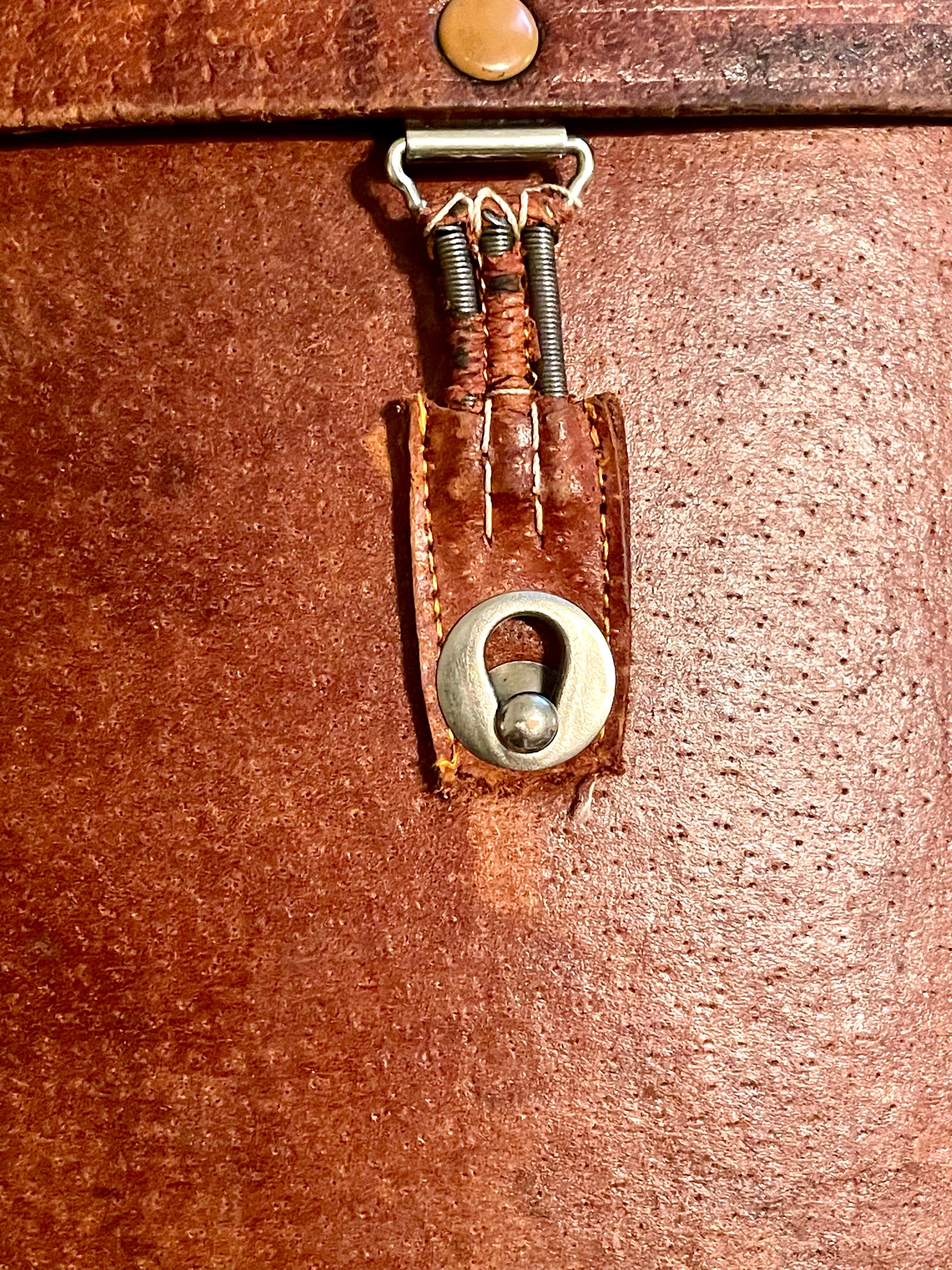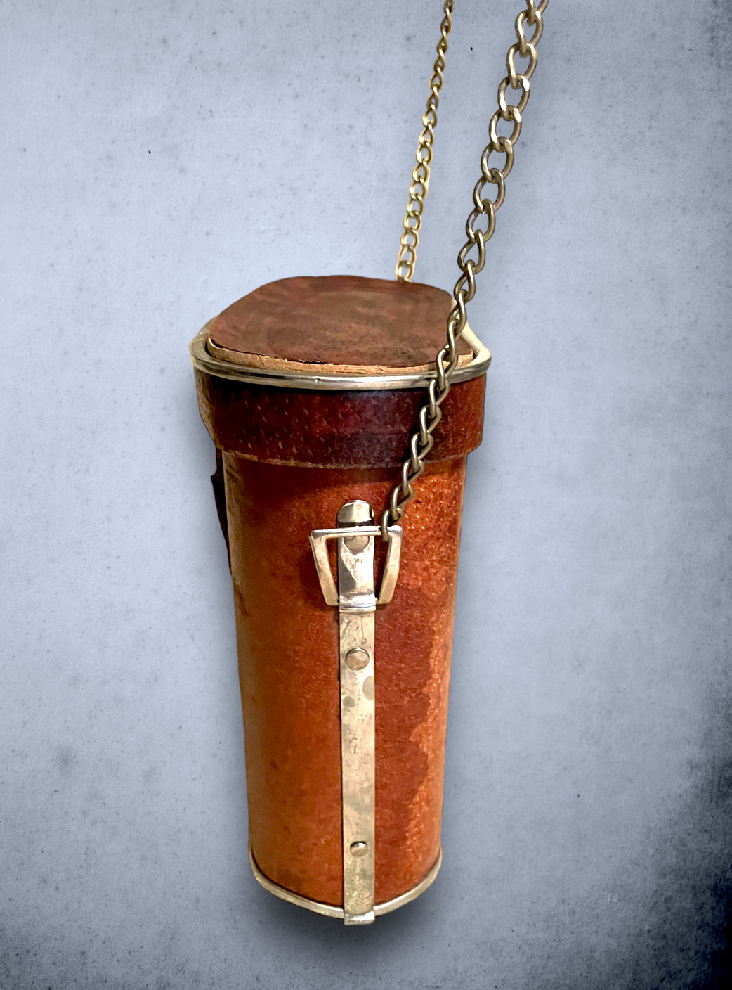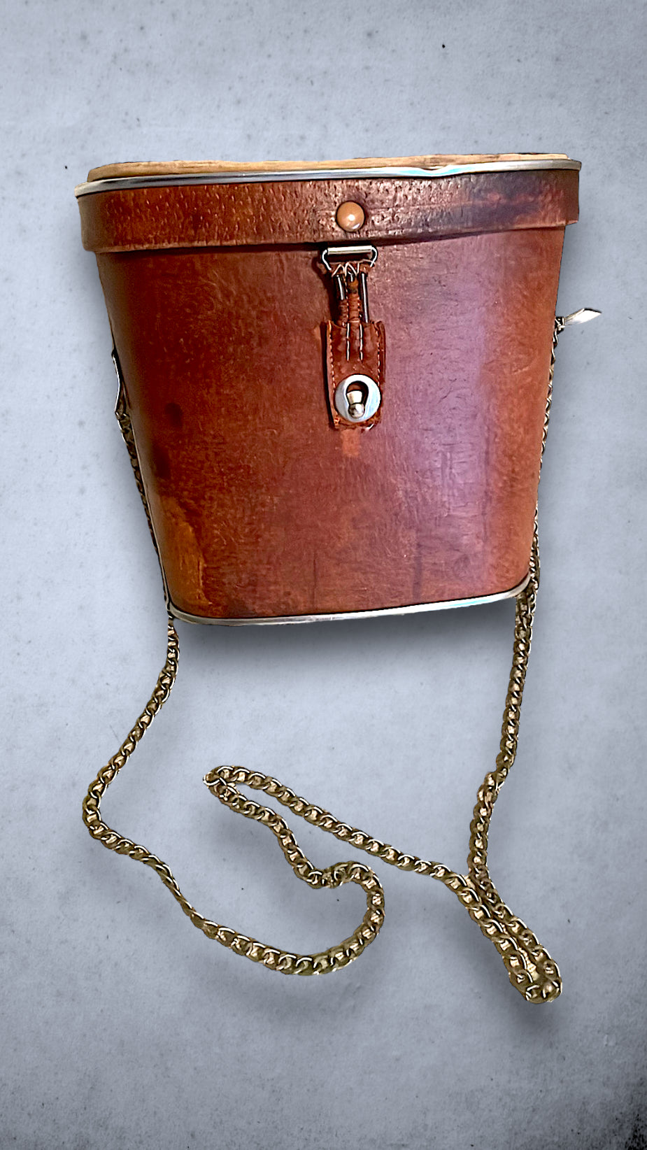 Very cute brown leather vintage binoculars case that has been converted to a purse. Brass metal trim and chain and red velvet inside lining. Closure is a hook and eye style with static strap to secure. Has some discoloration areas of the leather but just adds to the vintage look.