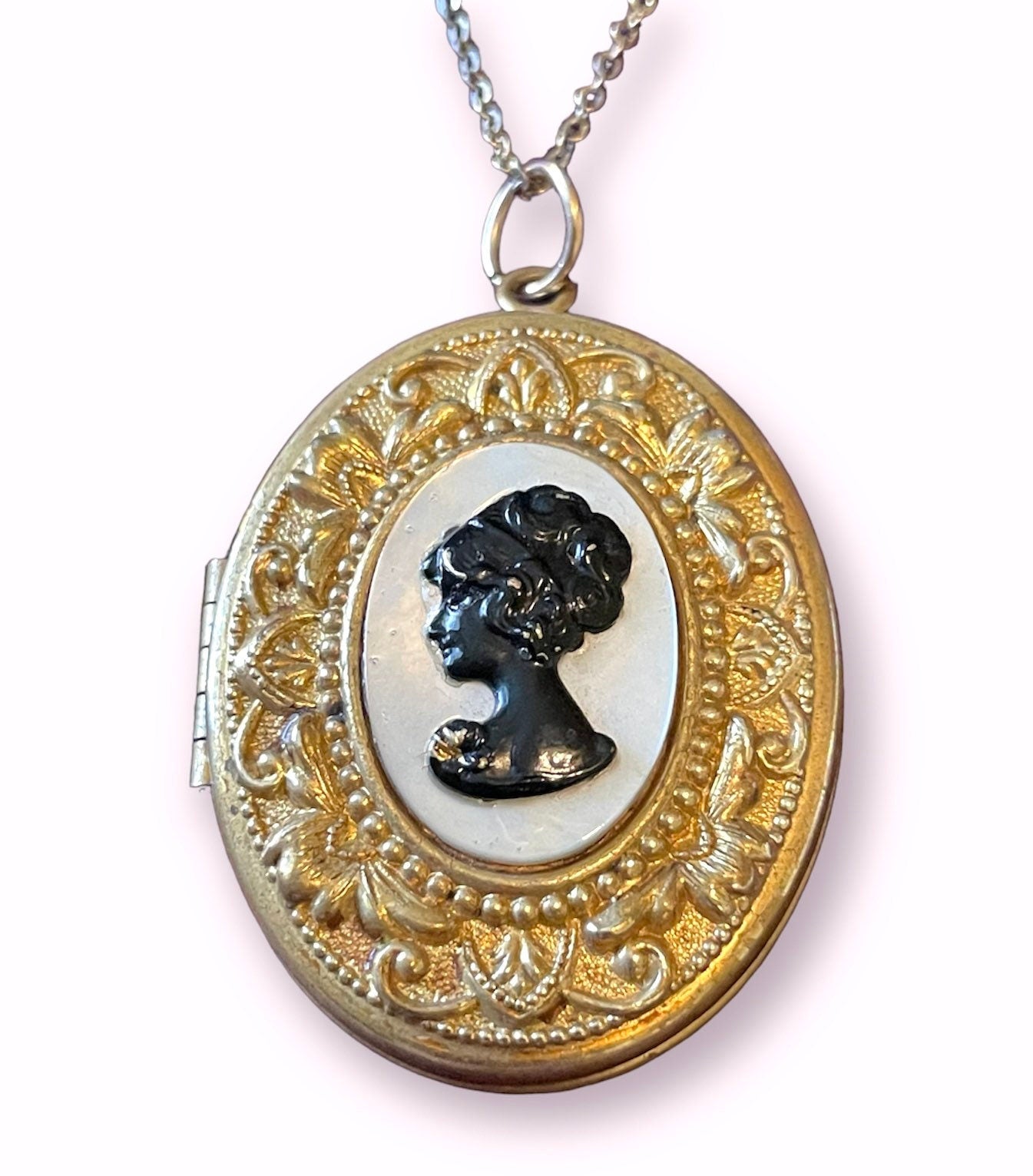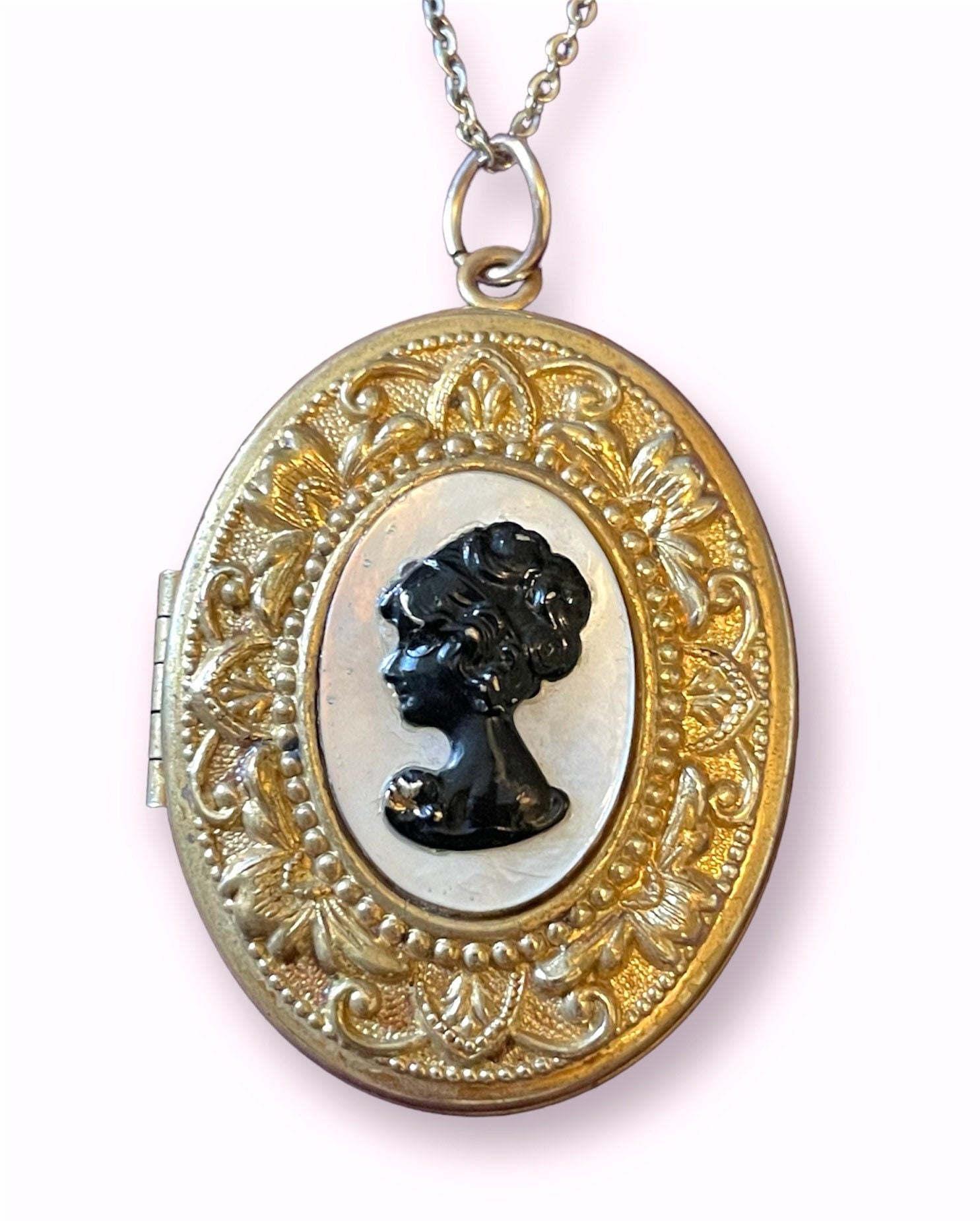 Beautiful gold embossed locket with mother of pearl and molded black cameo on a gold chain.