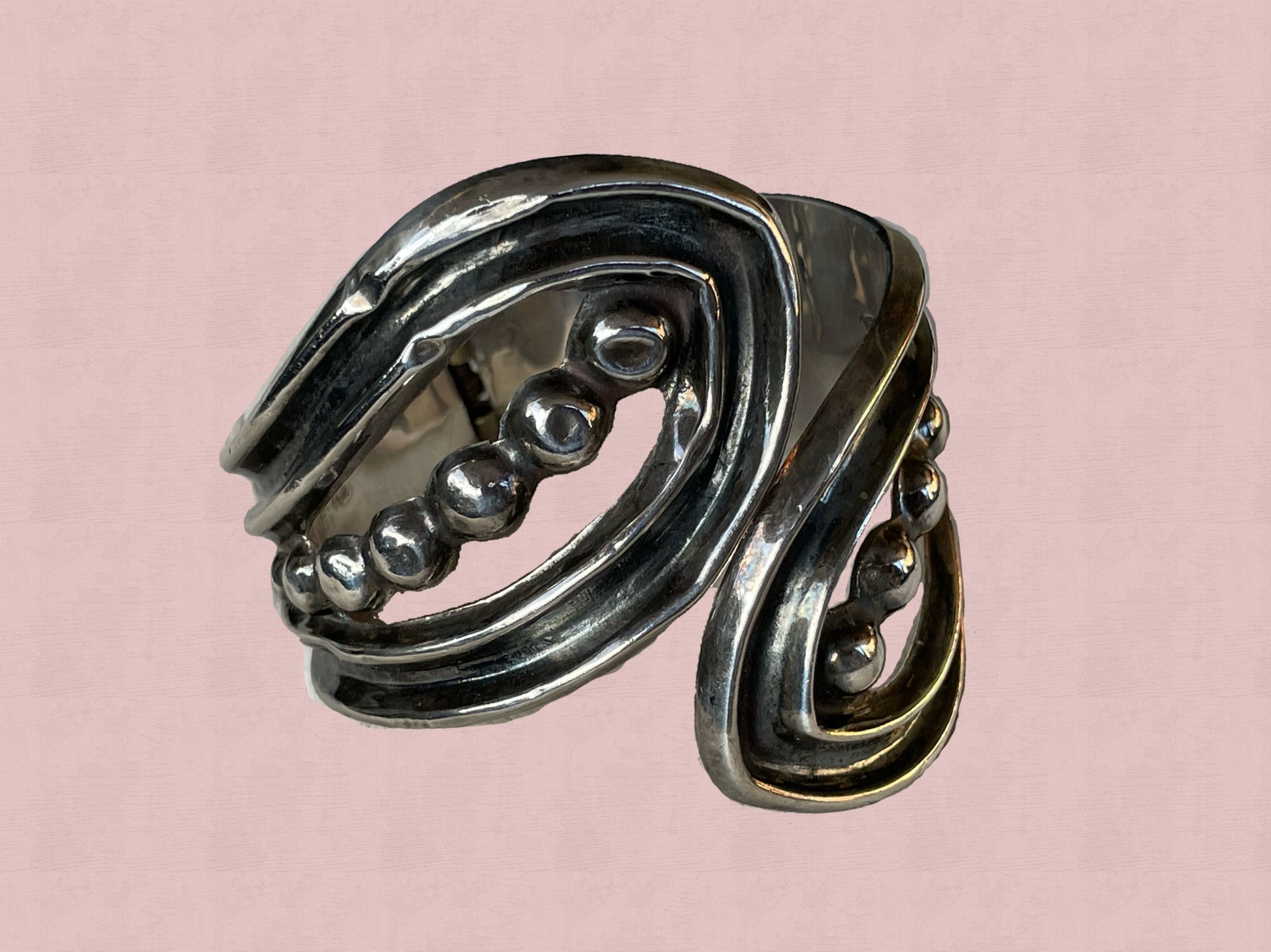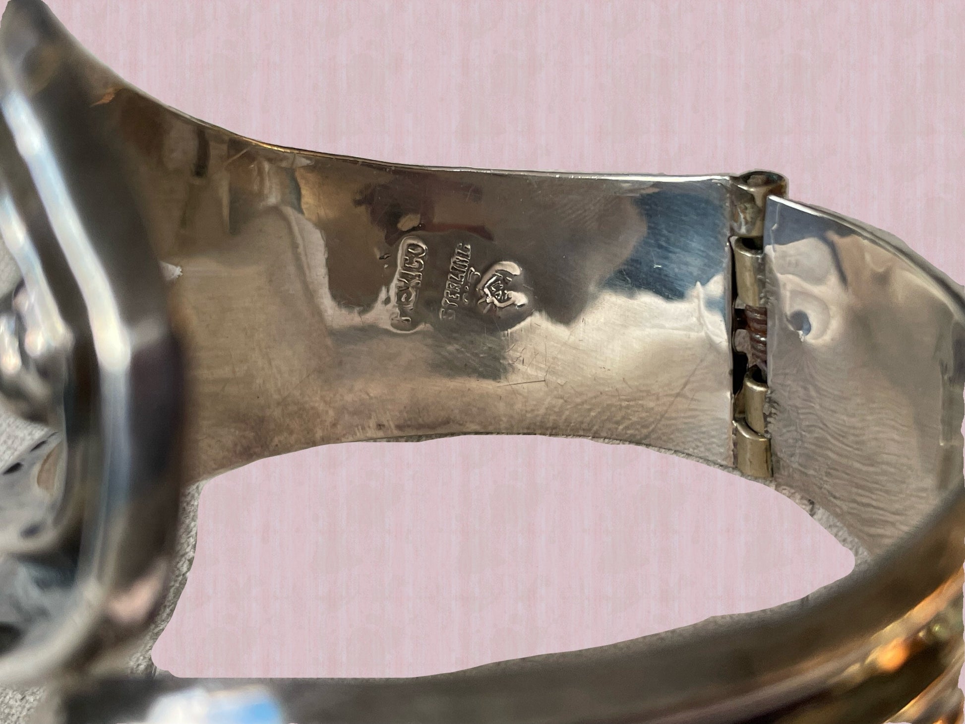 Beautiful repoussé hand formed hollow work hinged bangle bracelet. Intricate and beautiful design, made in Mexico, designer signed and stamped. Hinge is in very good and secure condition.