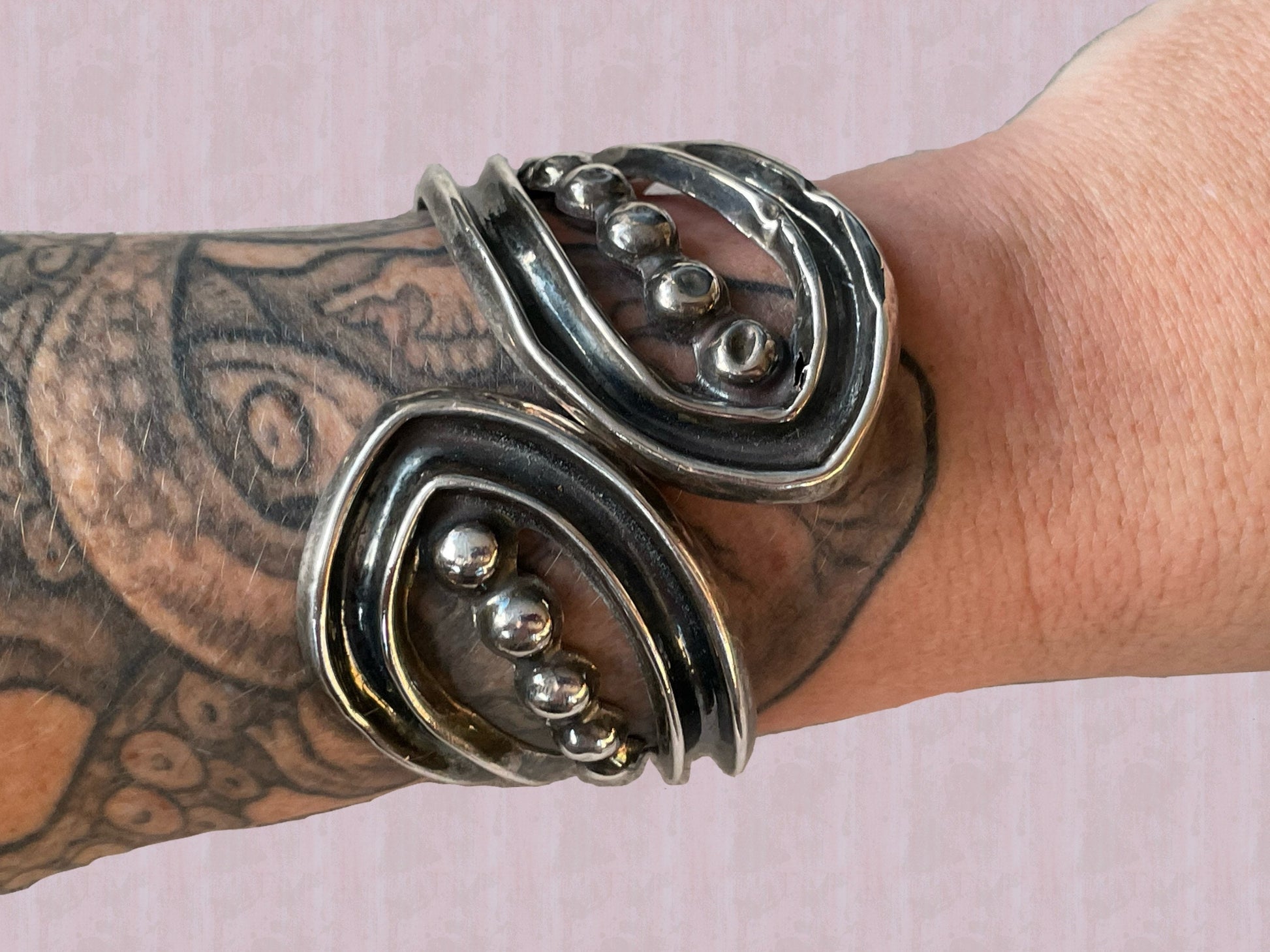 Vintage Sterling Silver Mexican Repoussé Hinged Clamper Bangle Bracelet