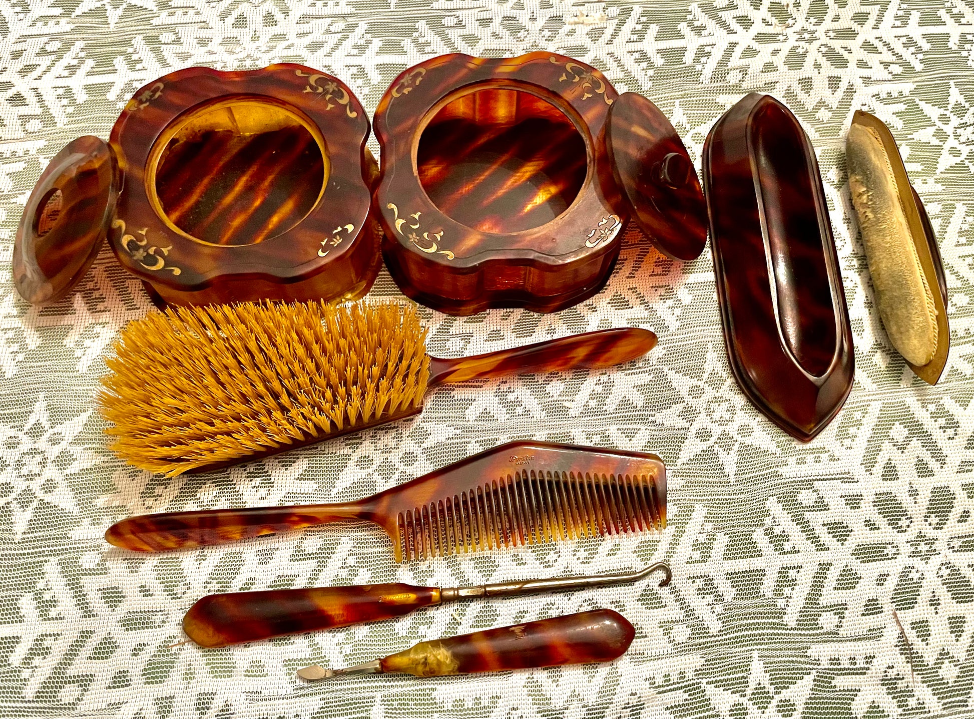 1920’s La Belle Tortoise Shell Pyralin Celluloid 7 pcs Vanity Set: Hand Mirror, Hair Brush & more