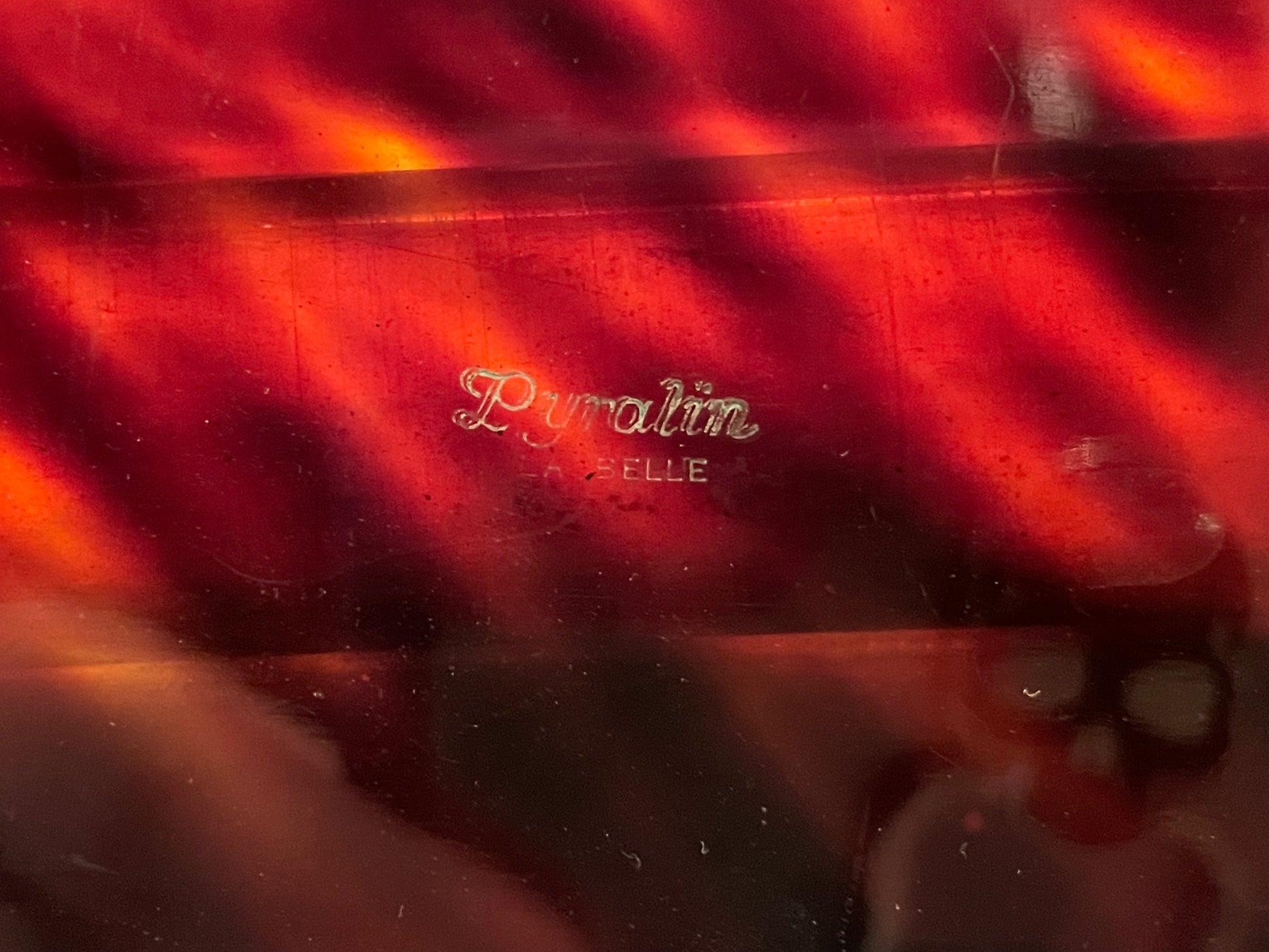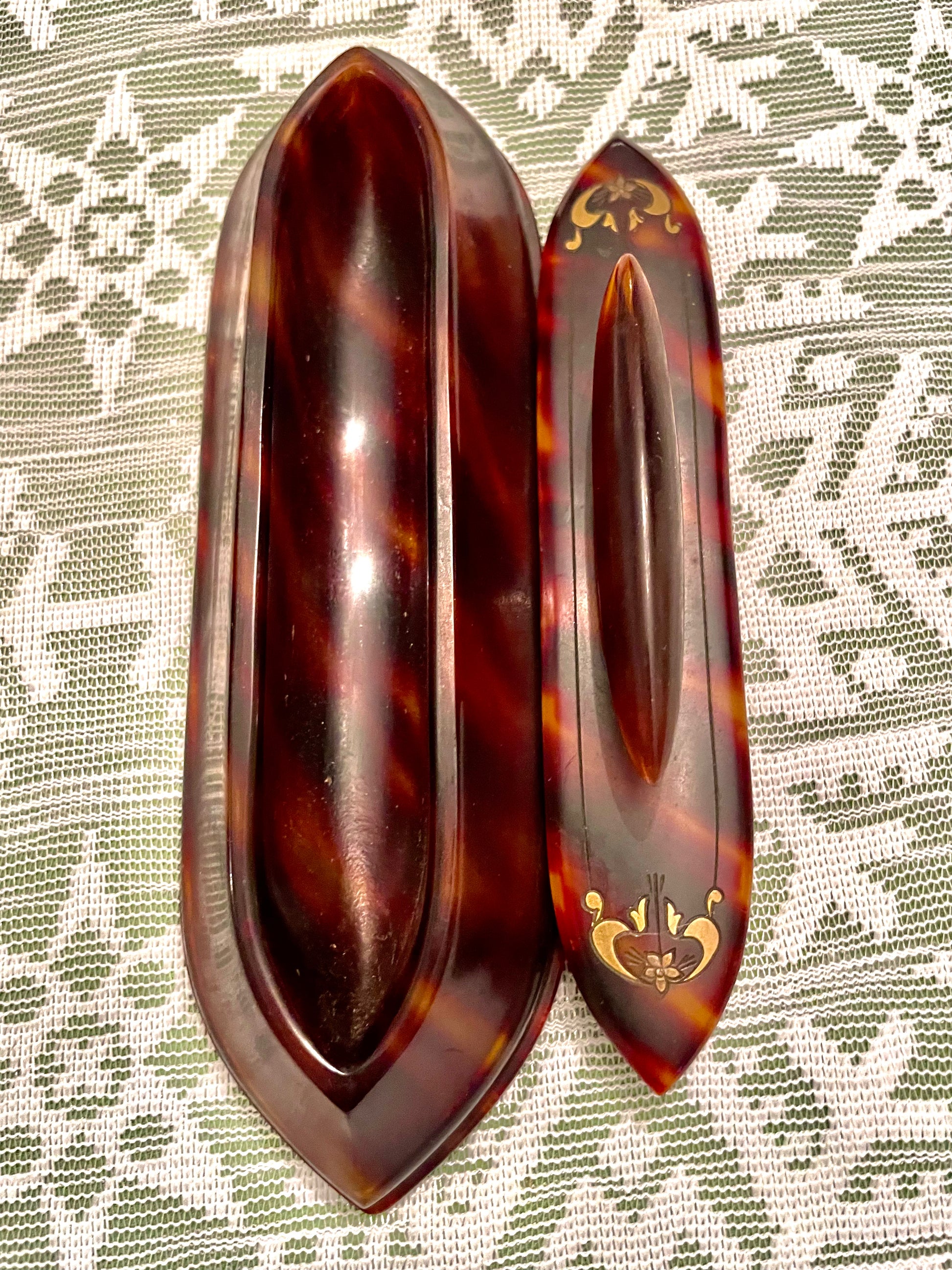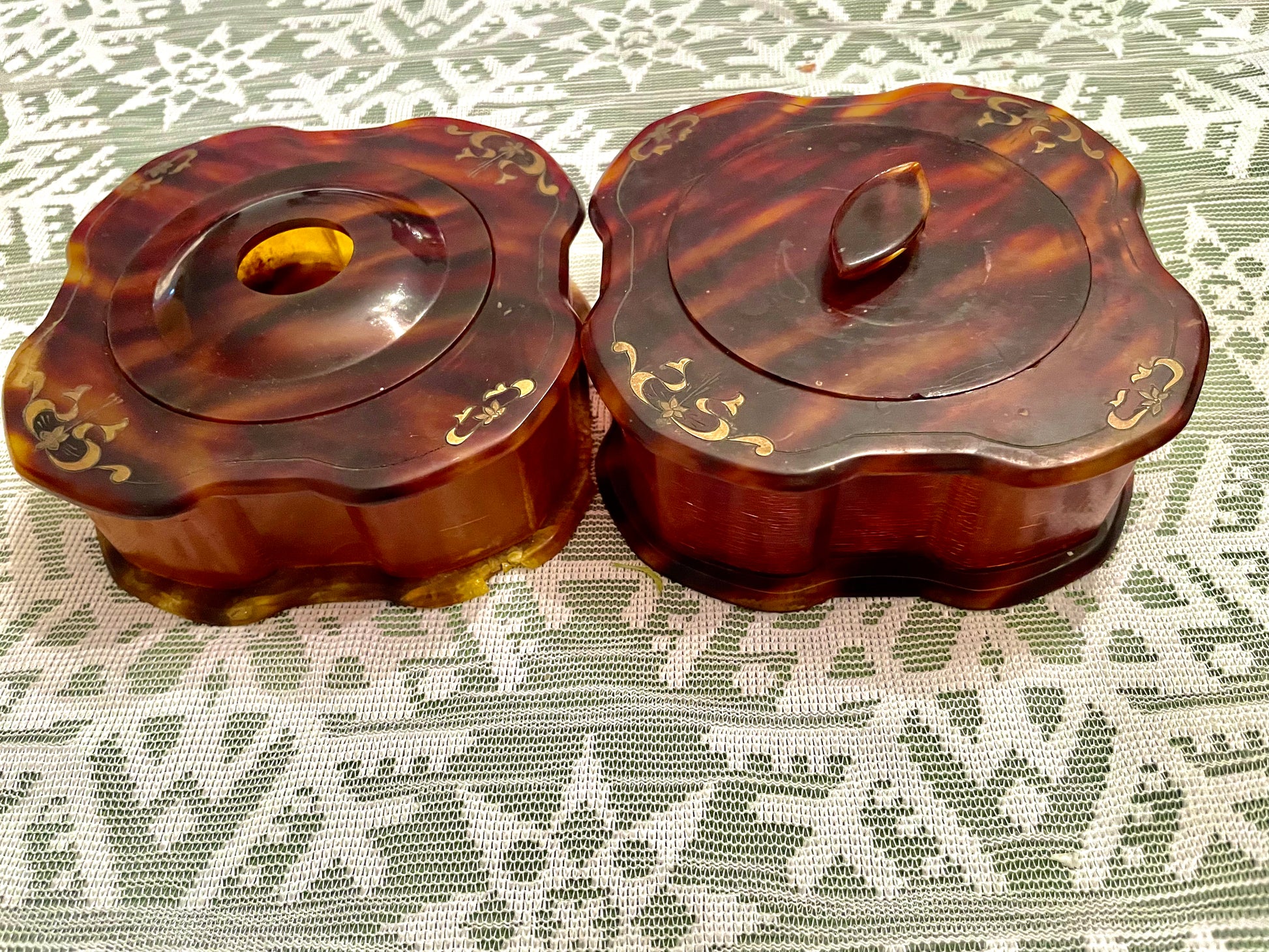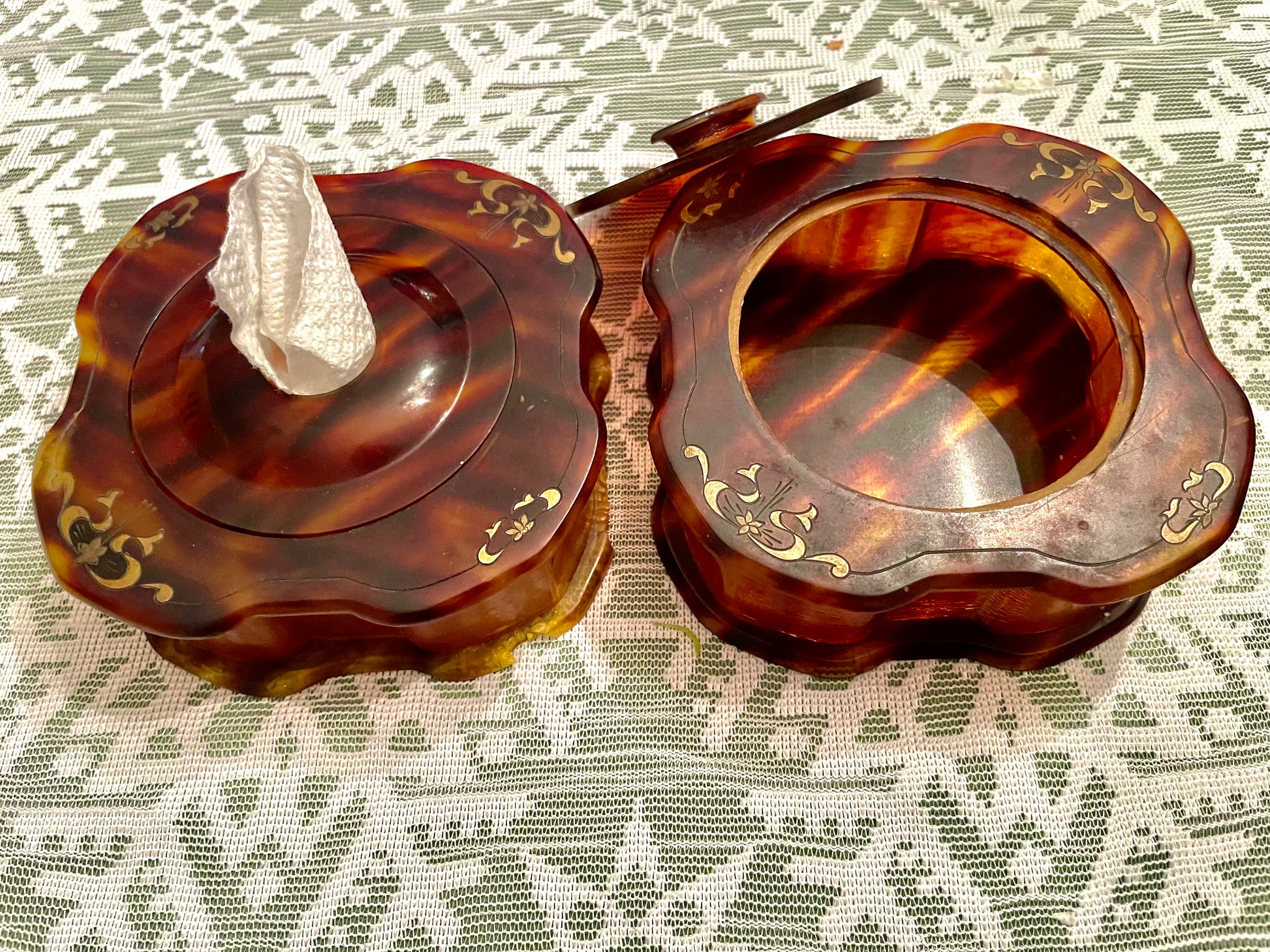 Amazing 1920’s antique La Belle Shell Pyralin celluloid faux tortoise shell vanity set.  Stamped on bottom with La Belle (maker) and Pyralin (high end plastic similar to celluloid) this is a highly sought after set that has beautiful gold flourish detailing on all pieces.  7 piece set including hand mirror, hair brush, tissue box with removable lid, trinket box, nail buffer with holder, comb, boot lacing hook & nail cleaning tool.  Set is in amazing condition and I even found an advertisement from 1921 for the same set shown in photos.