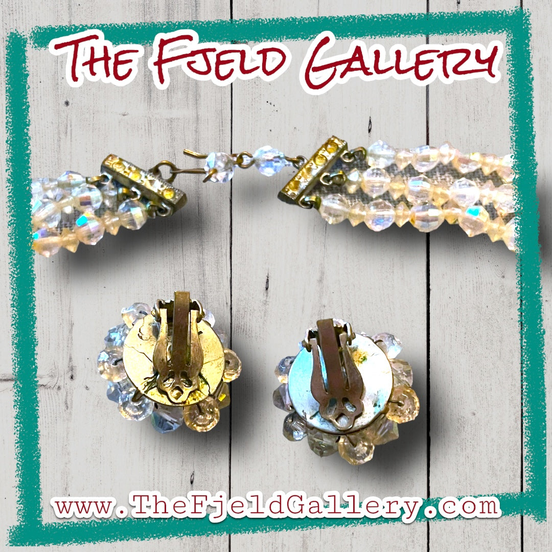 1950’s Hollywood Regency Aurora Borealis Crystal 3 Strand Necklace & Earring Set
