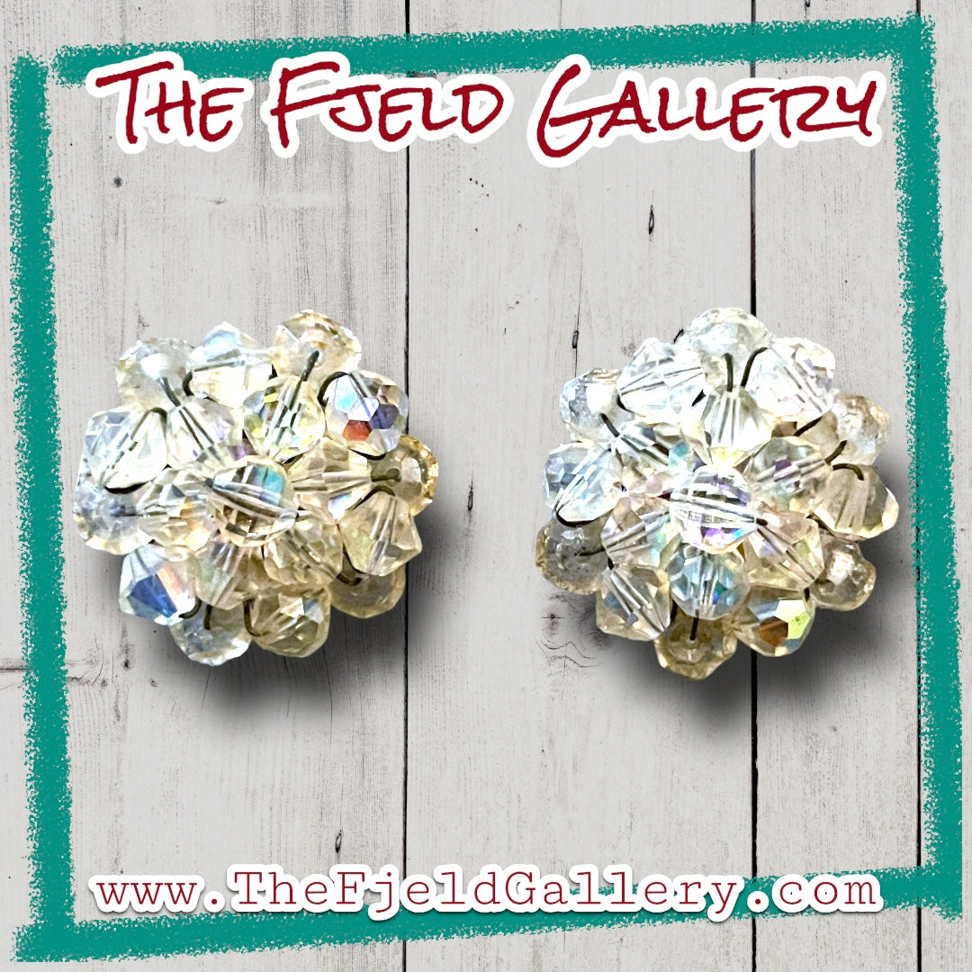 Gorgeous sparkling 1950’s Hollywood Regency 3 strand necklace and earring set made of graduated faceted Aurora Borealis crystal beads. Necklace has a hook and eye style clasp and earrings are clip on. Earrings can be altered to pierced post at buyers request and necklace can have an extension added to make longer.