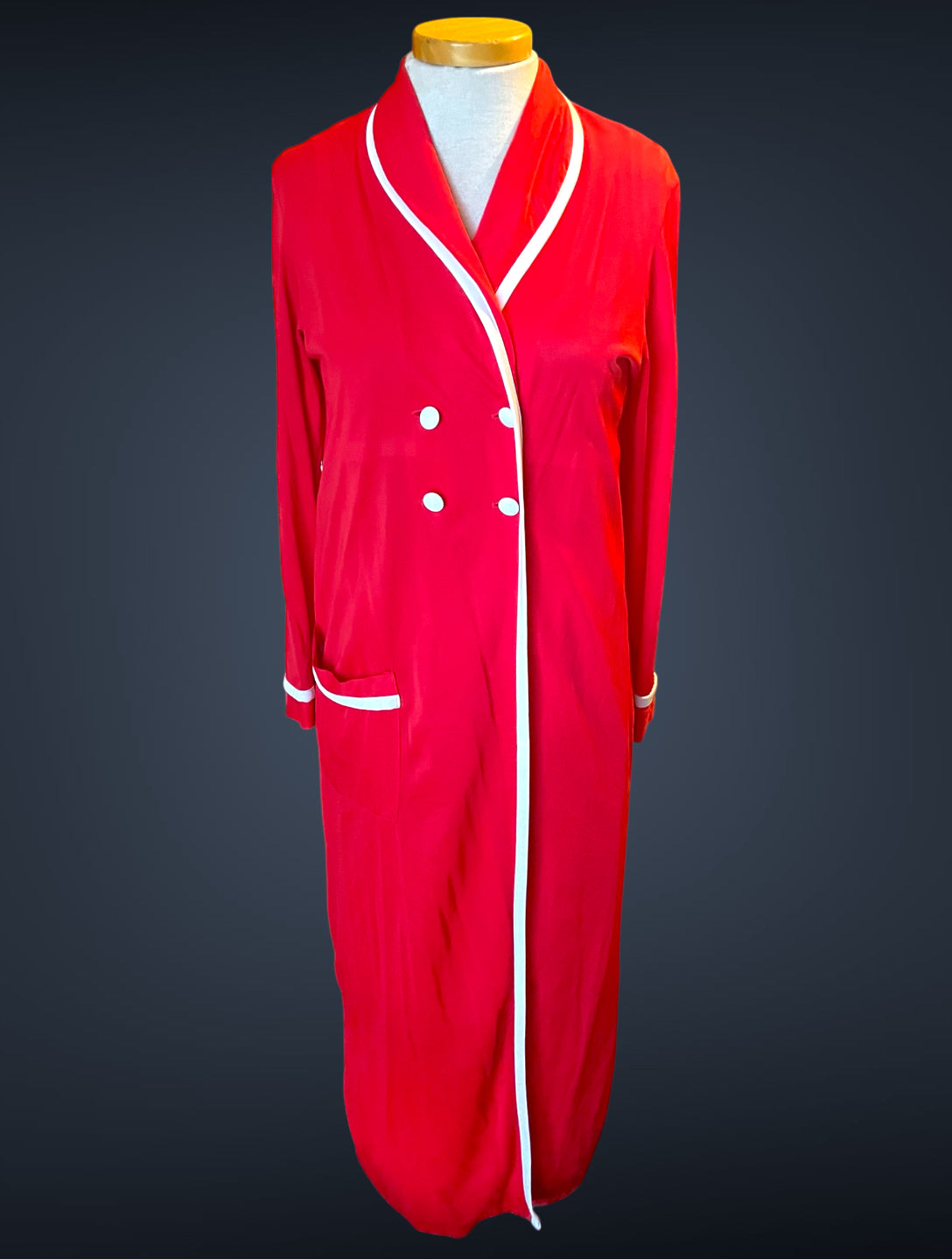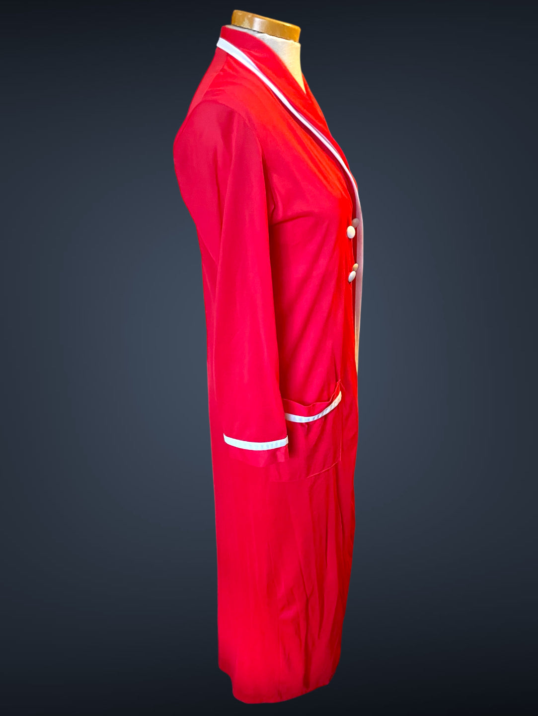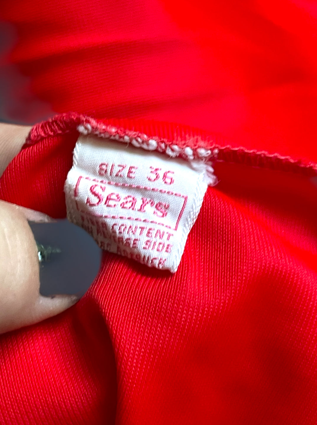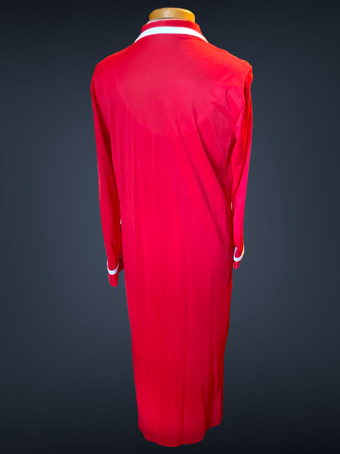 Super cool and mod vintage Sears & Robuck red nylon tank top, floor length night gown with white trim and buttons with a matching robe with a rounded fold over collar and double breasted buttons with a pocket on the right side. Robe is alap detailed with white piping.  In near perfect condition so as I can see!  Tags say “Sears & Robuck, Size 36, 100% Nylon”.  Fabric is soft and has some stretch to it.