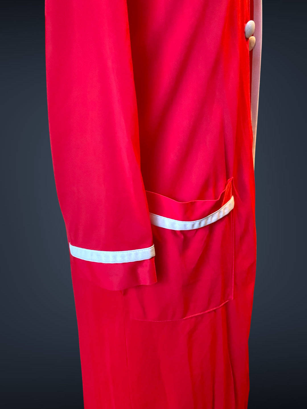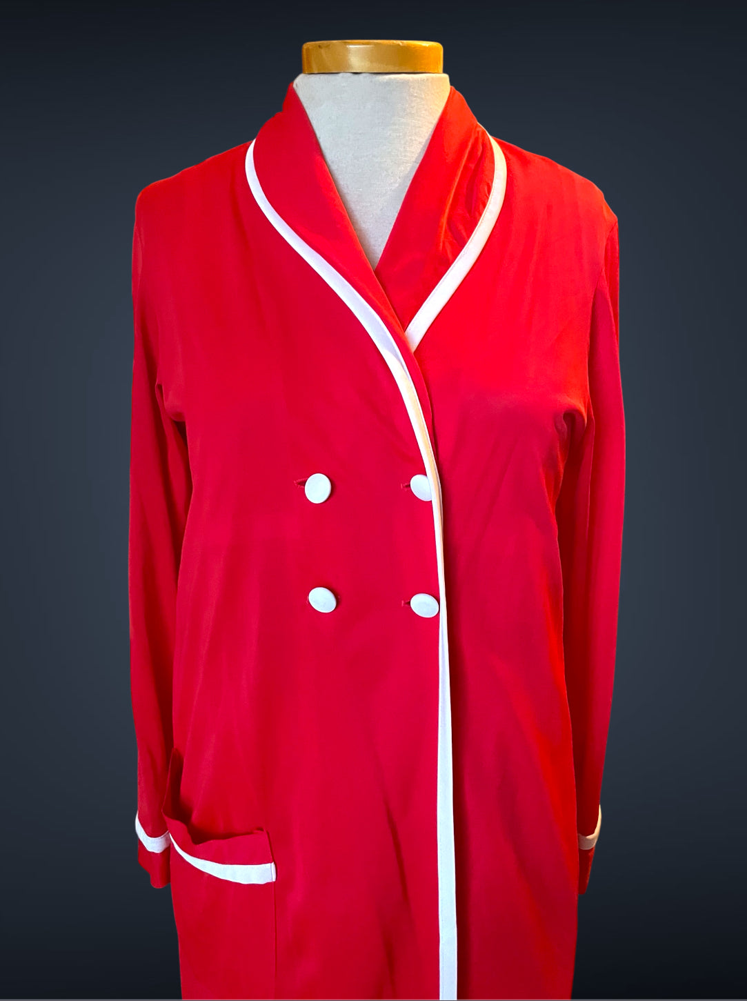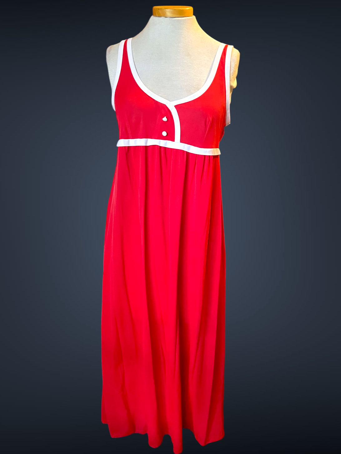 Super cool and mod vintage Sears & Robuck red nylon tank top, floor length night gown with white trim and buttons with a matching robe with a rounded fold over collar and double breasted buttons with a pocket on the right side. Robe is alap detailed with white piping.  In near perfect condition so as I can see!  Tags say “Sears & Robuck, Size 36, 100% Nylon”.  Fabric is soft and has some stretch to it.