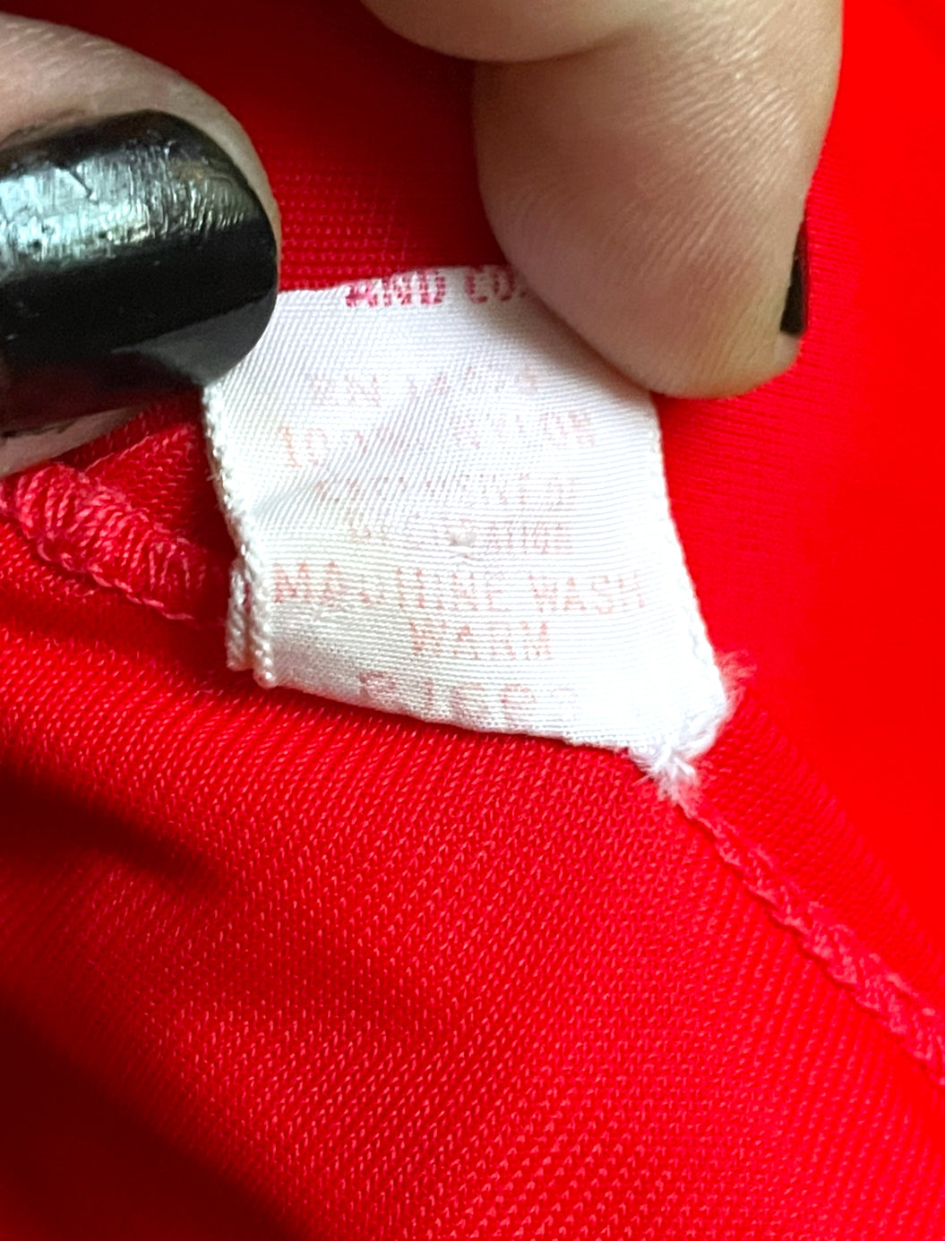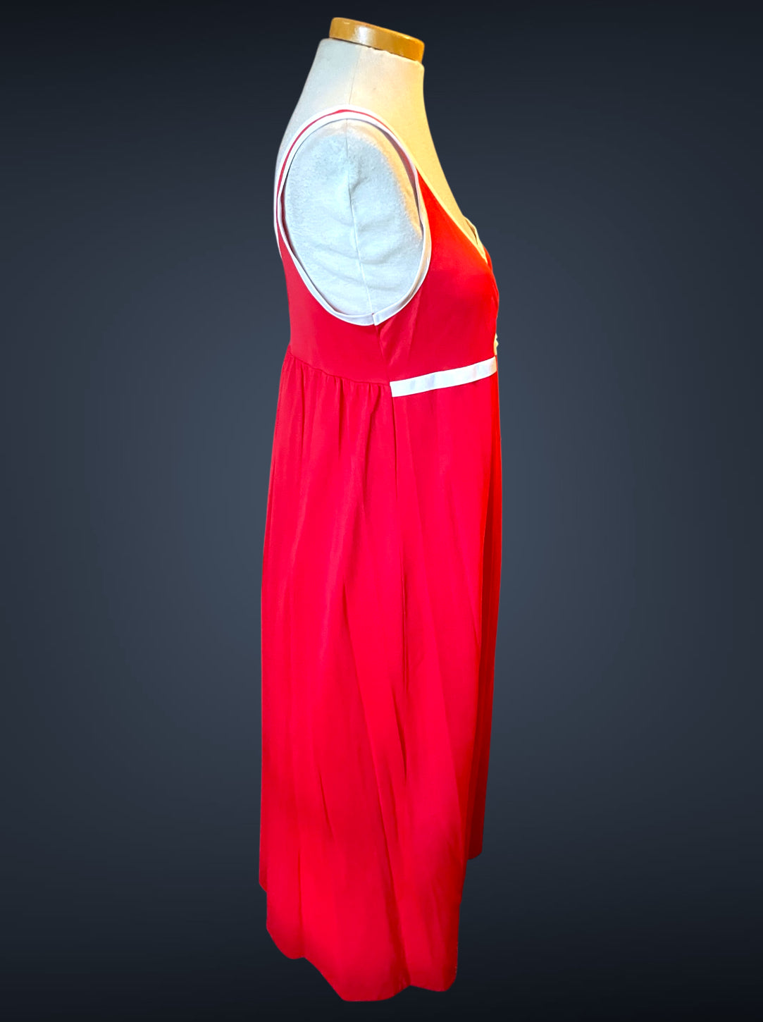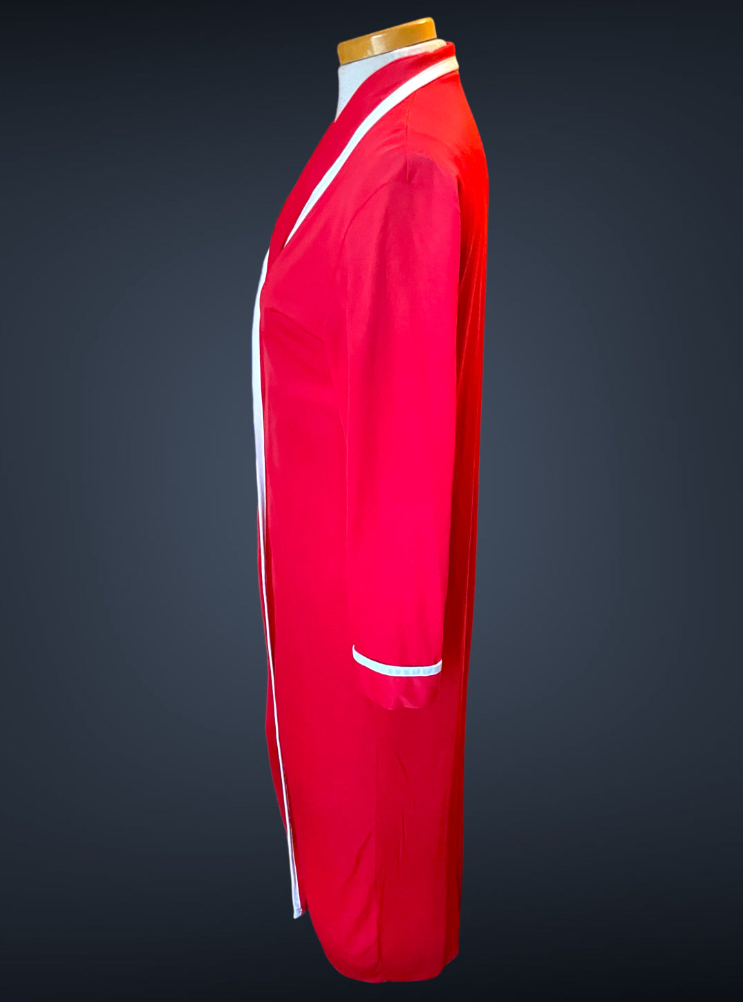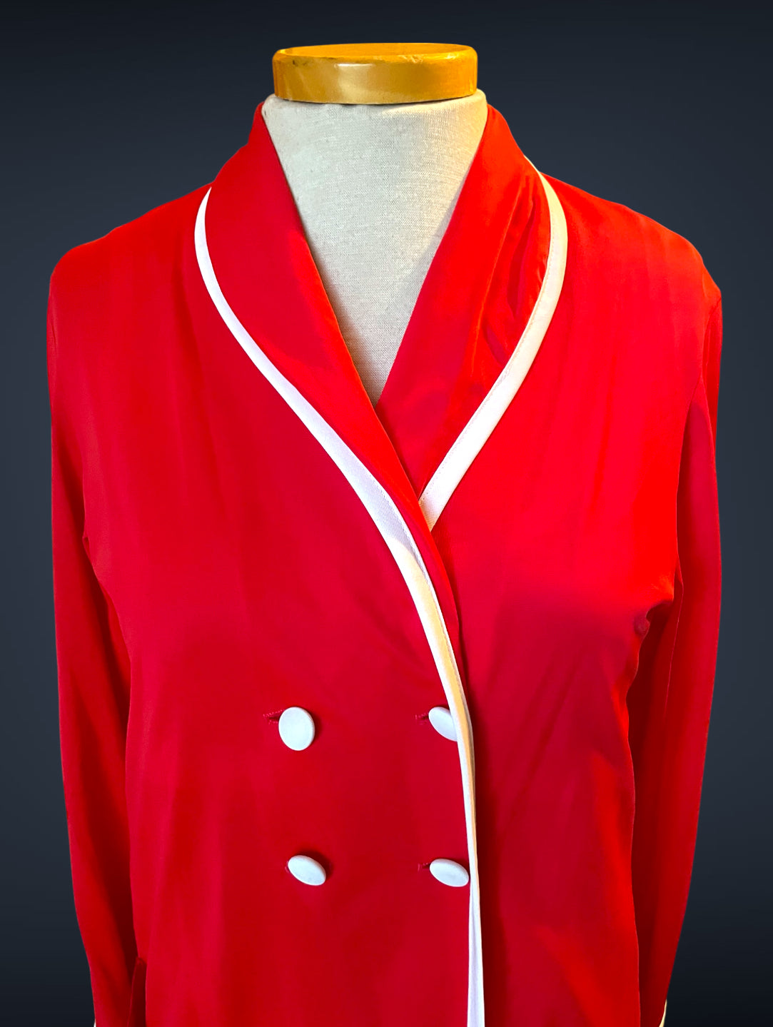 Super cool and mod vintage Sears & Robuck red nylon tank top, floor length night gown with white trim and buttons with a matching robe with a rounded fold over collar and double breasted buttons with a pocket on the right side. Robe is alap detailed with white piping.  In near perfect condition so as I can see!  Tags say “Sears & Robuck, Size 36, 100% Nylon”.  Fabric is soft and has some stretch to it.