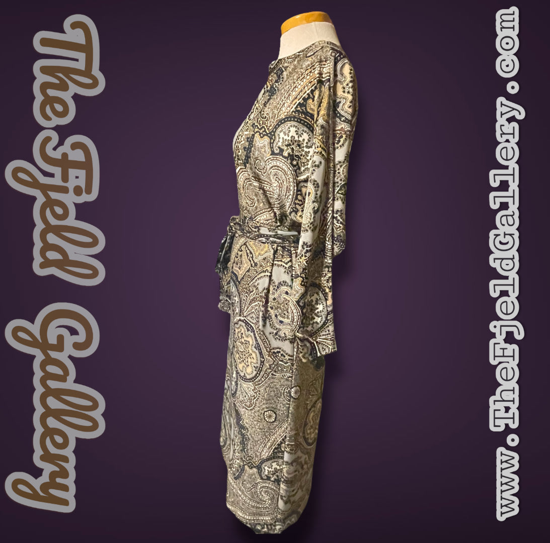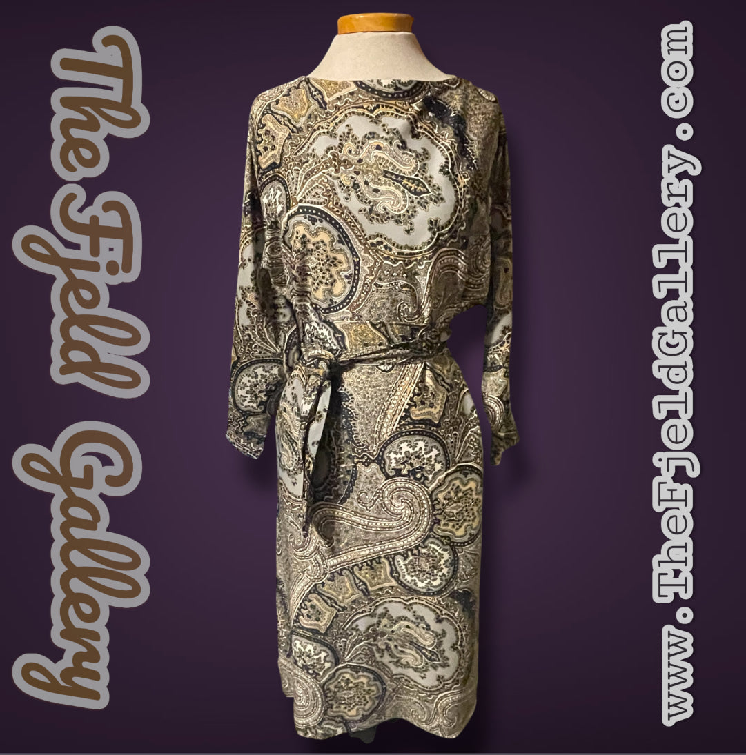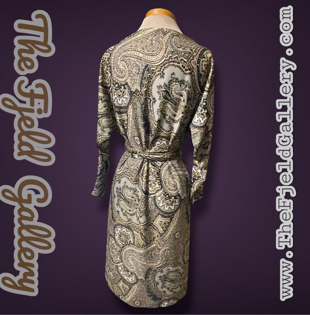 1970’s Brown, Gray, Black & White Paisley Pattern Bat Wing Belted Sheath Dress