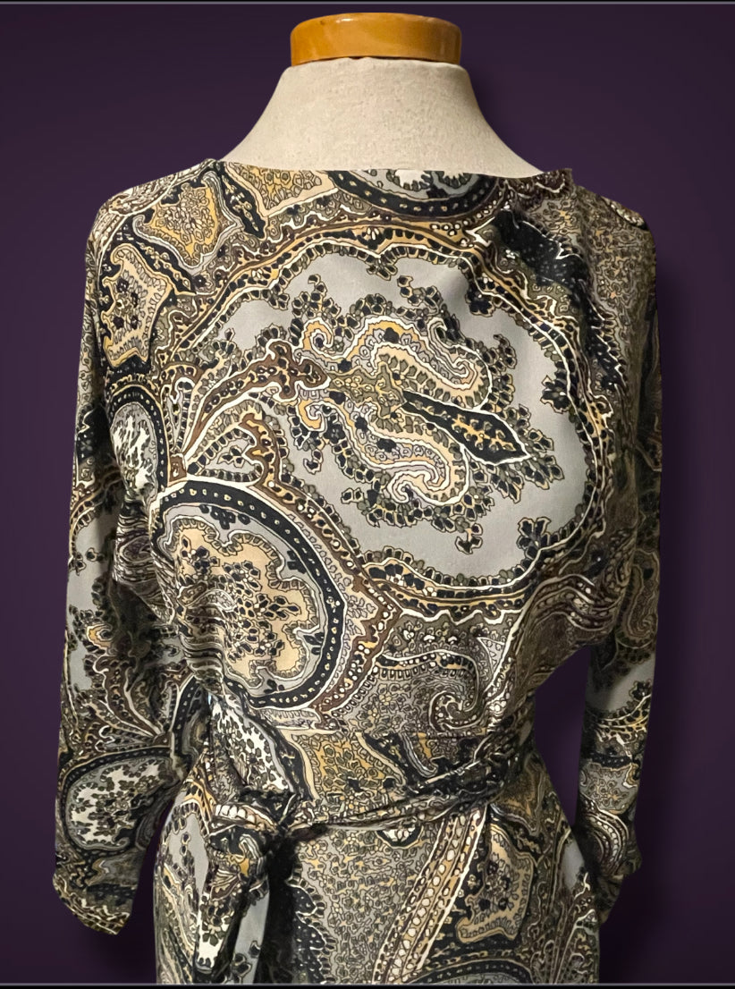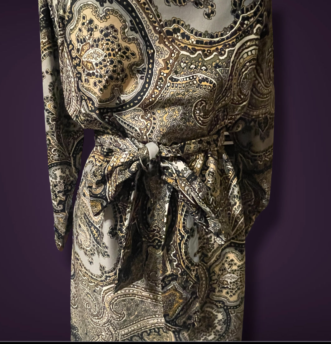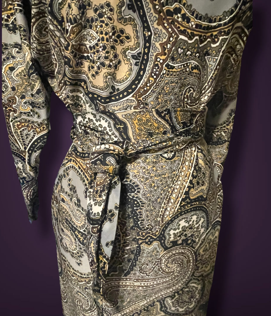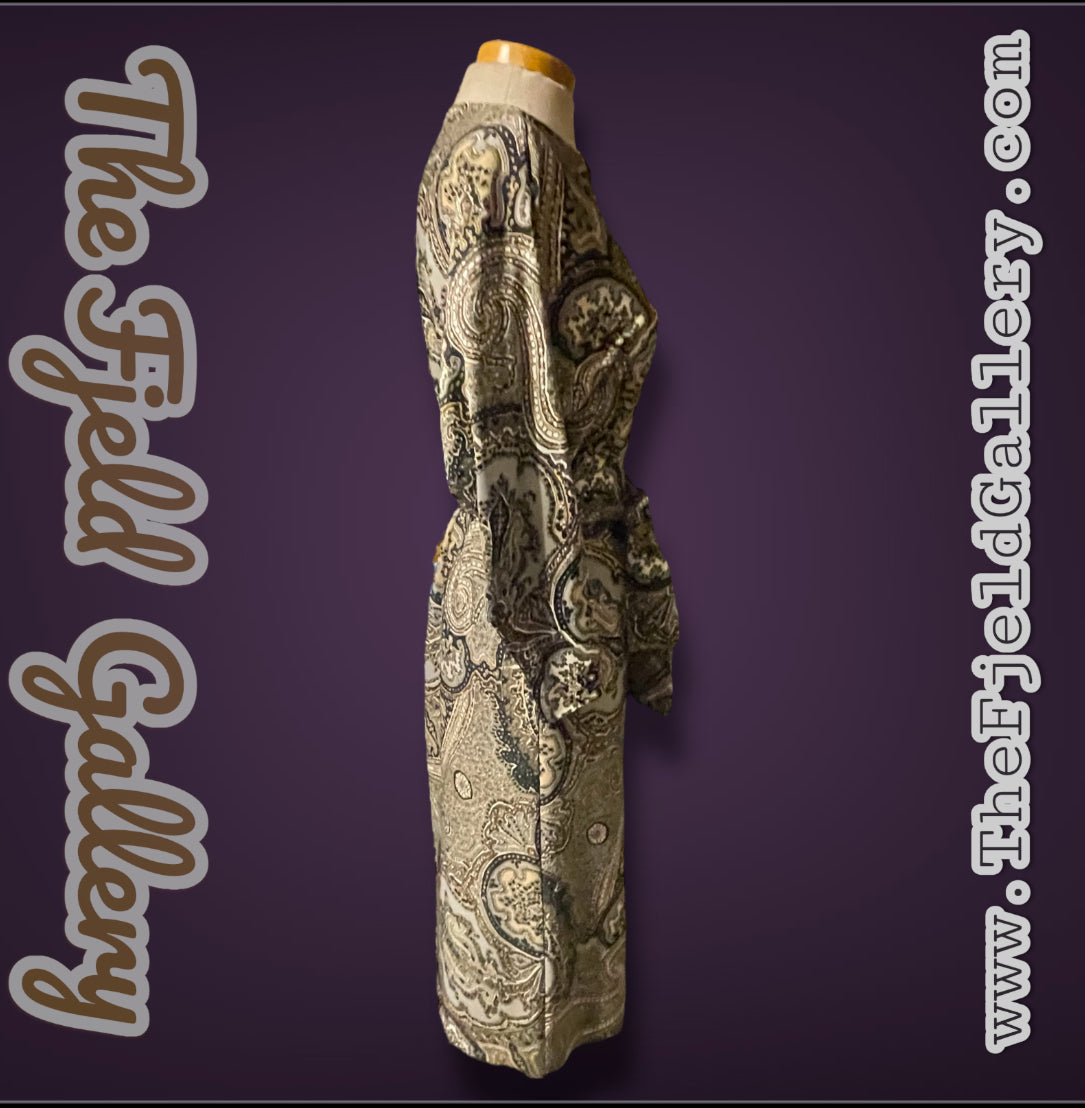 1970’s Brown, Gray, Black & White Paisley Pattern Bat Wing Belted Sheath Dress