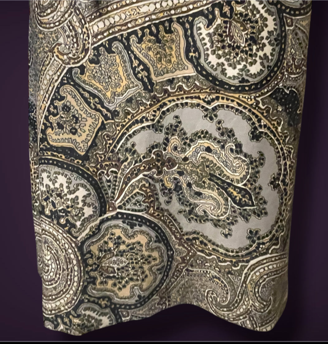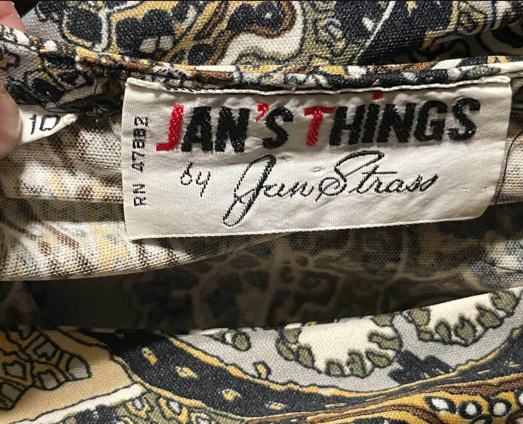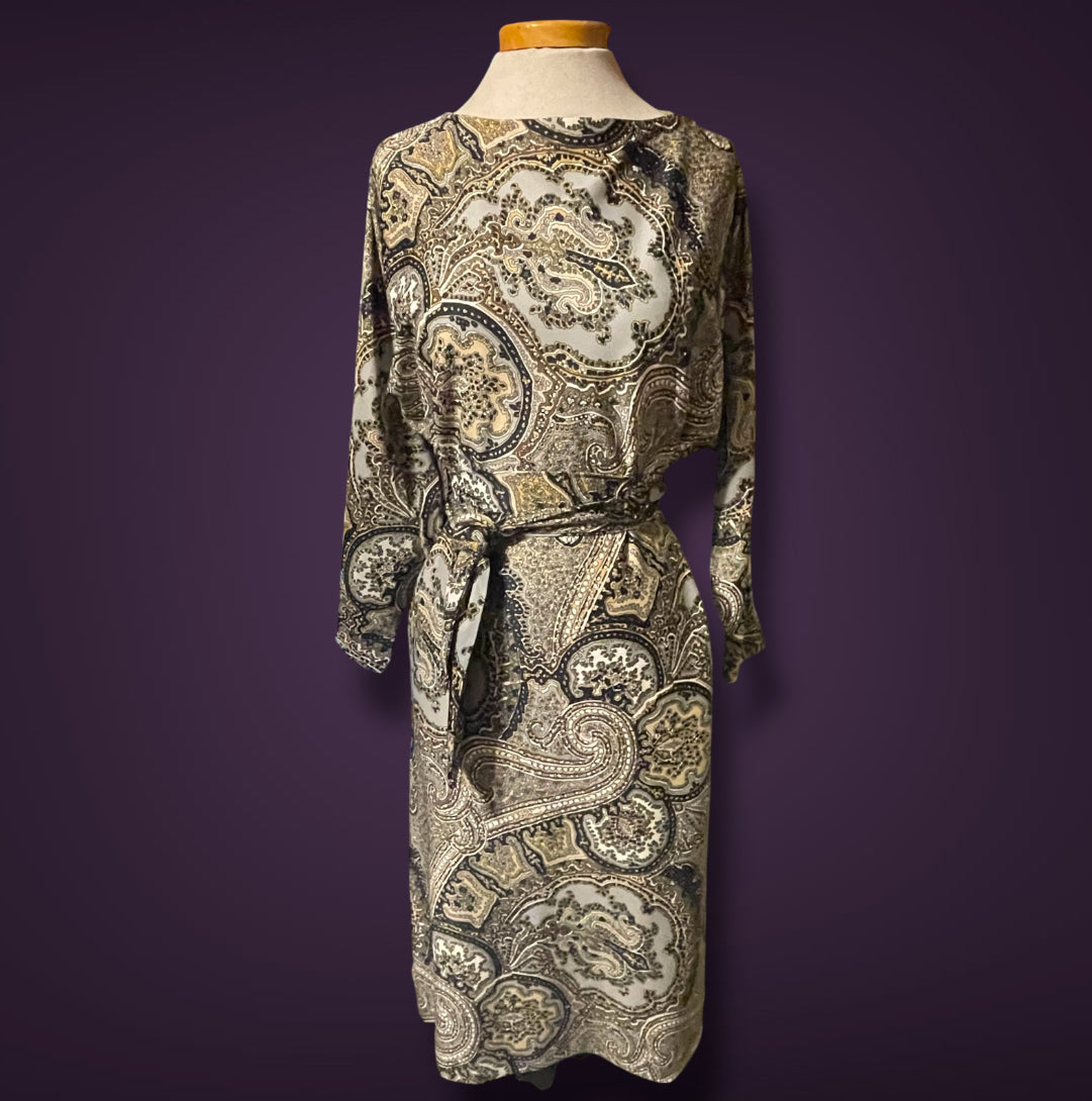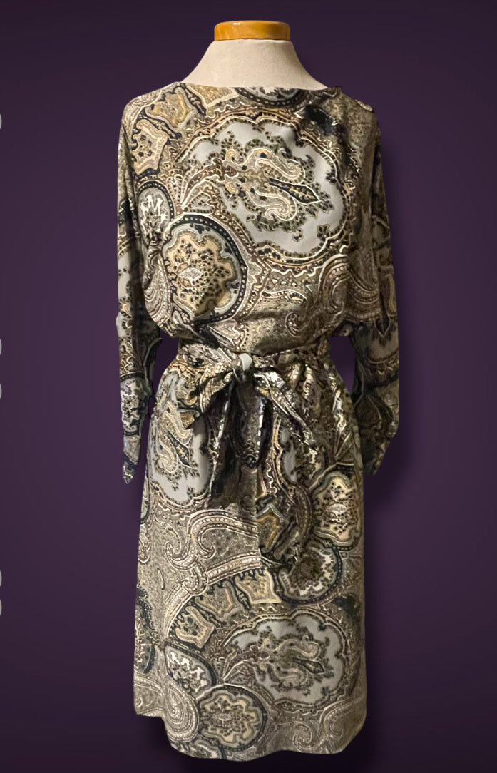 Super cool 1970’s vintage brown, tan, gray, black & white paisley pattered bat wing cut long sleeve, belted sheath dress.  Matching fabric semi wide belt or headband, however you want to wear it!  Dress is a pull over.  Has no zippers or buttons.  Tag reads “Jan’s Things by Jan Strass.” Size “10”, “Dry Clean or Handwash”.  No other tags found.  Fabric has a decent amount of stretch.  No damage at all: no stains, no rips, no tears.
