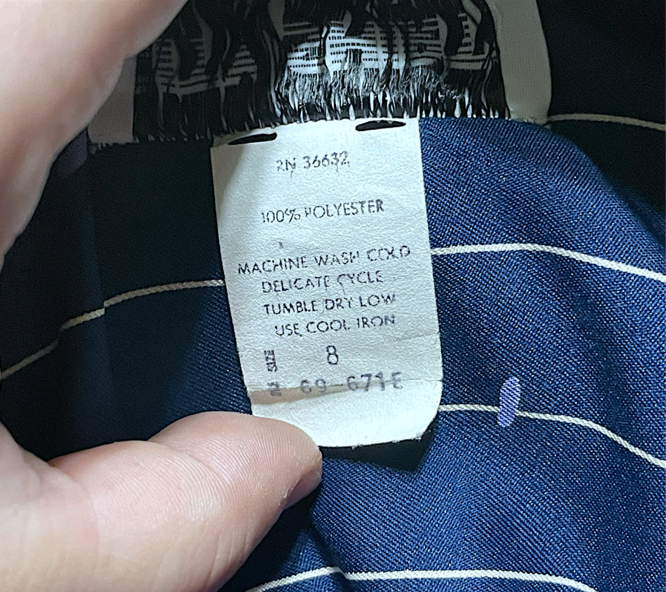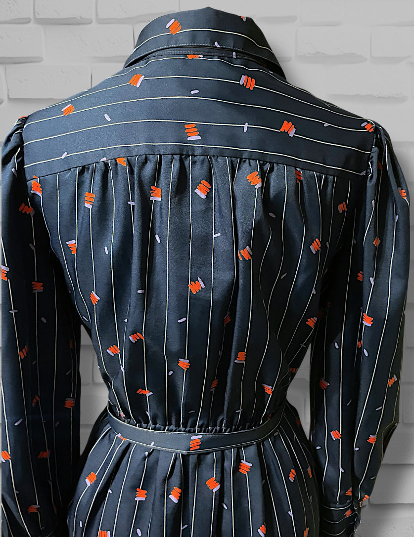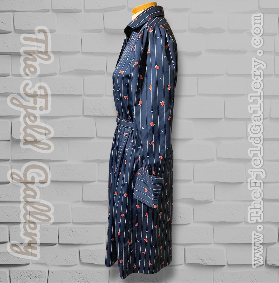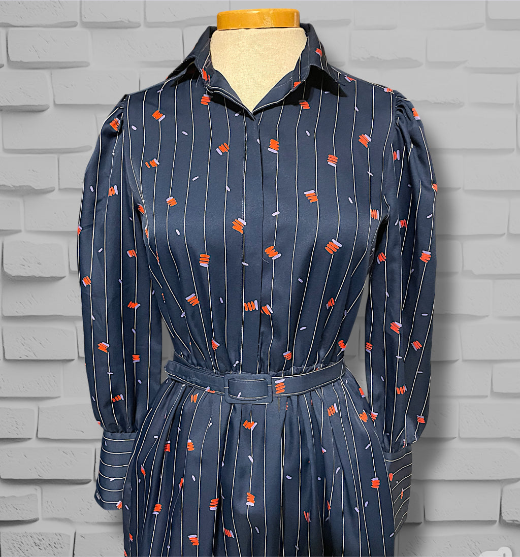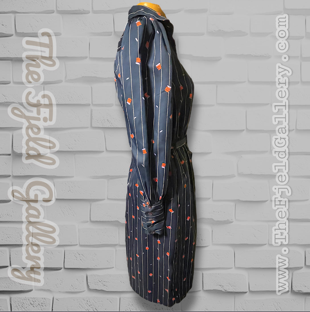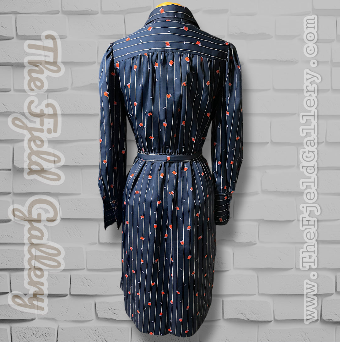 Adorable vintage 1970’s navy blue and white pinstripe (wide pinstripe) with red and purple zig zag abstract pattern long sleeve dress.  Dress shirt cut top with hidden purple opalescent buttons up the front of the chest and a long sleeve with long cuffs with 4 of the same navy purple opalescent buttons.  Has pockets on both sides of the skirt ant hip length. Elastic waist with matching fabric belt and an A-Line cut skirt, tea length.  Designer tag says: “City Shirts / By Melissa Lane” Size/Care tag reads: “ 100% Polyester/ Size 8”.