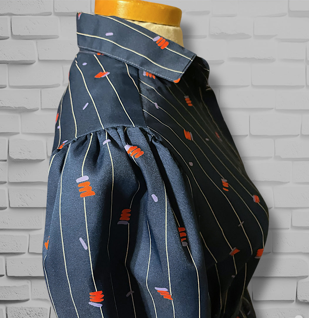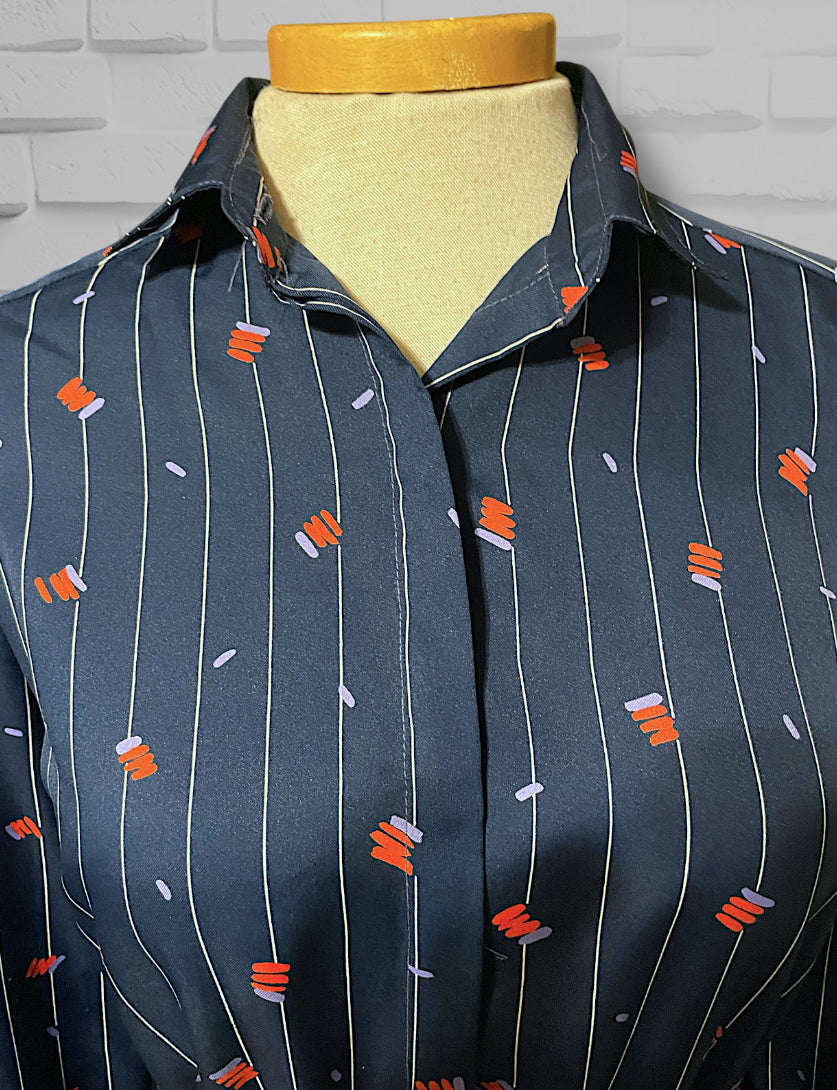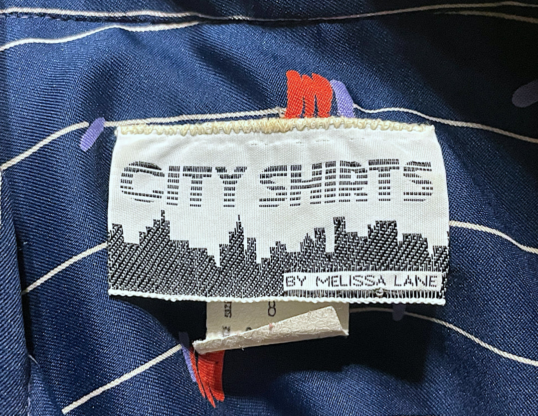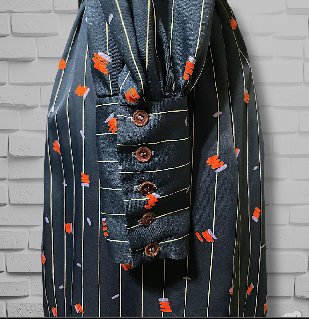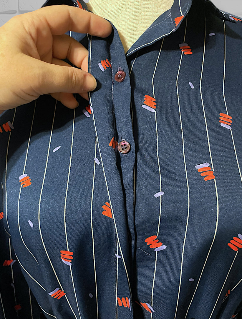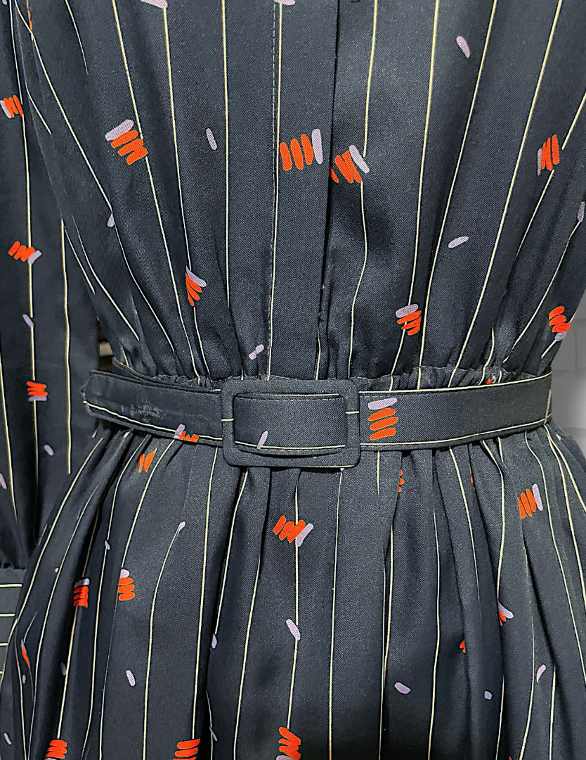 Adorable vintage 1970’s navy blue and white pinstripe (wide pinstripe) with red and purple zig zag abstract pattern long sleeve dress.  Dress shirt cut top with hidden purple opalescent buttons up the front of the chest and a long sleeve with long cuffs with 4 of the same navy purple opalescent buttons.  Has pockets on both sides of the skirt ant hip length. Elastic waist with matching fabric belt and an A-Line cut skirt, tea length.  Designer tag says: “City Shirts / By Melissa Lane” Size/Care tag reads: “ 100% Polyester/ Size 8”.