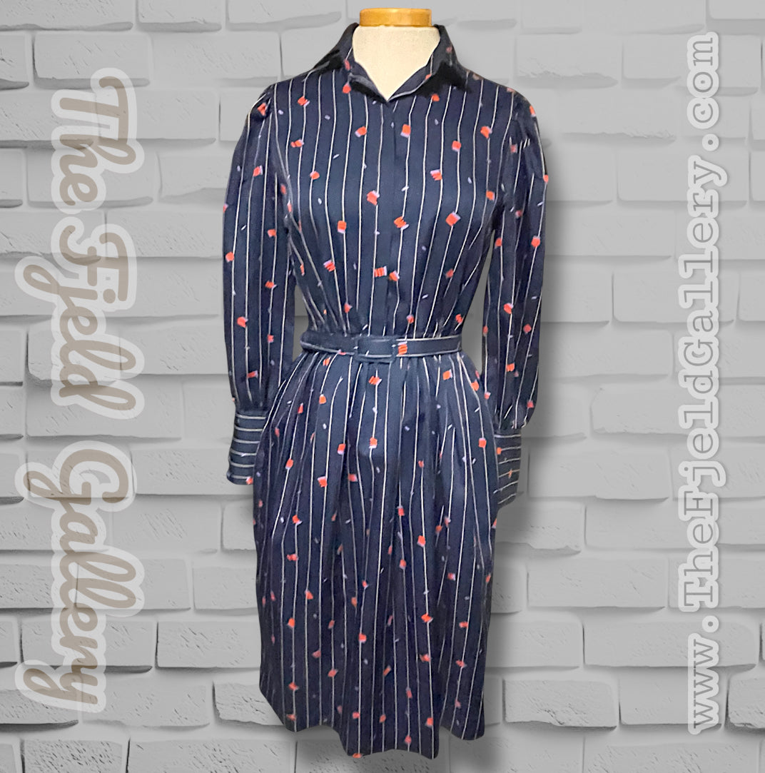 1970’s Navy Blue Pinstripe, Red & Purple Pattern Long-sleeve Pocket Belted Dress