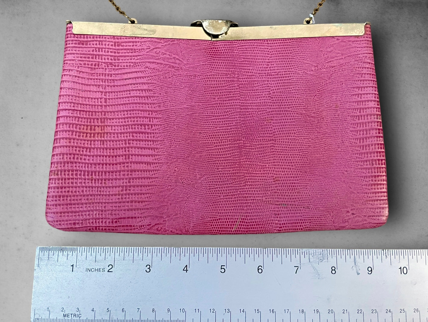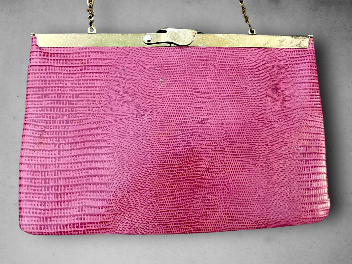 Super cute and retro 1970’s Pink Leather Snake Skin Purse. Gold frame that articulates and “squeezes” open with an oval clasp to close. Has a gold tone chain that can be used outside to hang over shoulder or discreetly hidden inside purse to use as a clutch.