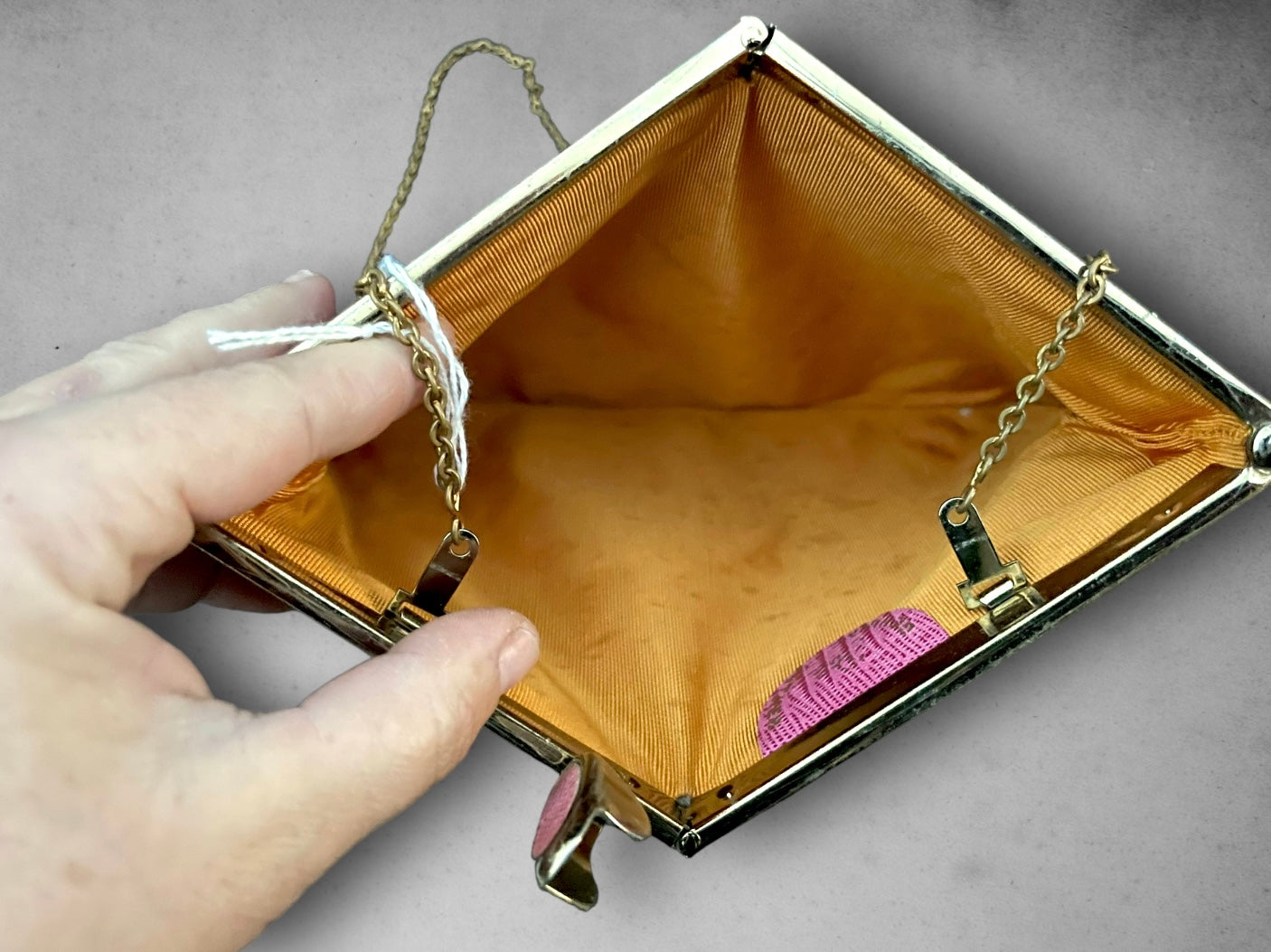 Measures: 9.5” x 6” and chain is 15” long.