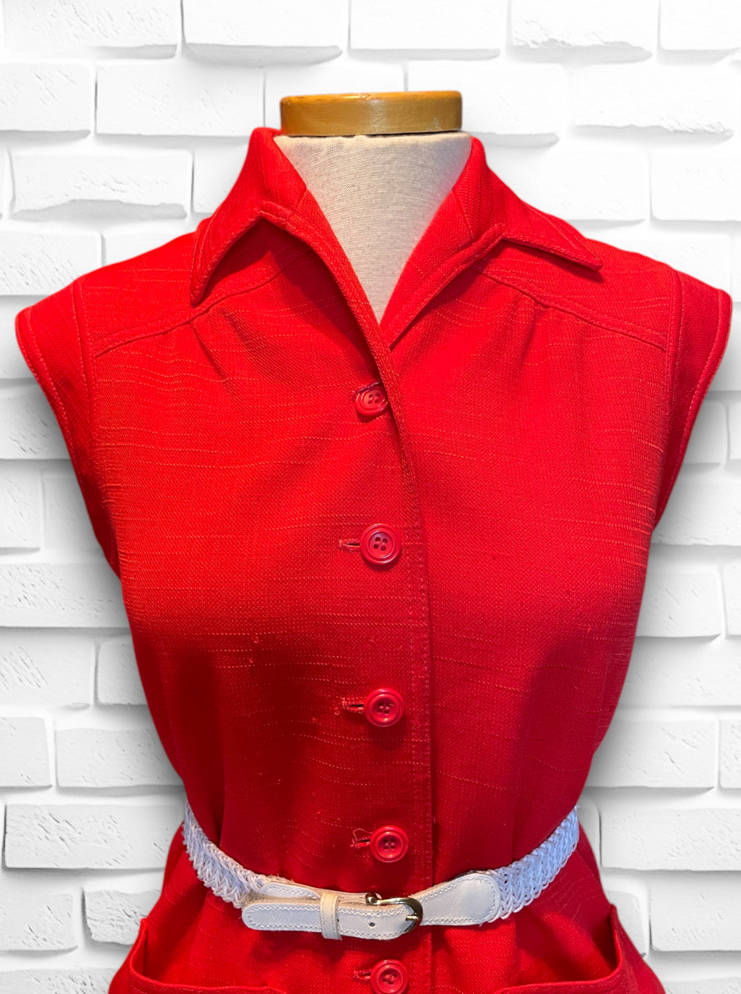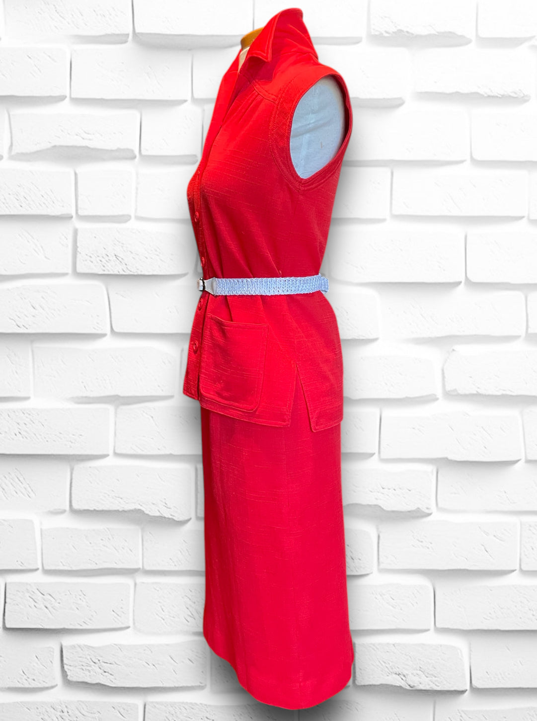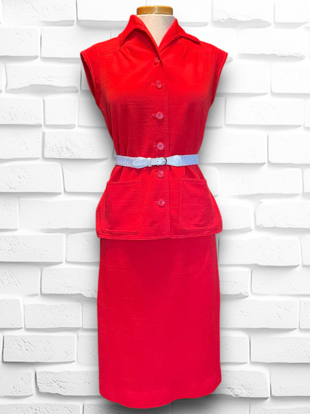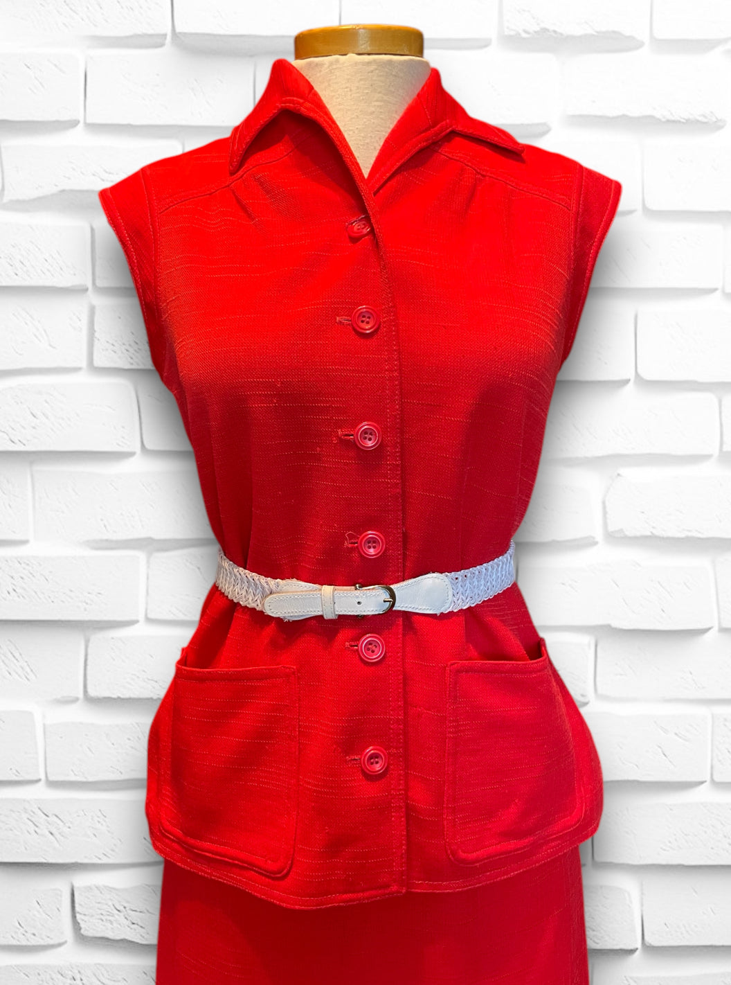 Super cool vintage 1960’s textured pattern red polyester skirt & sleeveless button up top set. Top has 6 medium red buttons up the front with 2 outer open top pockets and a pointed collar. Skirt has a hidden zipper on the side and a button closure at the waist. Also has an elastic waist. Skirt is a straight cut with a bit of a a-line, knee length. Top also has two small “slits” on each side at the waist. Label is “Butte” but has no other size or material tags. Belt not included. No damage or condition issues.