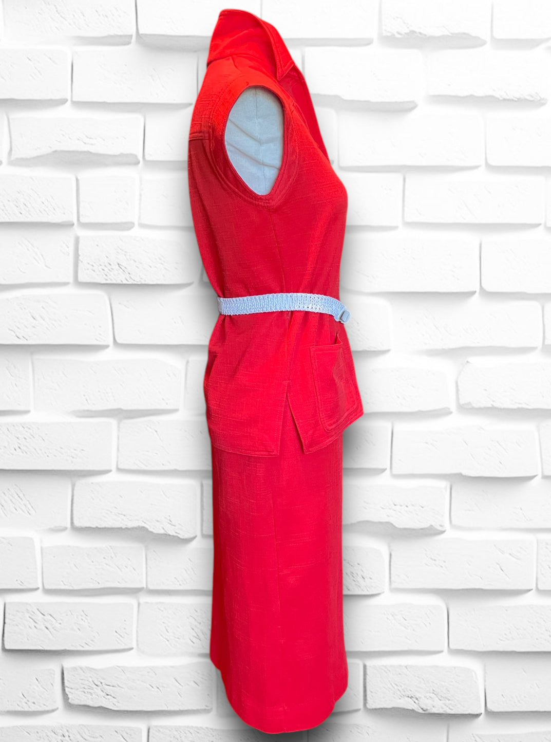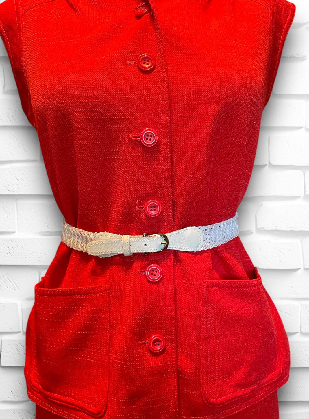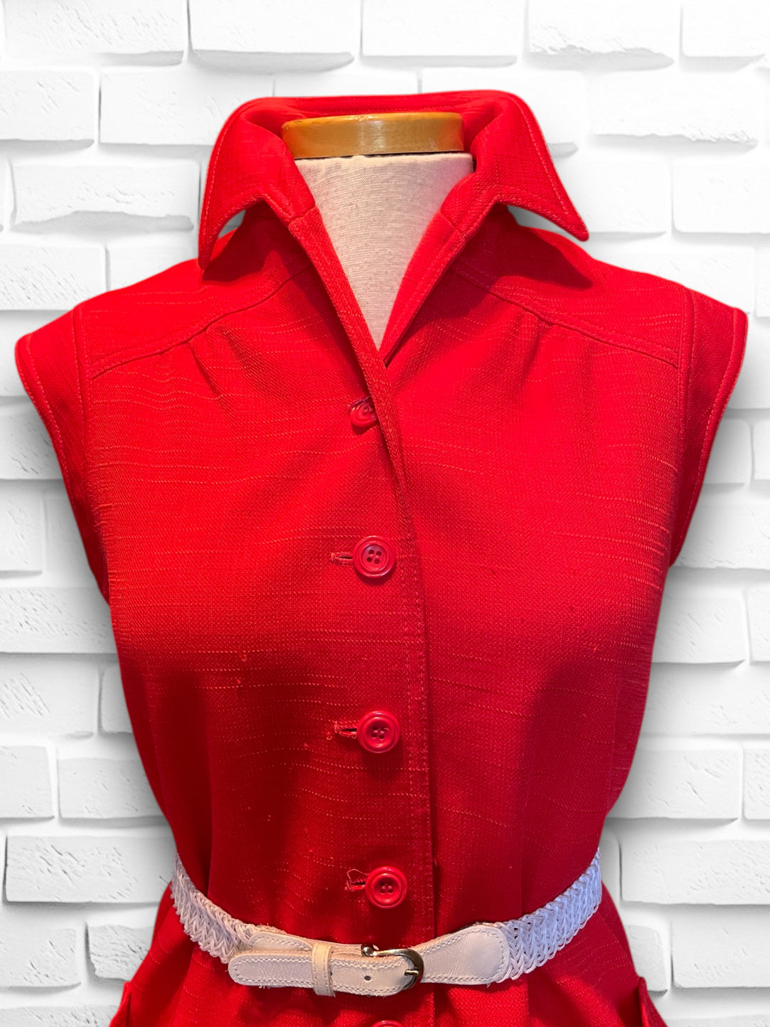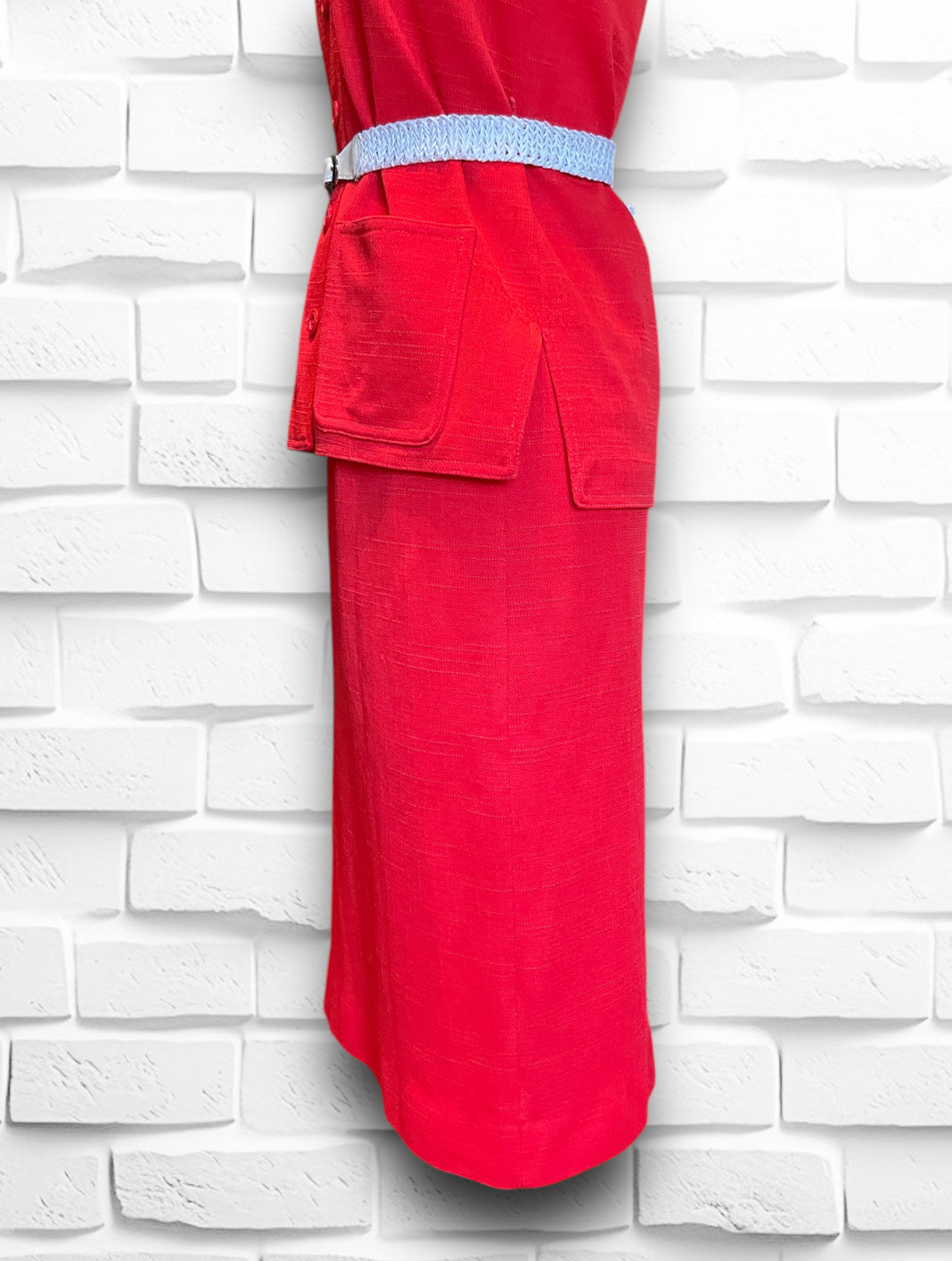Super cool vintage 1960’s textured pattern red polyester skirt & sleeveless button up top set. Top has 6 medium red buttons up the front with 2 outer open top pockets and a pointed collar. Skirt has a hidden zipper on the side and a button closure at the waist. Also has an elastic waist. Skirt is a straight cut with a bit of a a-line, knee length. Top also has two small “slits” on each side at the waist. Label is “Butte” but has no other size or material tags. Belt not included. No damage or condition issues.