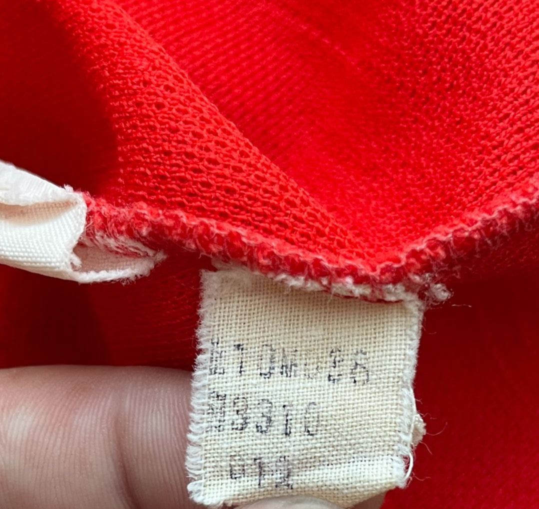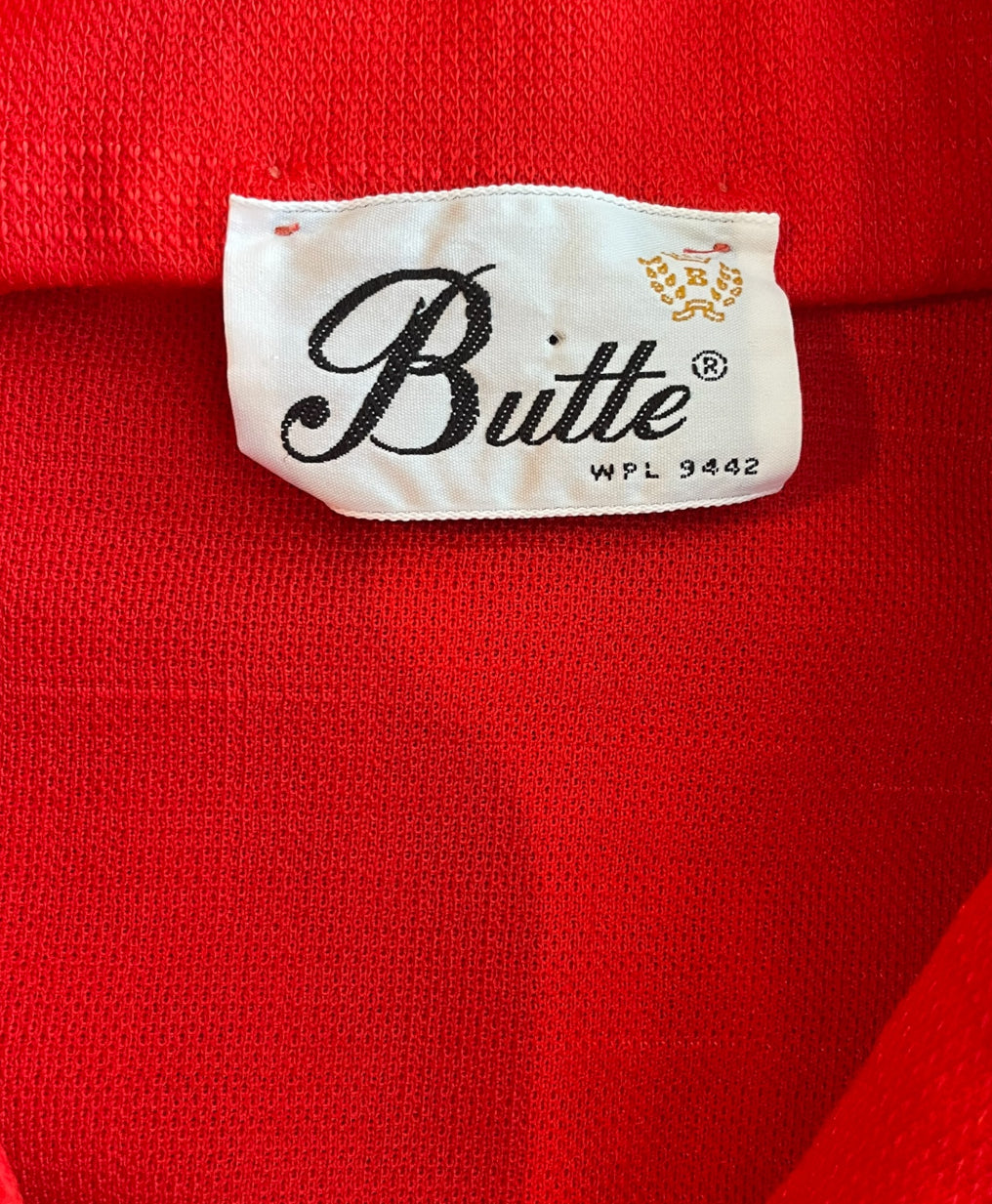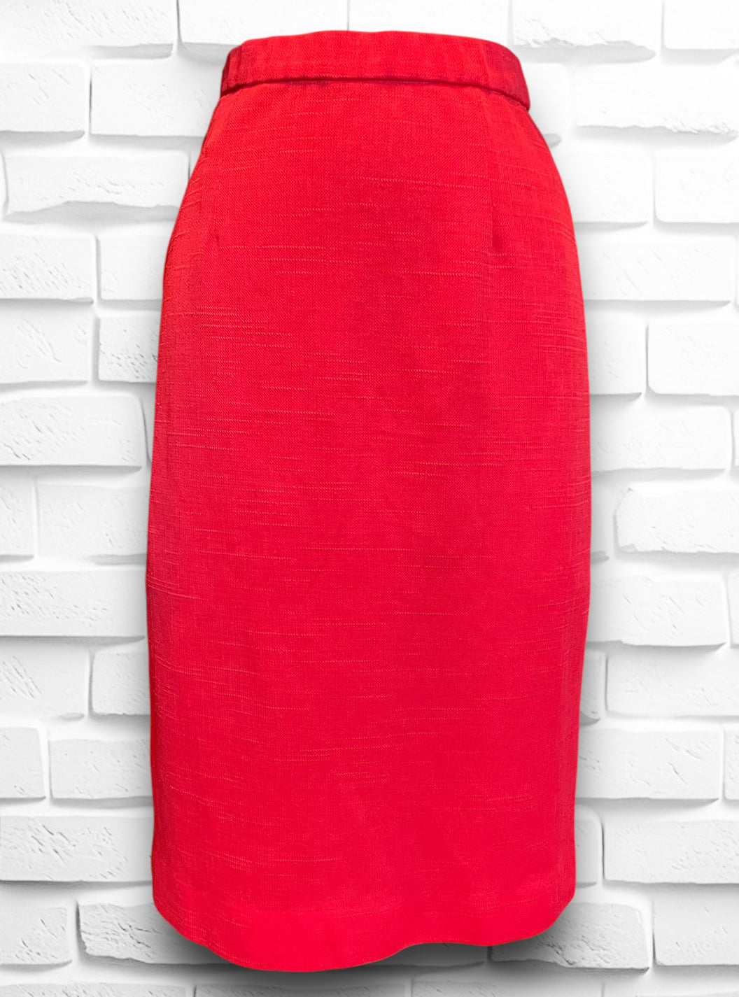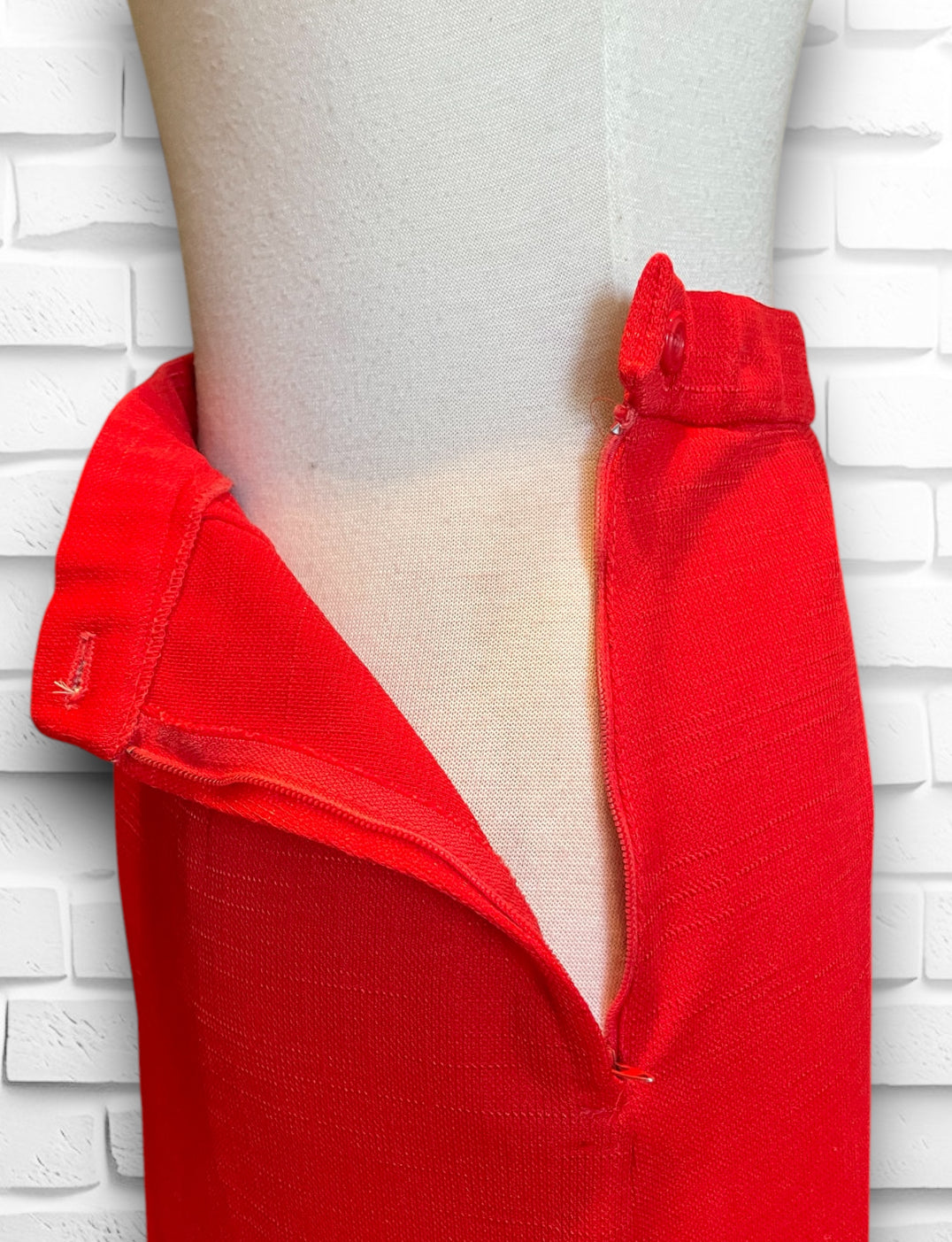 Super cool vintage 1960’s textured pattern red polyester skirt & sleeveless button up top set. Top has 6 medium red buttons up the front with 2 outer open top pockets and a pointed collar. Skirt has a hidden zipper on the side and a button closure at the waist. Also has an elastic waist. Skirt is a straight cut with a bit of a a-line, knee length. Top also has two small “slits” on each side at the waist. Label is “Butte” but has no other size or material tags. Belt not included. No damage or condition issues.