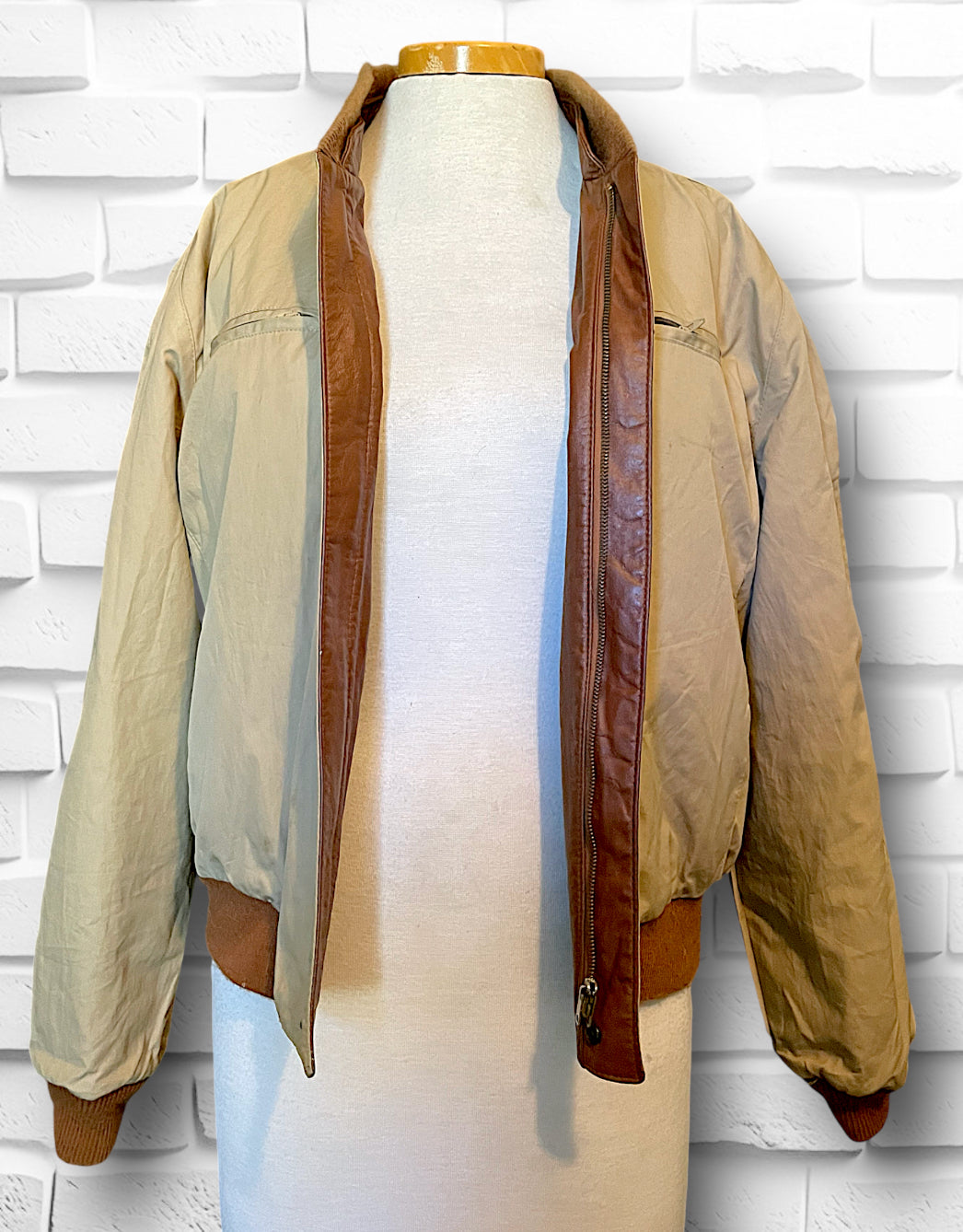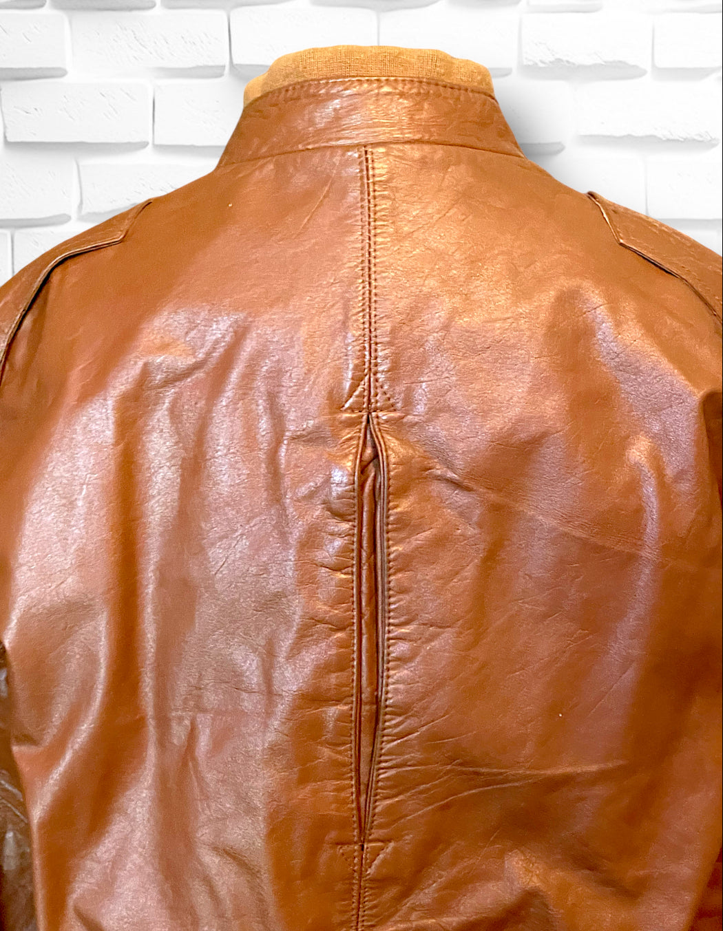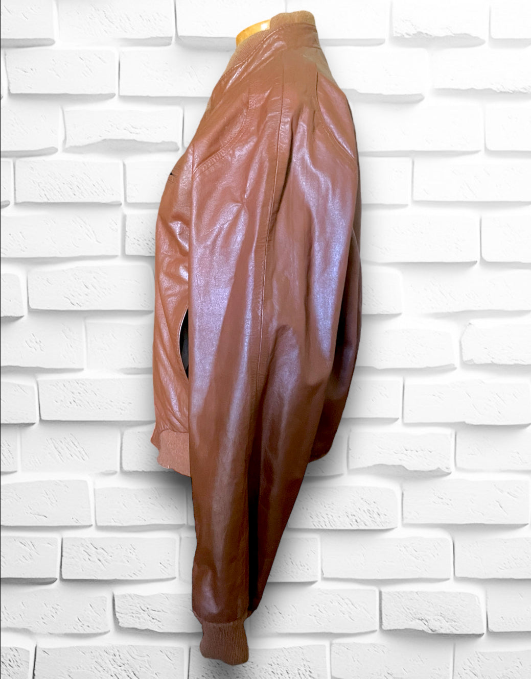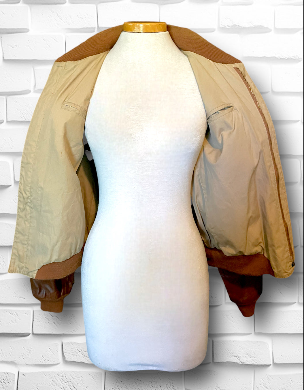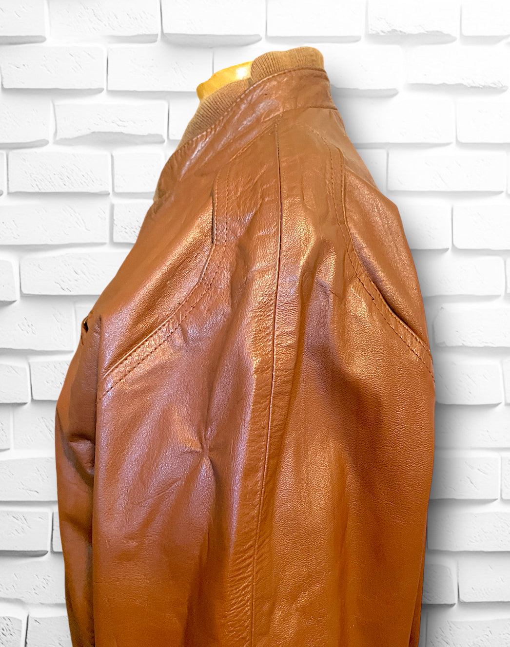 Amazing vintage 1970’s reddish brown leather bomber jacket that is reversible and has a light tan trench fabric on the opposite side.  Both have the brown stretch cotton bomber collar, wrists & waist band.  Both sides have zipper pockets on the front chest, and side hand pockets. No tags or labels that I could find.  Both sides are in great vintage condition.  No holes or stitching issues.  Had a raglan style shoulder, so there are no typical shoulder seams as you can see in the photos, but measurements are taken from where typical shoulder seam would be.