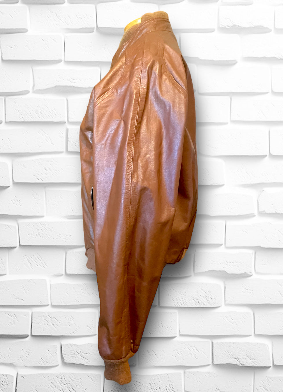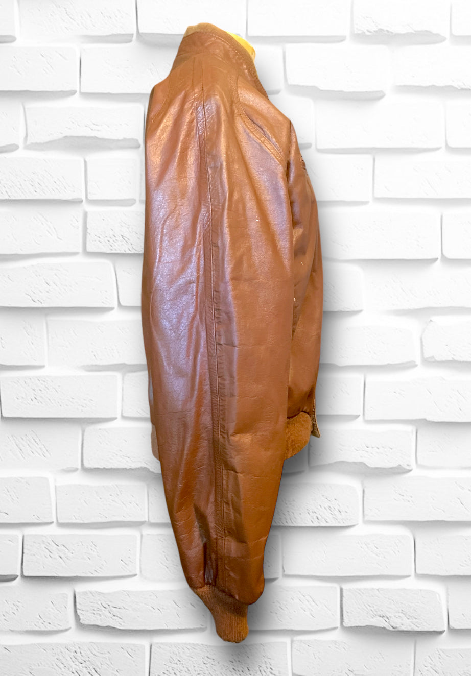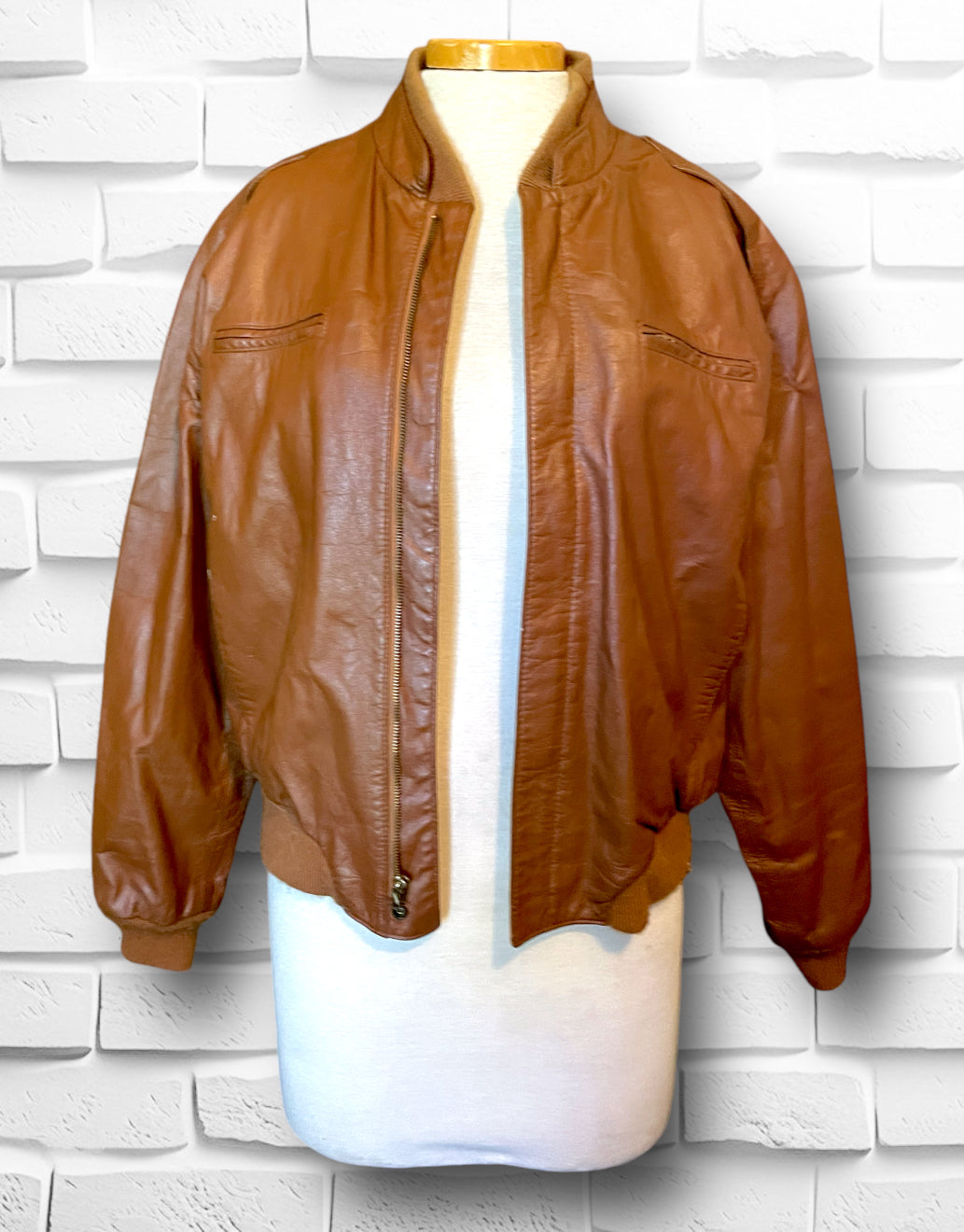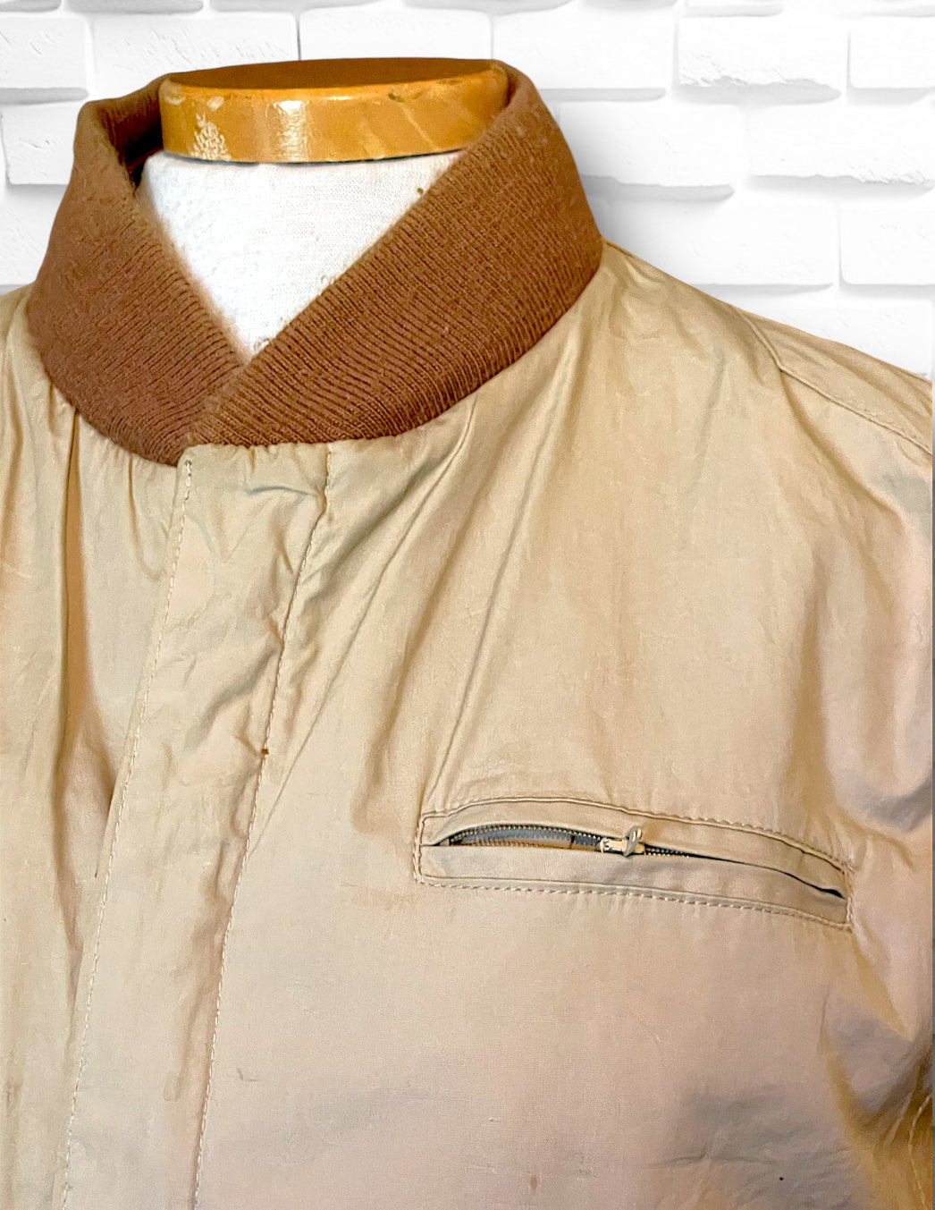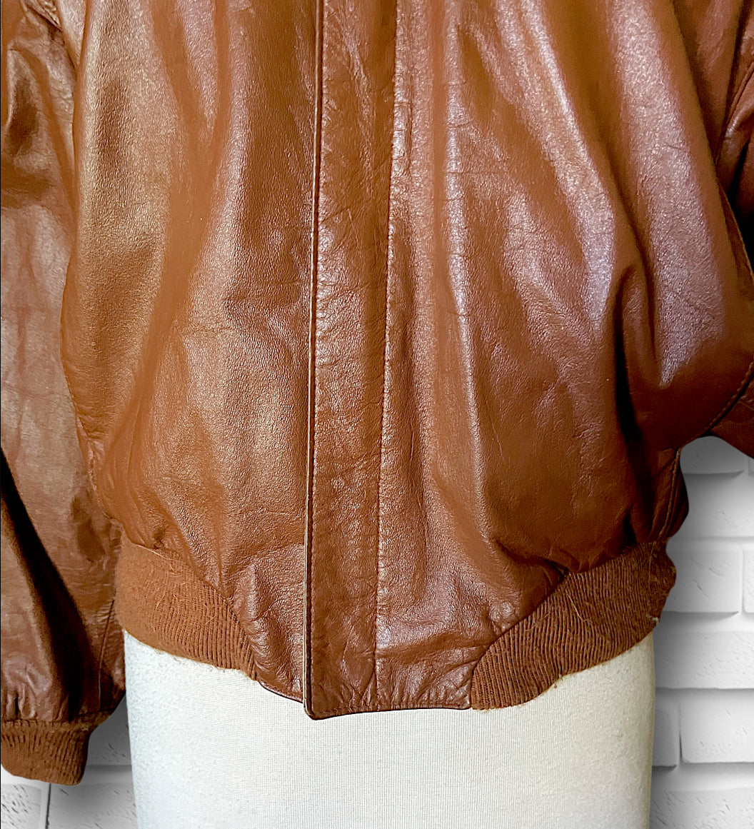 Amazing vintage 1970’s reddish brown leather bomber jacket that is reversible and has a light tan trench fabric on the opposite side.  Both have the brown stretch cotton bomber collar, wrists & waist band.  Both sides have zipper pockets on the front chest, and side hand pockets. No tags or labels that I could find.  Both sides are in great vintage condition.  No holes or stitching issues.  Had a raglan style shoulder, so there are no typical shoulder seams as you can see in the photos, but measurements are taken from where typical shoulder seam would be.