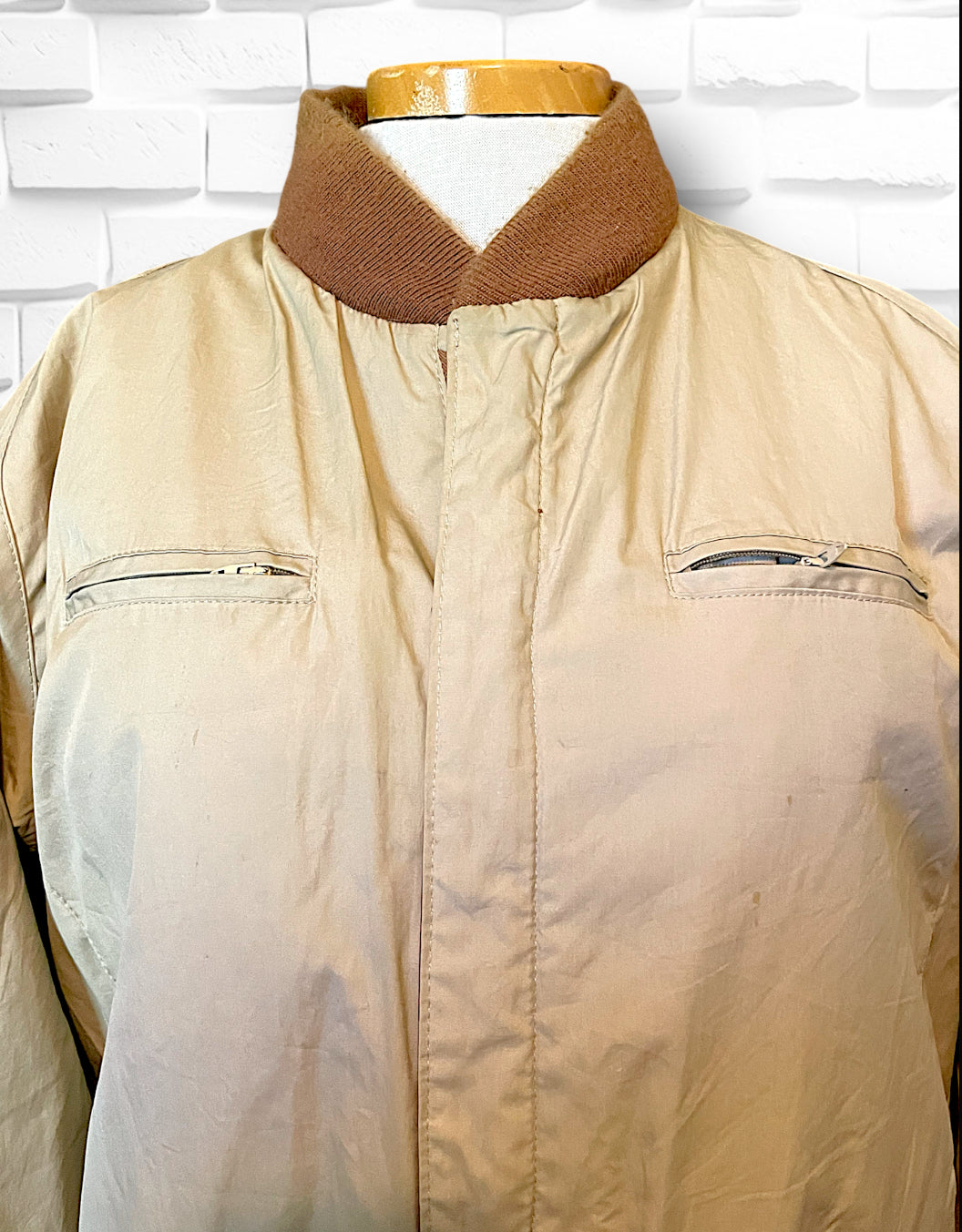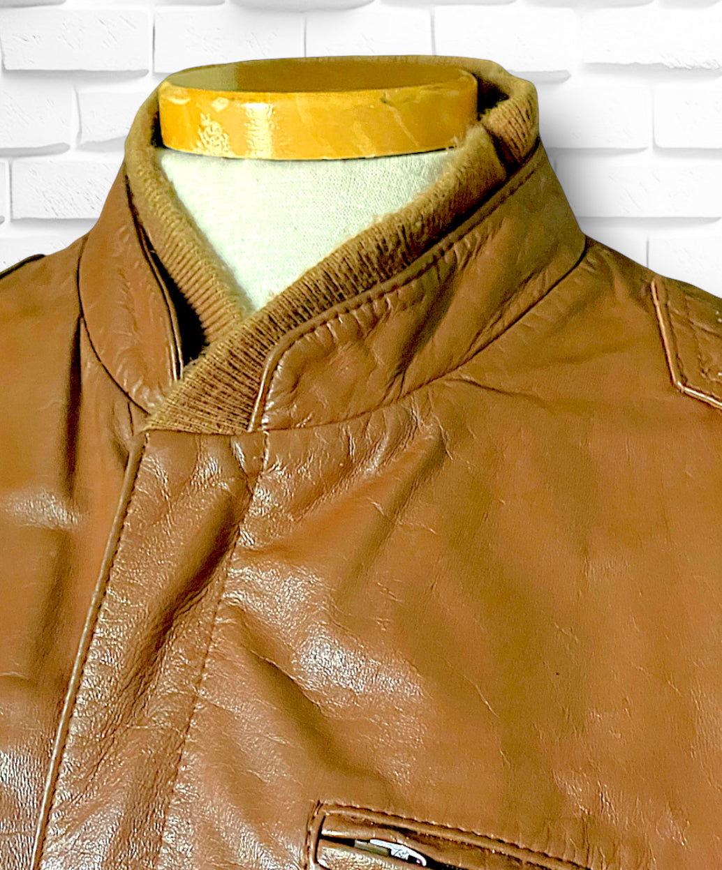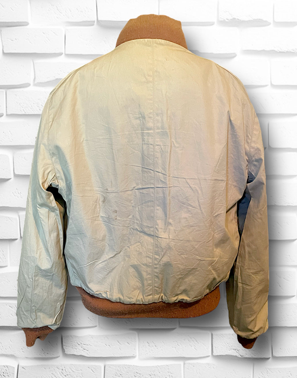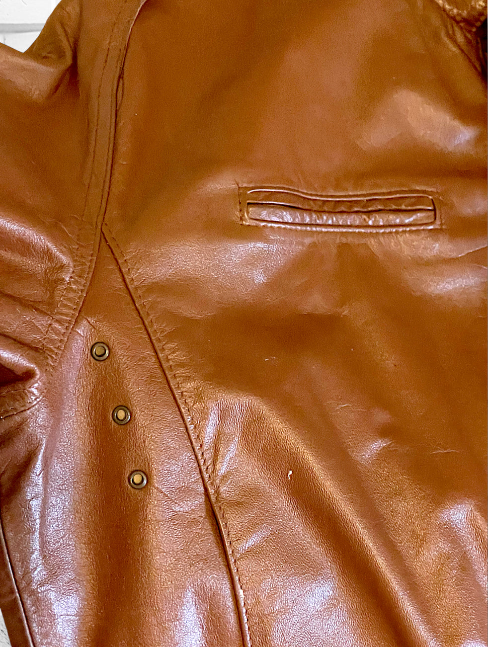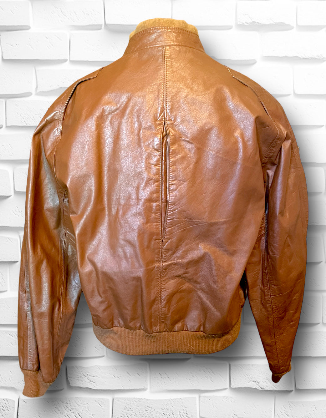 Amazing vintage 1970’s reddish brown leather bomber jacket that is reversible and has a light tan trench fabric on the opposite side.  Both have the brown stretch cotton bomber collar, wrists & waist band.  Both sides have zipper pockets on the front chest, and side hand pockets. No tags or labels that I could find.  Both sides are in great vintage condition.  No holes or stitching issues.  Had a raglan style shoulder, so there are no typical shoulder seams as you can see in the photos, but measurements are taken from where typical shoulder seam would be.