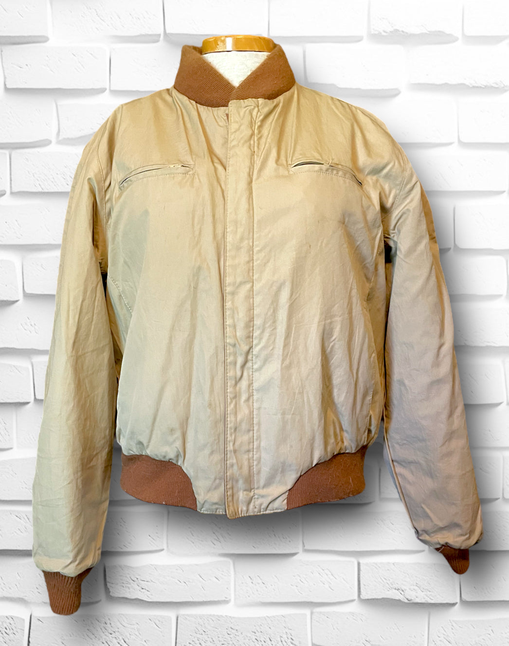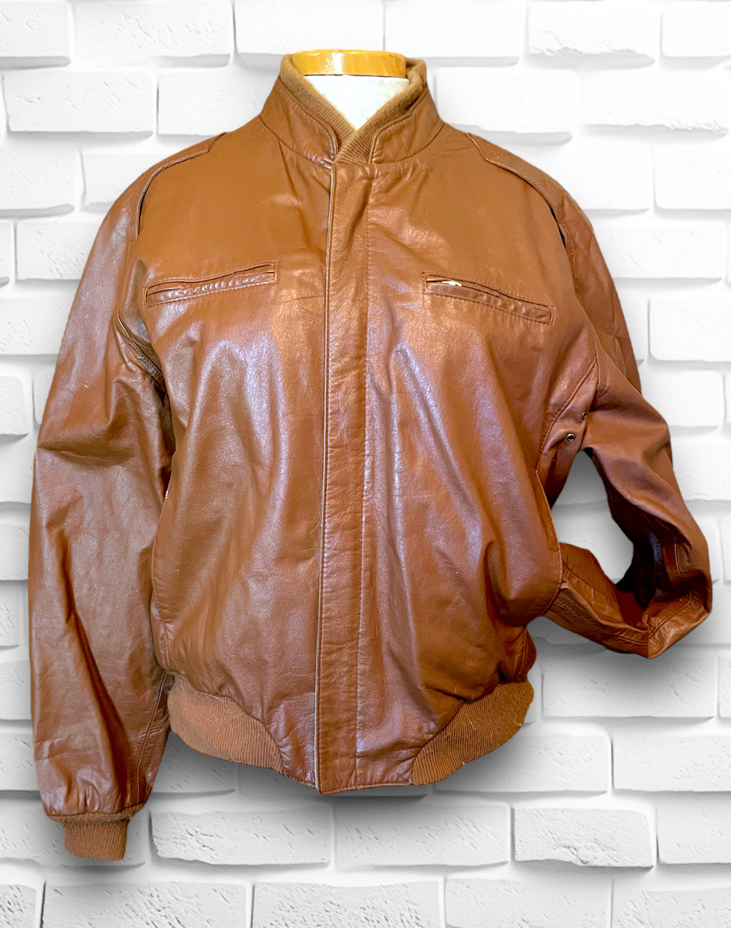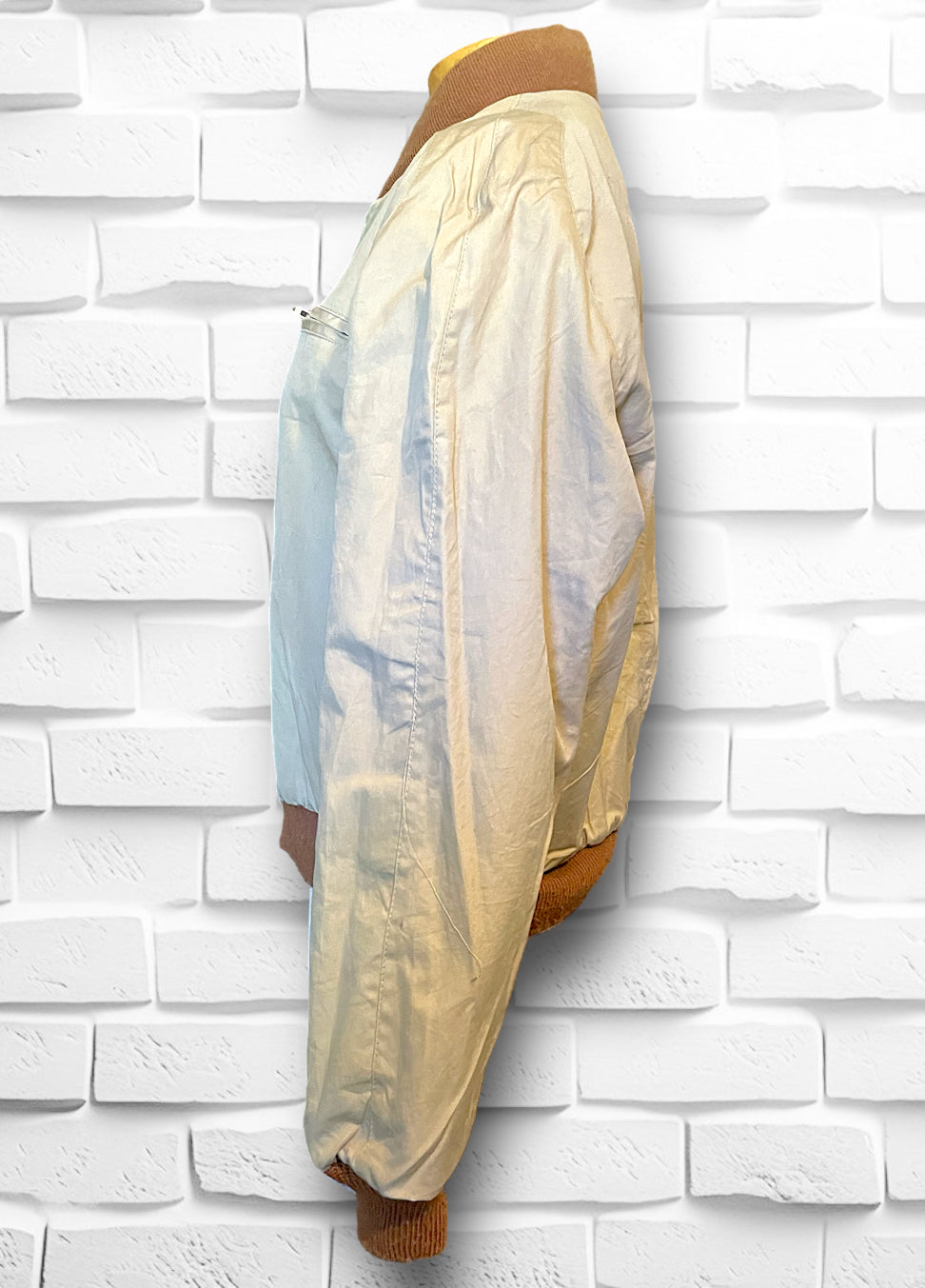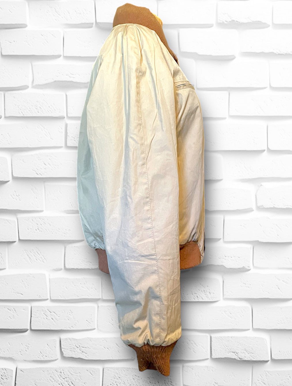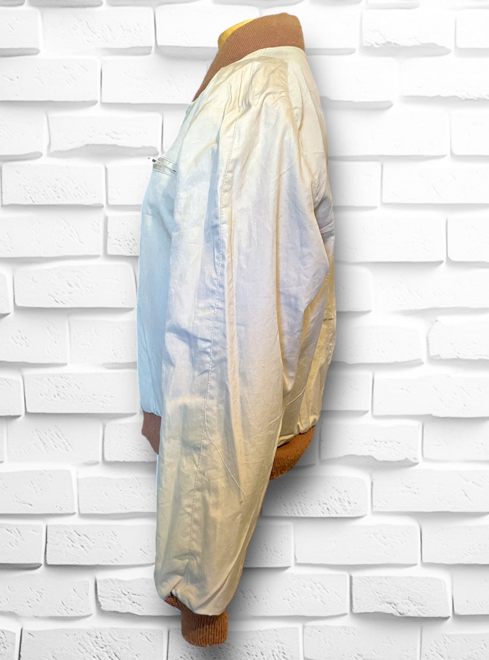 Amazing vintage 1970’s reddish brown leather bomber jacket that is reversible and has a light tan trench fabric on the opposite side.  Both have the brown stretch cotton bomber collar, wrists & waist band.  Both sides have zipper pockets on the front chest, and side hand pockets. No tags or labels that I could find.  Both sides are in great vintage condition.  No holes or stitching issues.  Had a raglan style shoulder, so there are no typical shoulder seams as you can see in the photos, but measurements are taken from where typical shoulder seam would be.