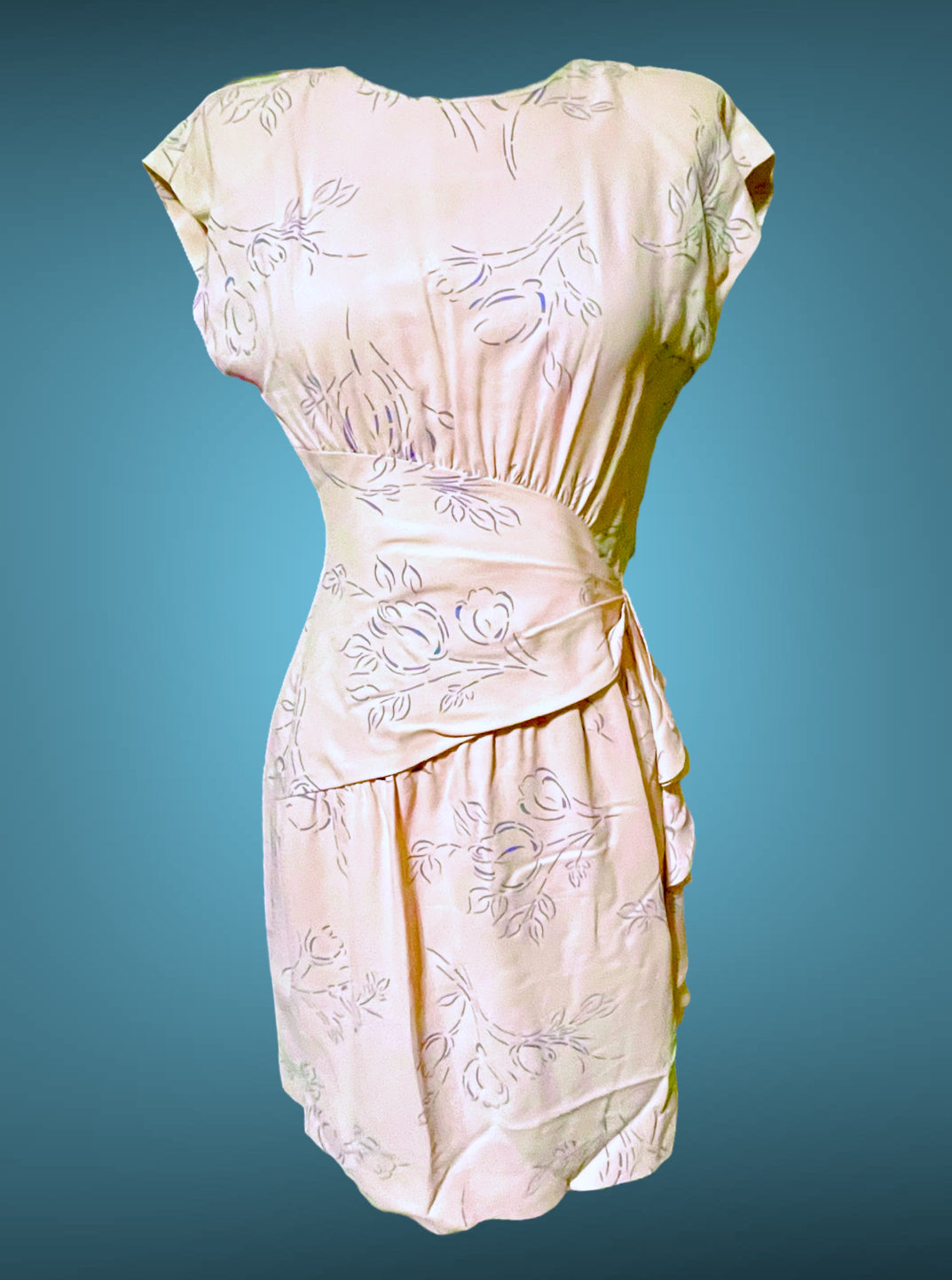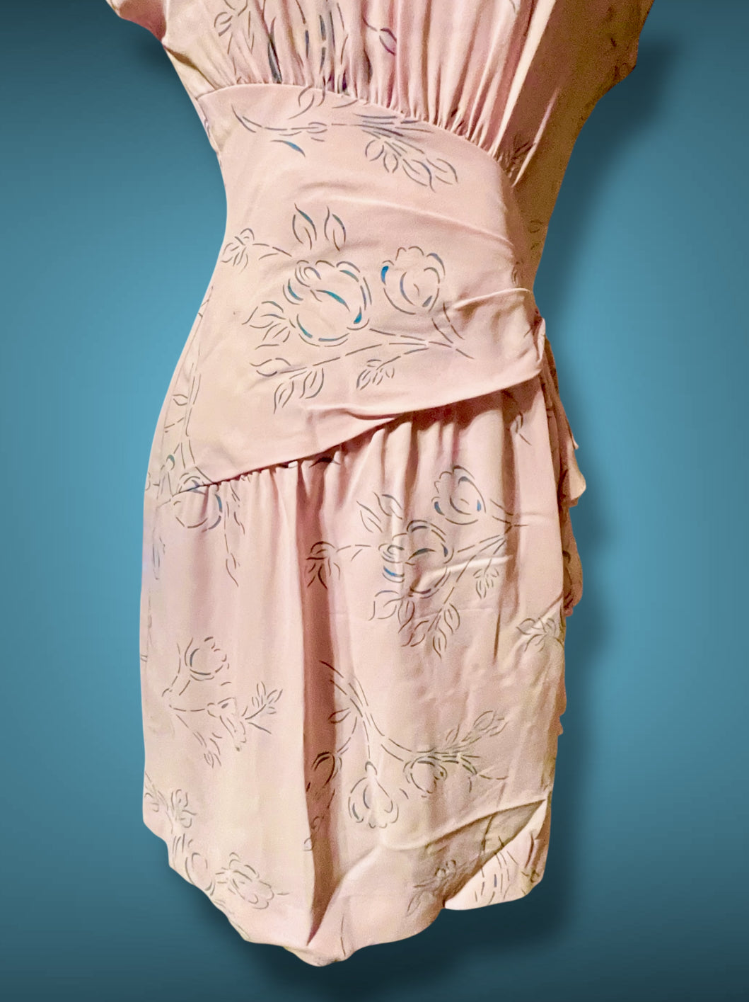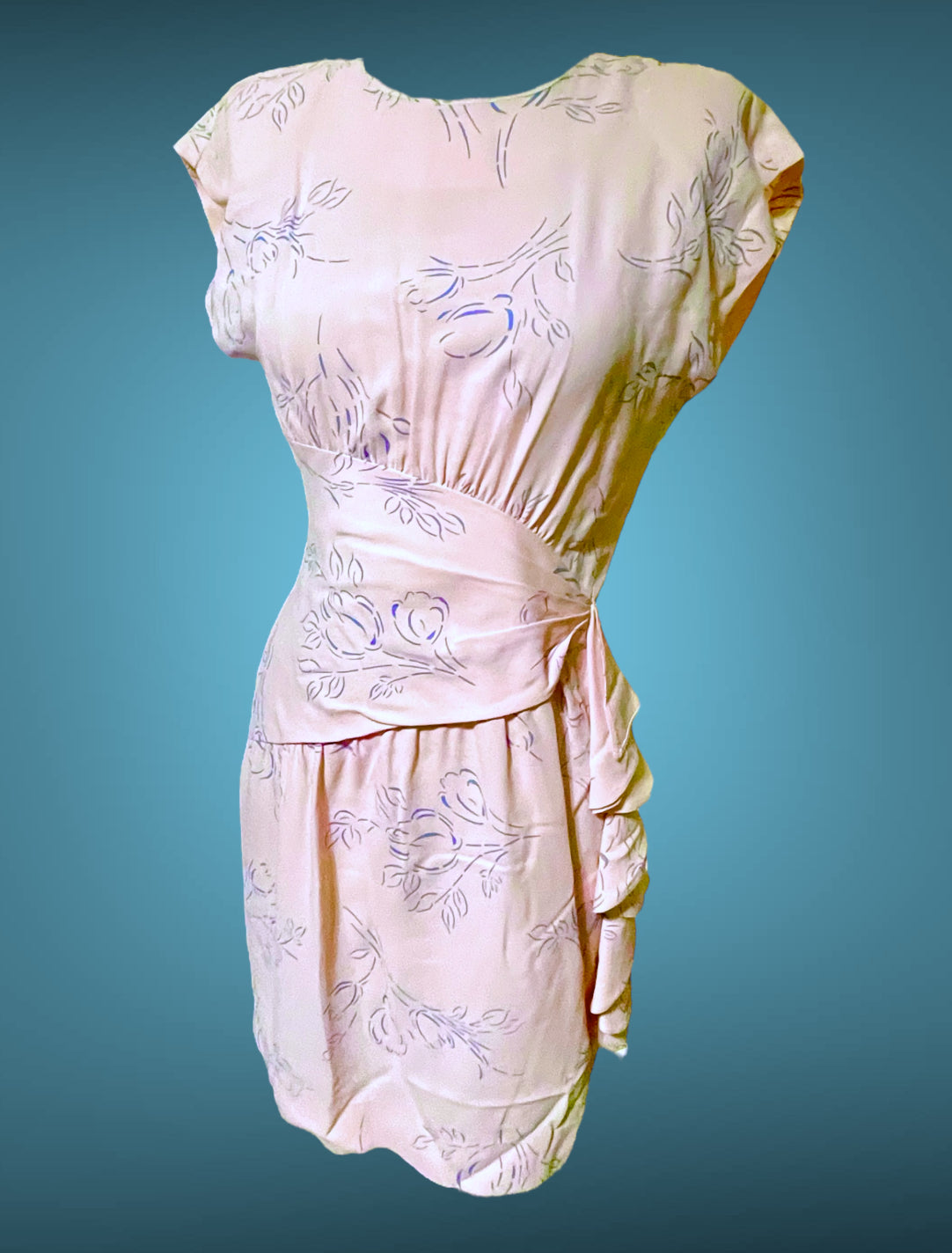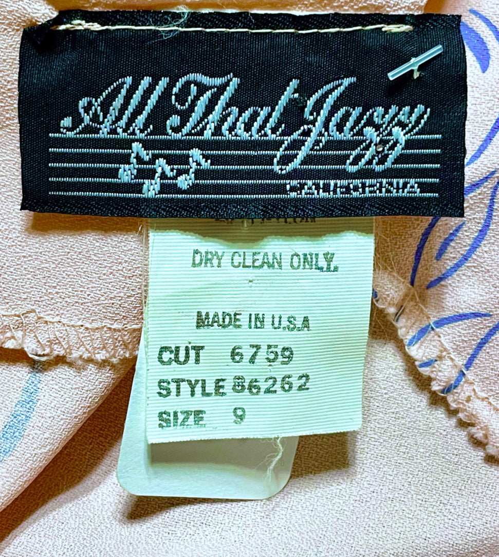 Super cute and chic late 1980’s early 1990’s “All That Jazz” designer dress made in California. 80% Acetate 20% Nylon. Size 9. Really pretty light pink and powder blue retro floral print, with a boat neck cut, no shoulder seams. Very chic asymmetrical gathered waist cut with a slim long ruffle down left side. Chevron waist on back side with back zipper and small center slit in skirt. One of the cutest and most unique cuts of a dress I’ve seen in my opinion. In absolutely perfect condition, looks brand new.