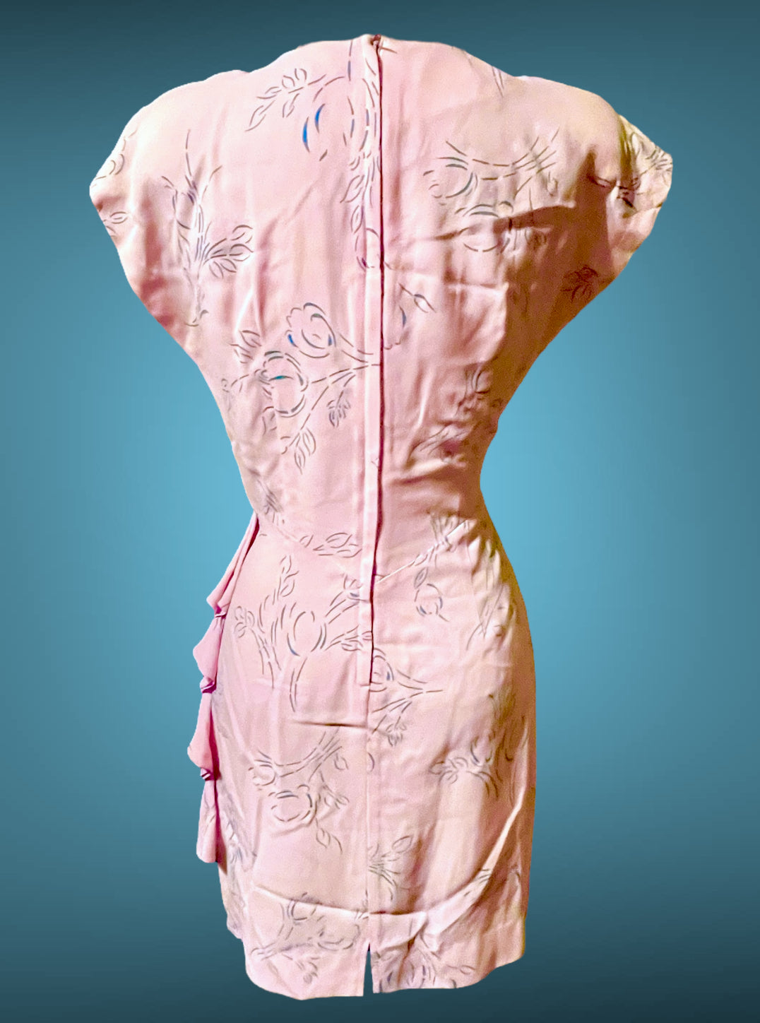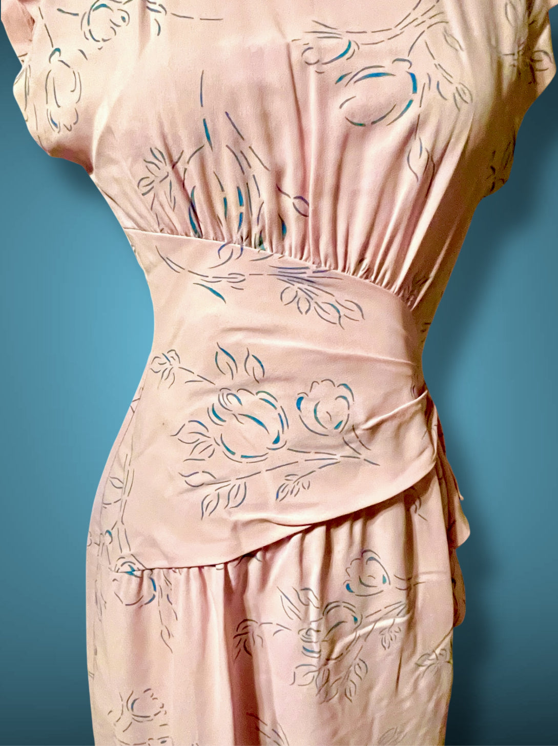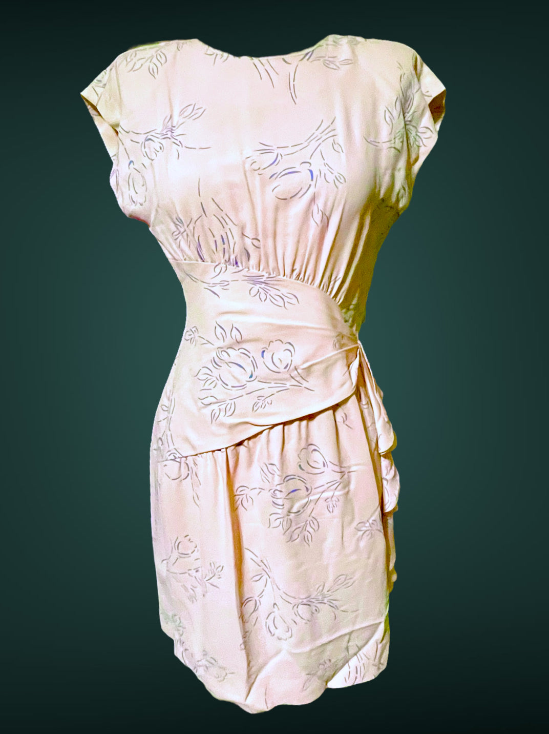 Super cute and chic late 1980’s early 1990’s “All That Jazz” designer dress made in California. 80% Acetate 20% Nylon. Size 9. Really pretty light pink and powder blue retro floral print, with a boat neck cut, no shoulder seams. Very chic asymmetrical gathered waist cut with a slim long ruffle down left side. Chevron waist on back side with back zipper and small center slit in skirt. One of the cutest and most unique cuts of a dress I’ve seen in my opinion. In absolutely perfect condition, looks brand new.