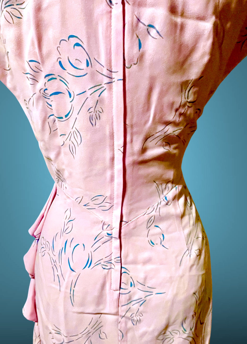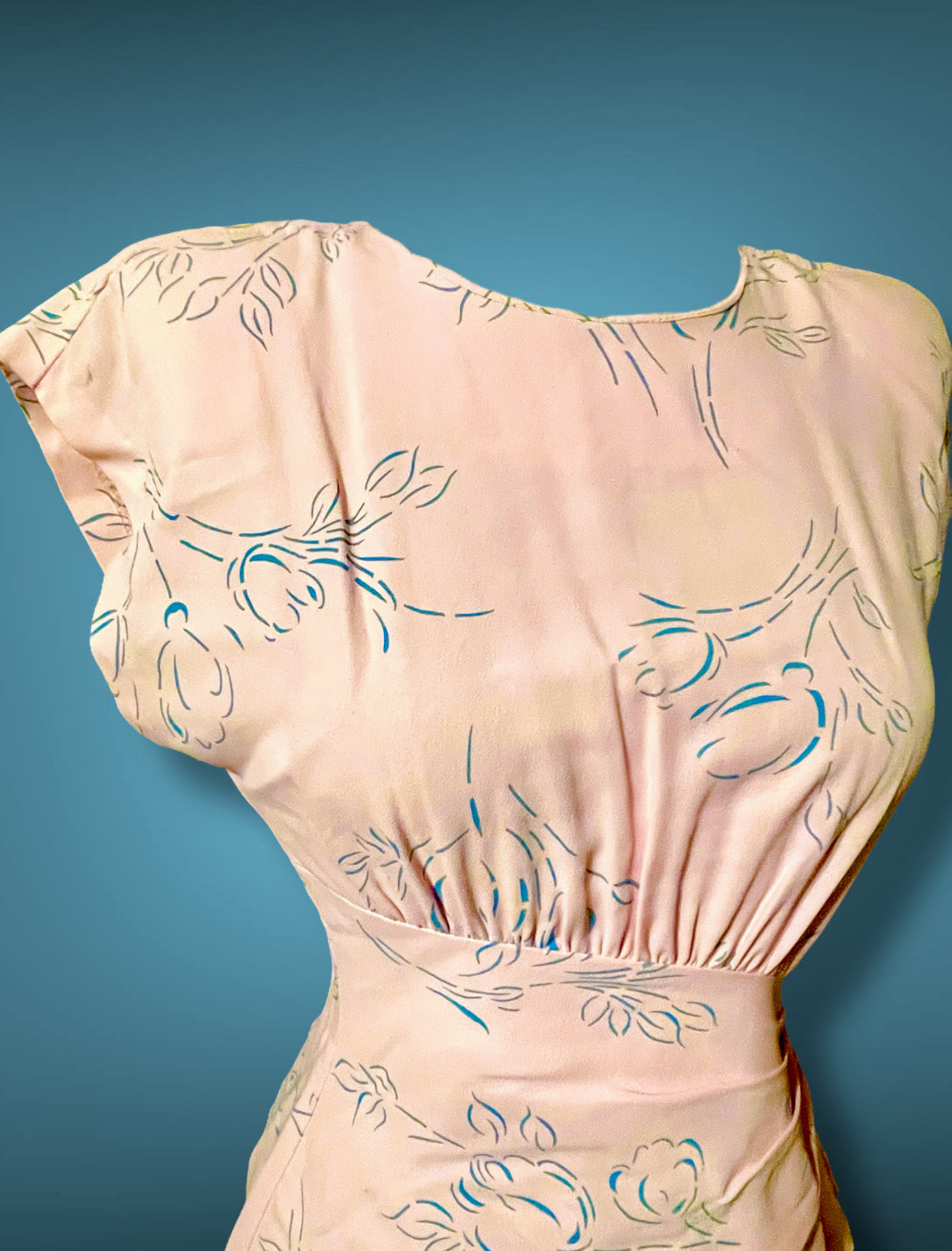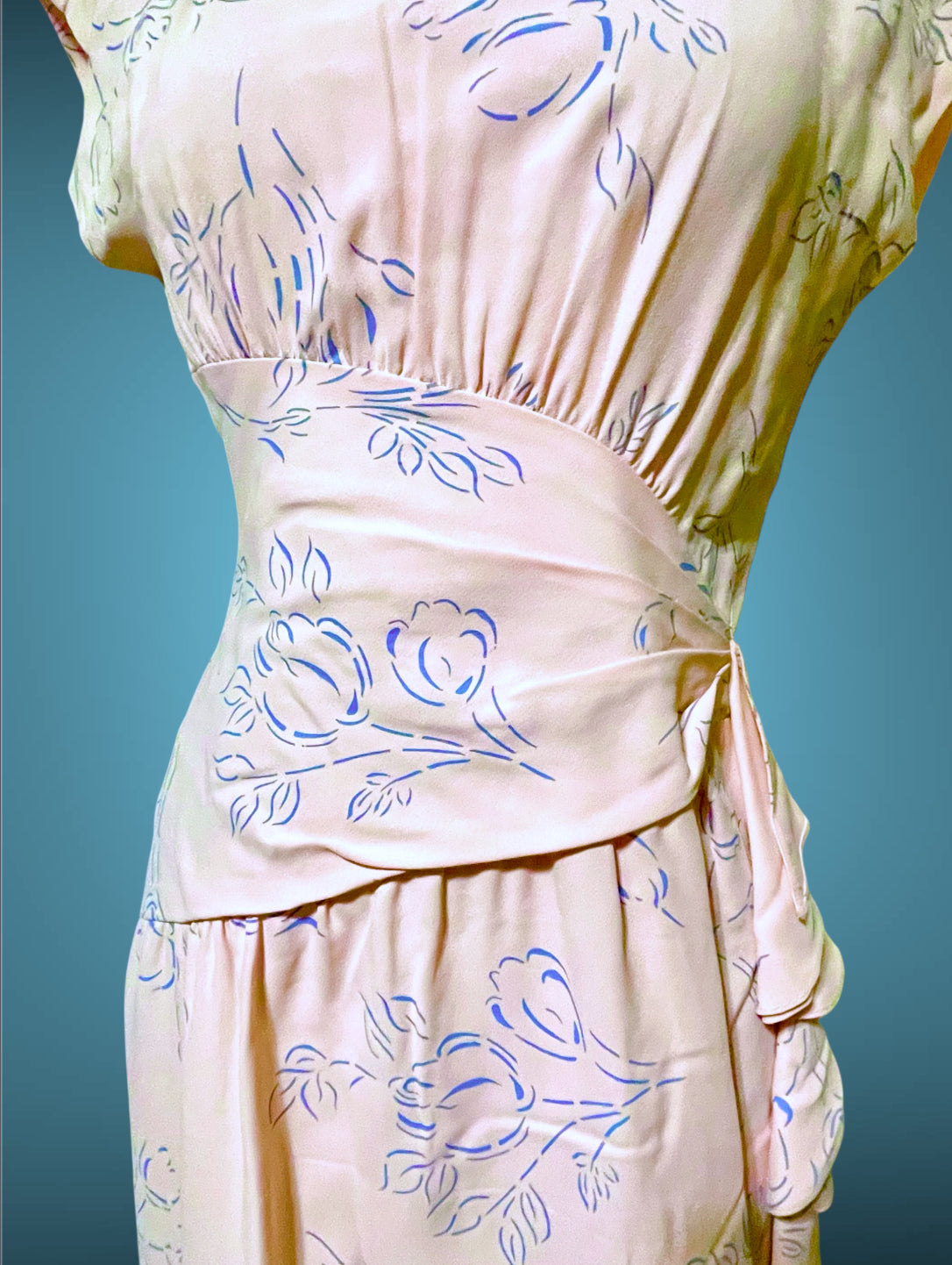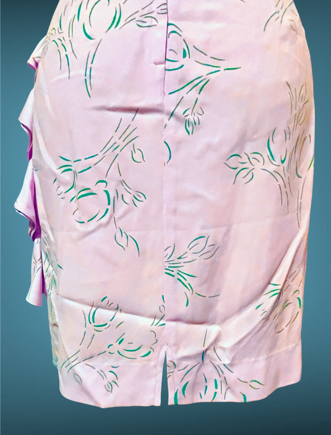 Super cute and chic late 1980’s early 1990’s “All That Jazz” designer dress made in California. 80% Acetate 20% Nylon. Size 9. Really pretty light pink and powder blue retro floral print, with a boat neck cut, no shoulder seams. Very chic asymmetrical gathered waist cut with a slim long ruffle down left side. Chevron waist on back side with back zipper and small center slit in skirt. One of the cutest and most unique cuts of a dress I’ve seen in my opinion. In absolutely perfect condition, looks brand new.