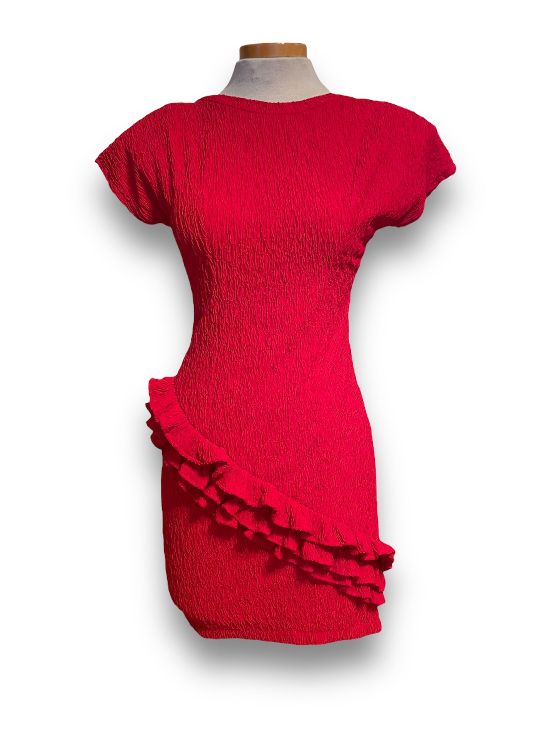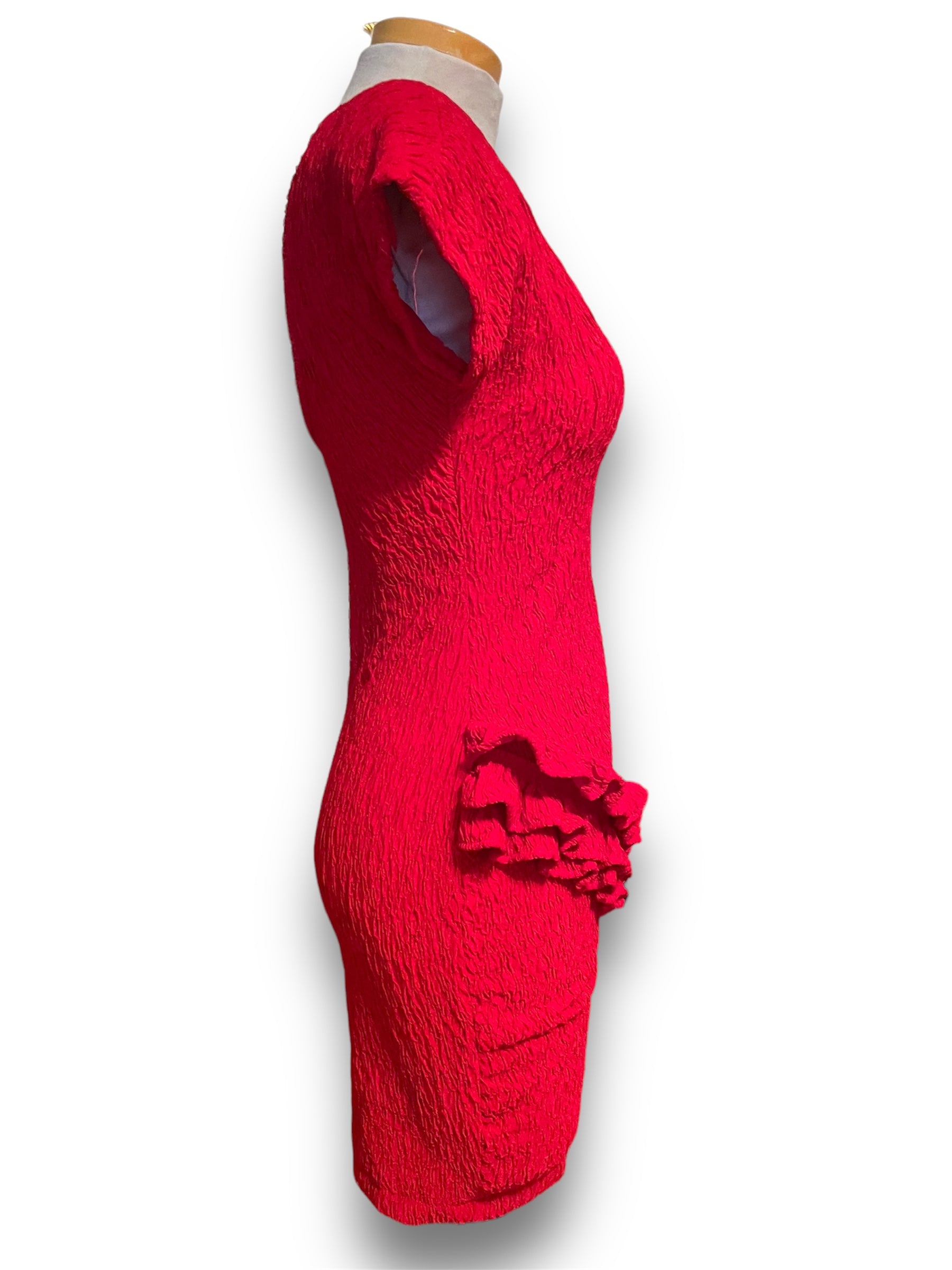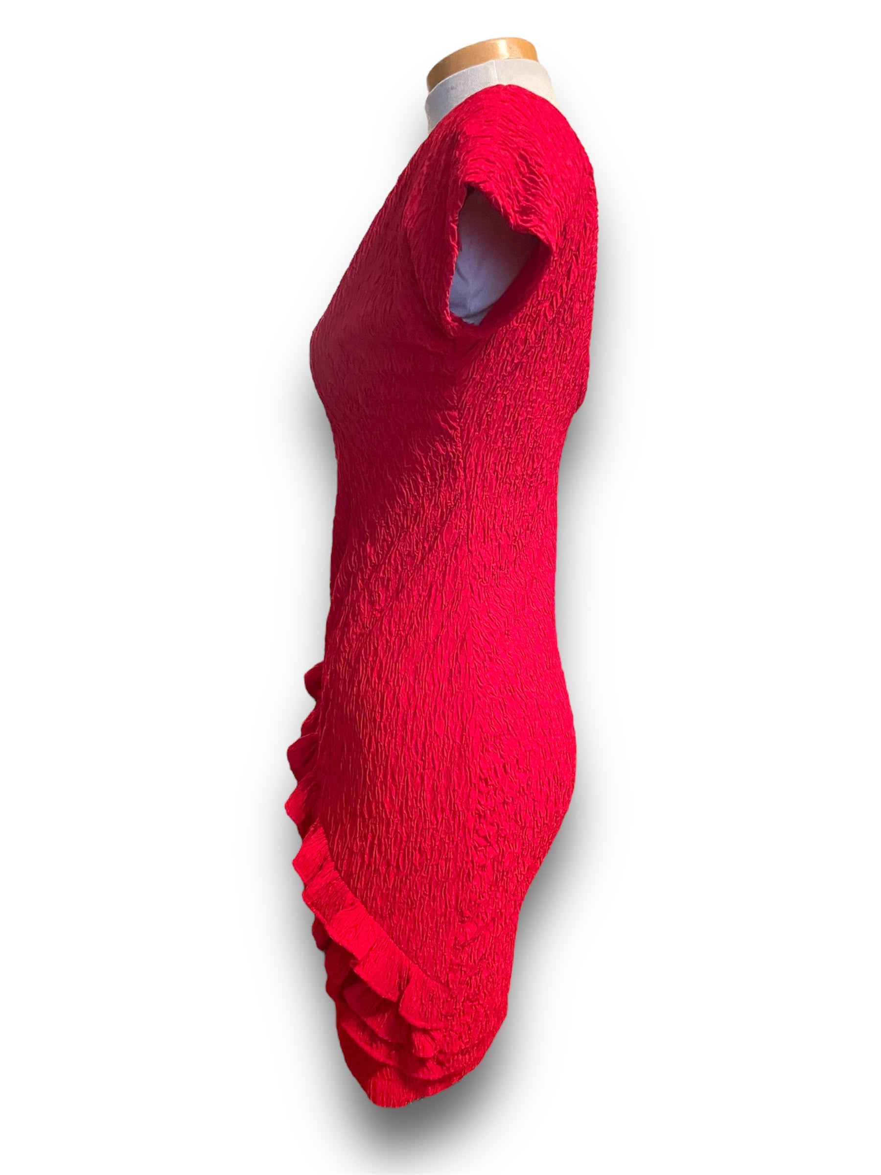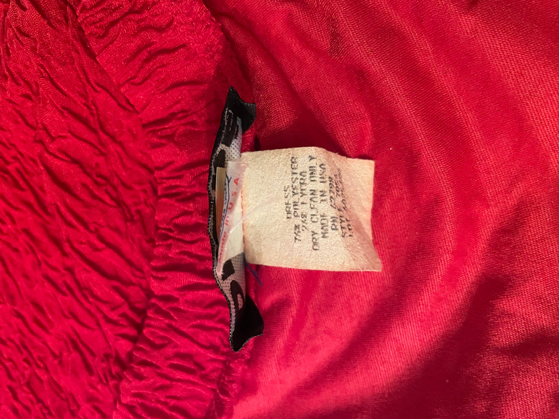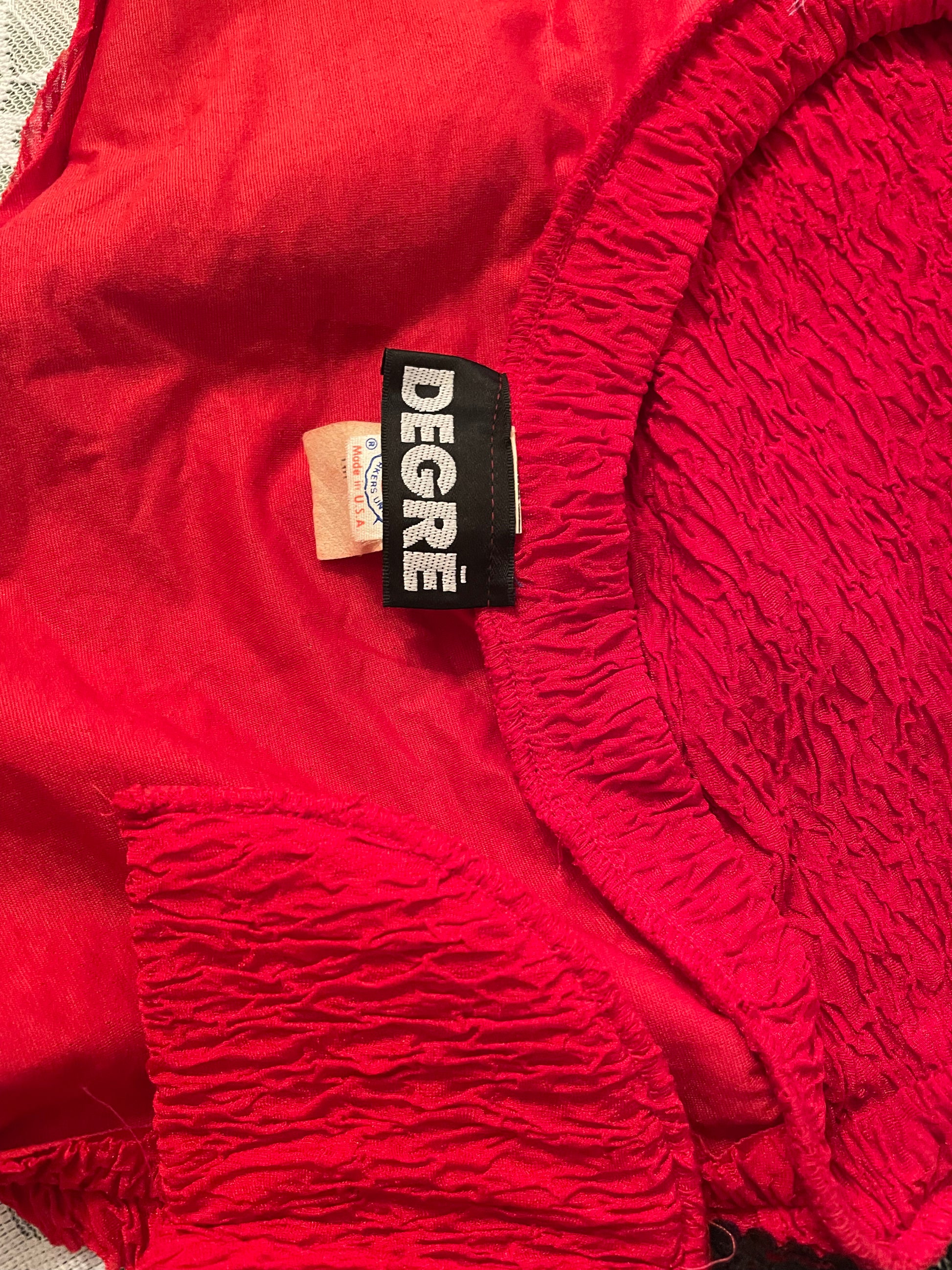 Vintage 1990’s Red ruffled party dress with a stretch crepe texture, low back and short sleeves. High boat neck and small shoulder pads. Designed by Degré size 5/6 made in California U.S.A. Still has hanging assistance in black lace.