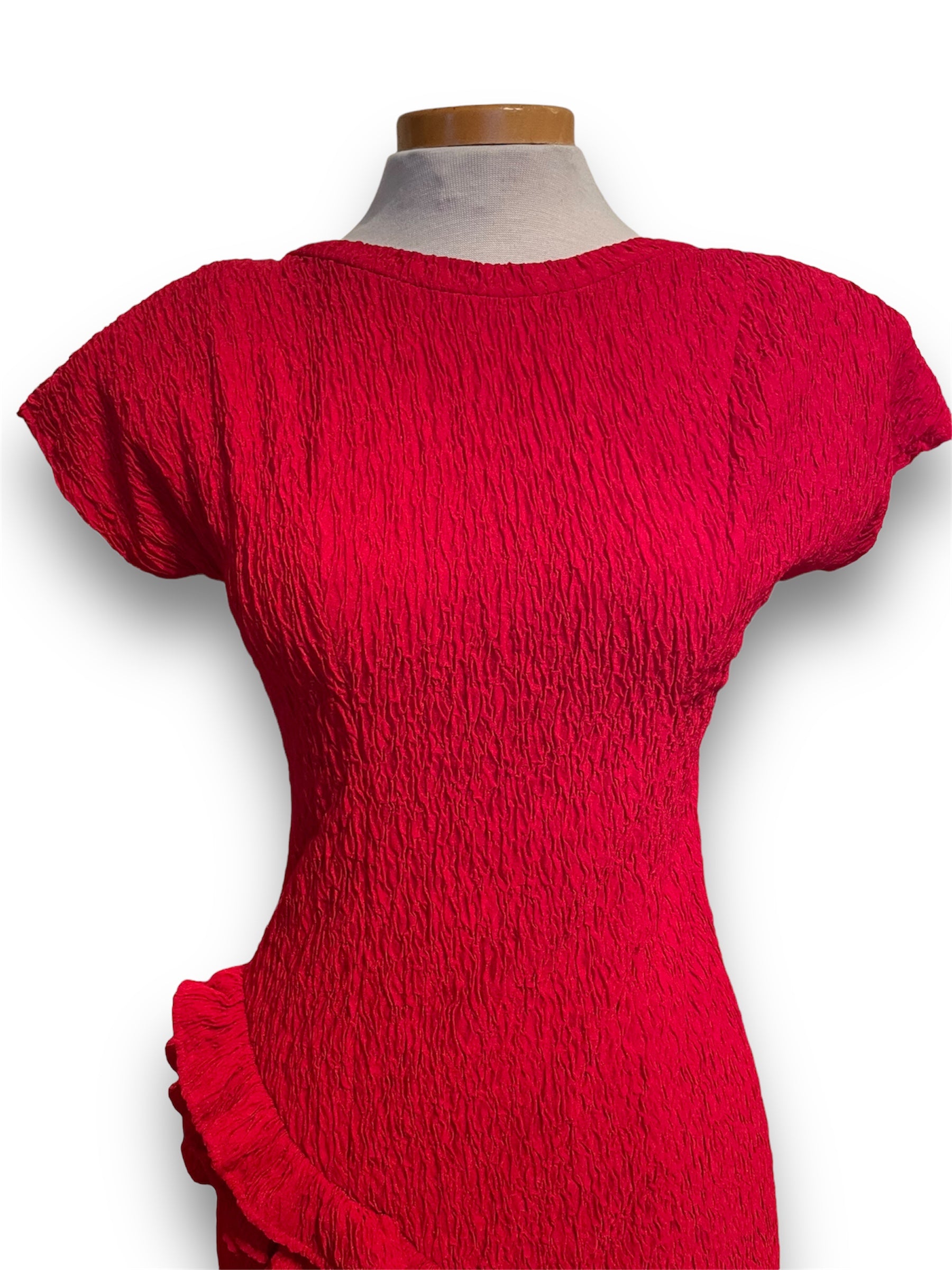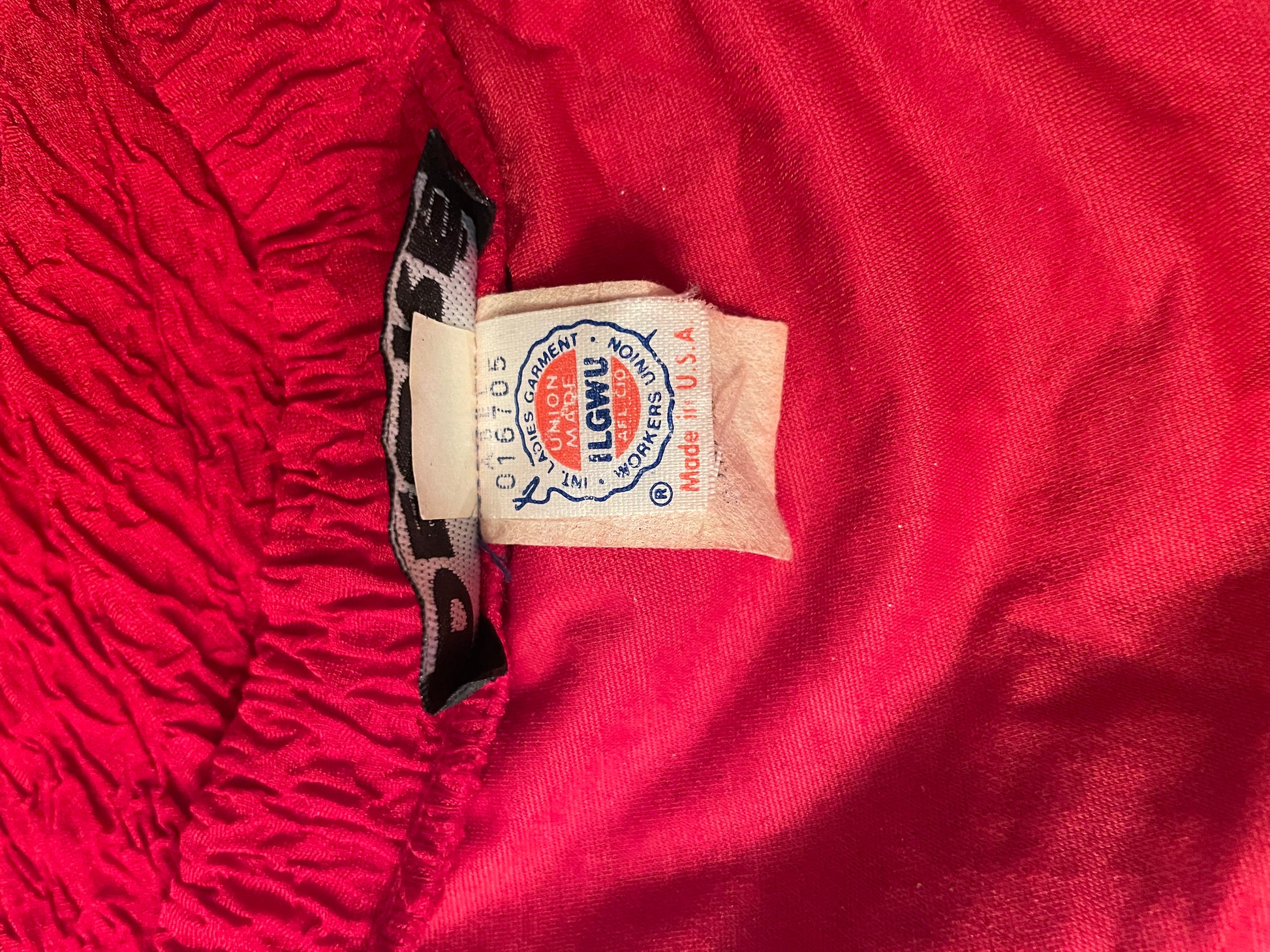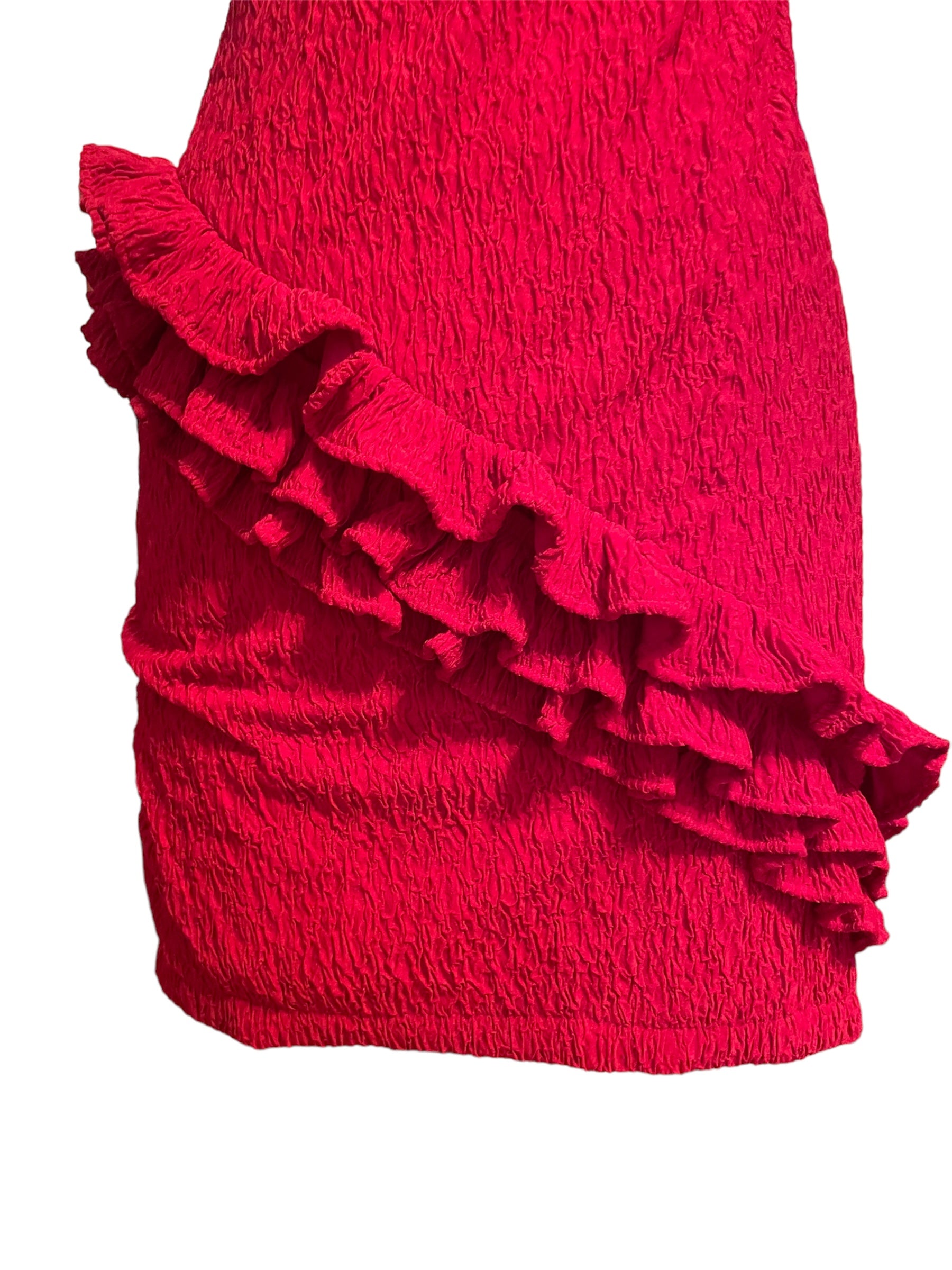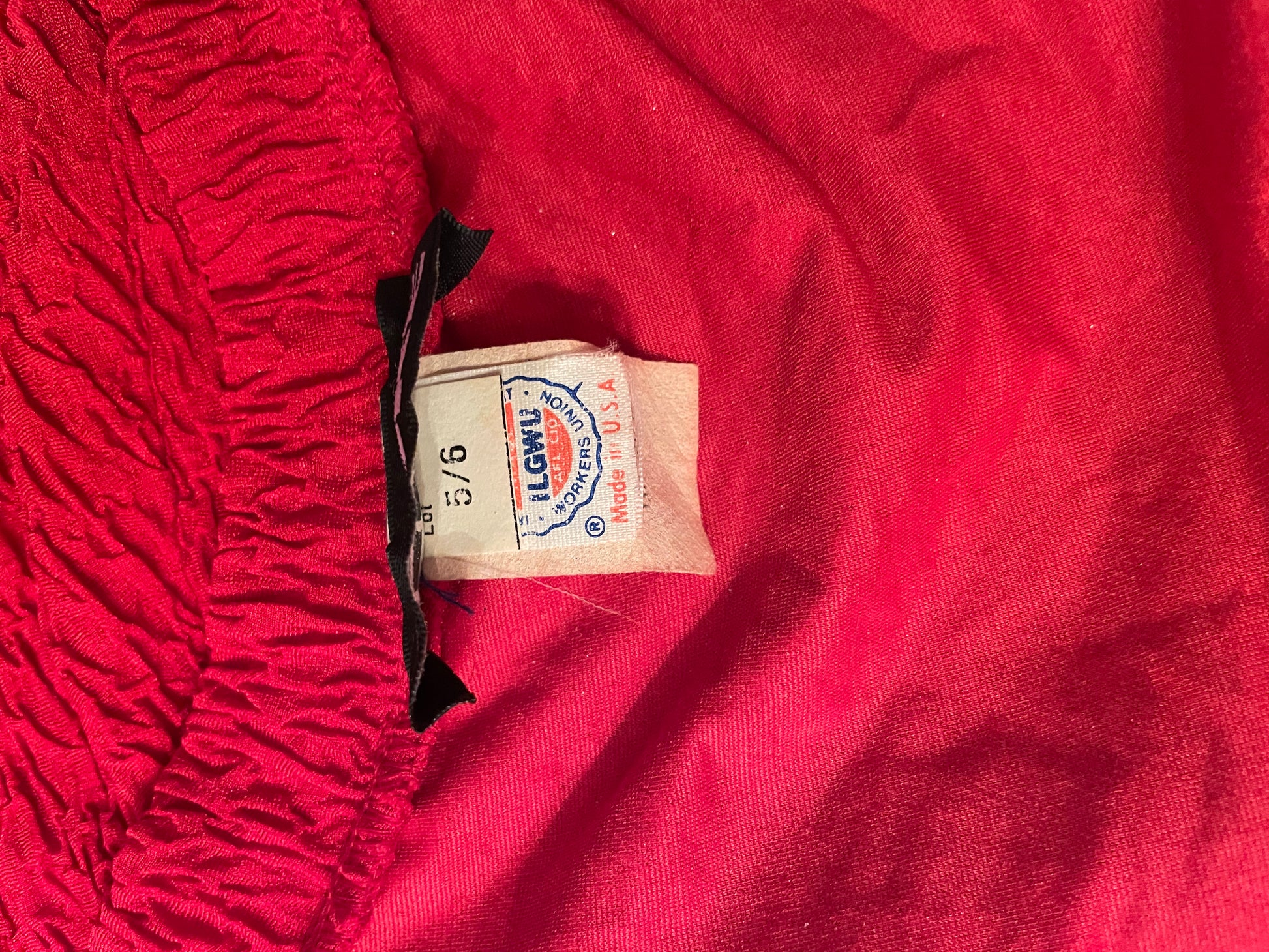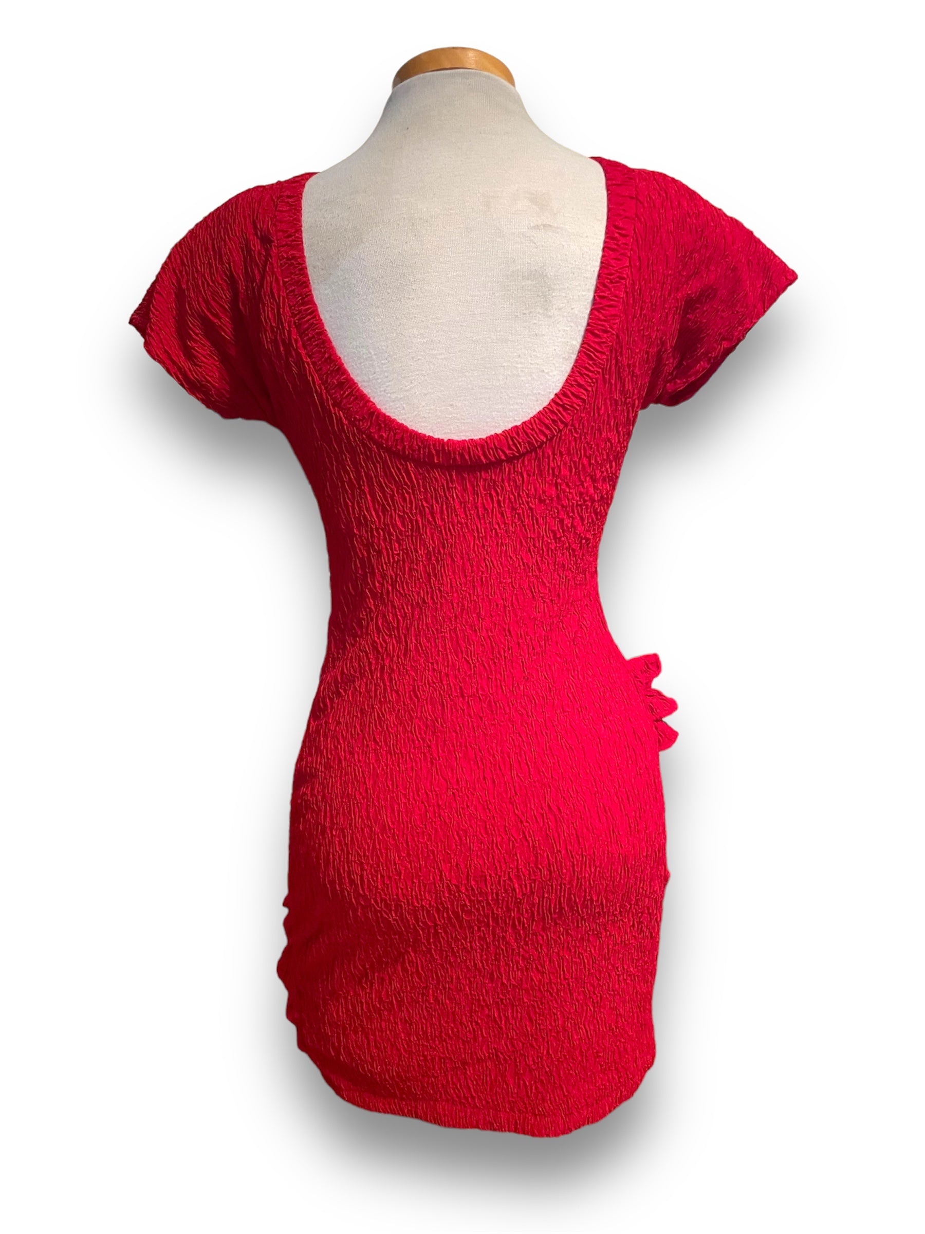 Vintage 1990’s Red ruffled party dress with a stretch crepe texture, low back and short sleeves. High boat neck and small shoulder pads. Designed by Degré size 5/6 made in California U.S.A. Still has hanging assistance in black lace.