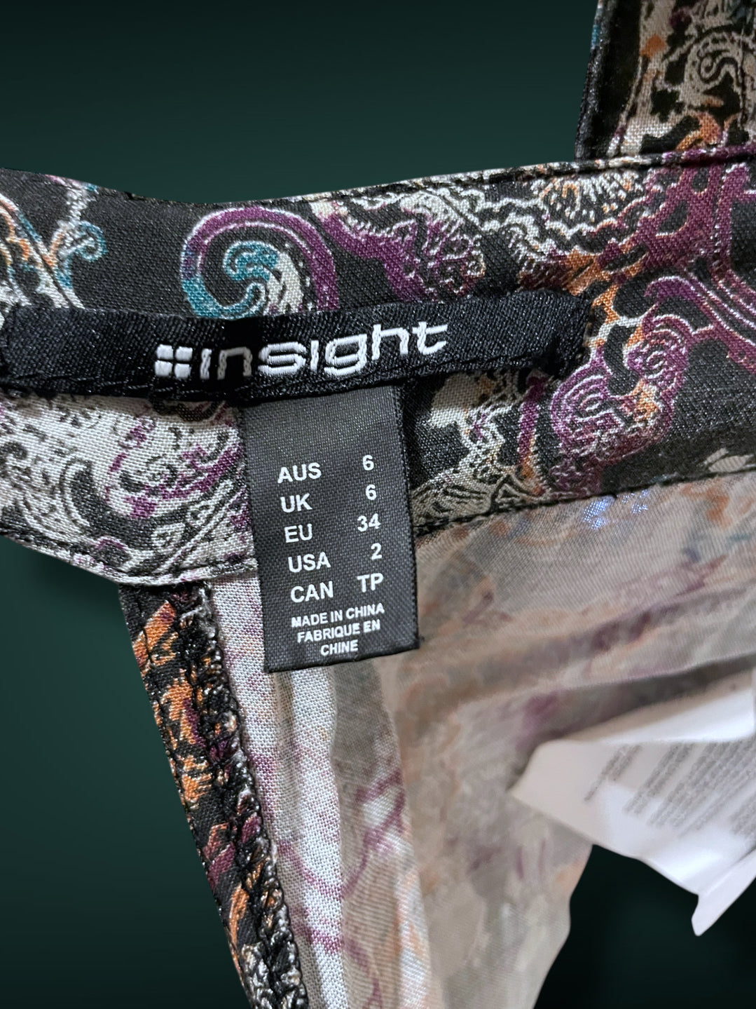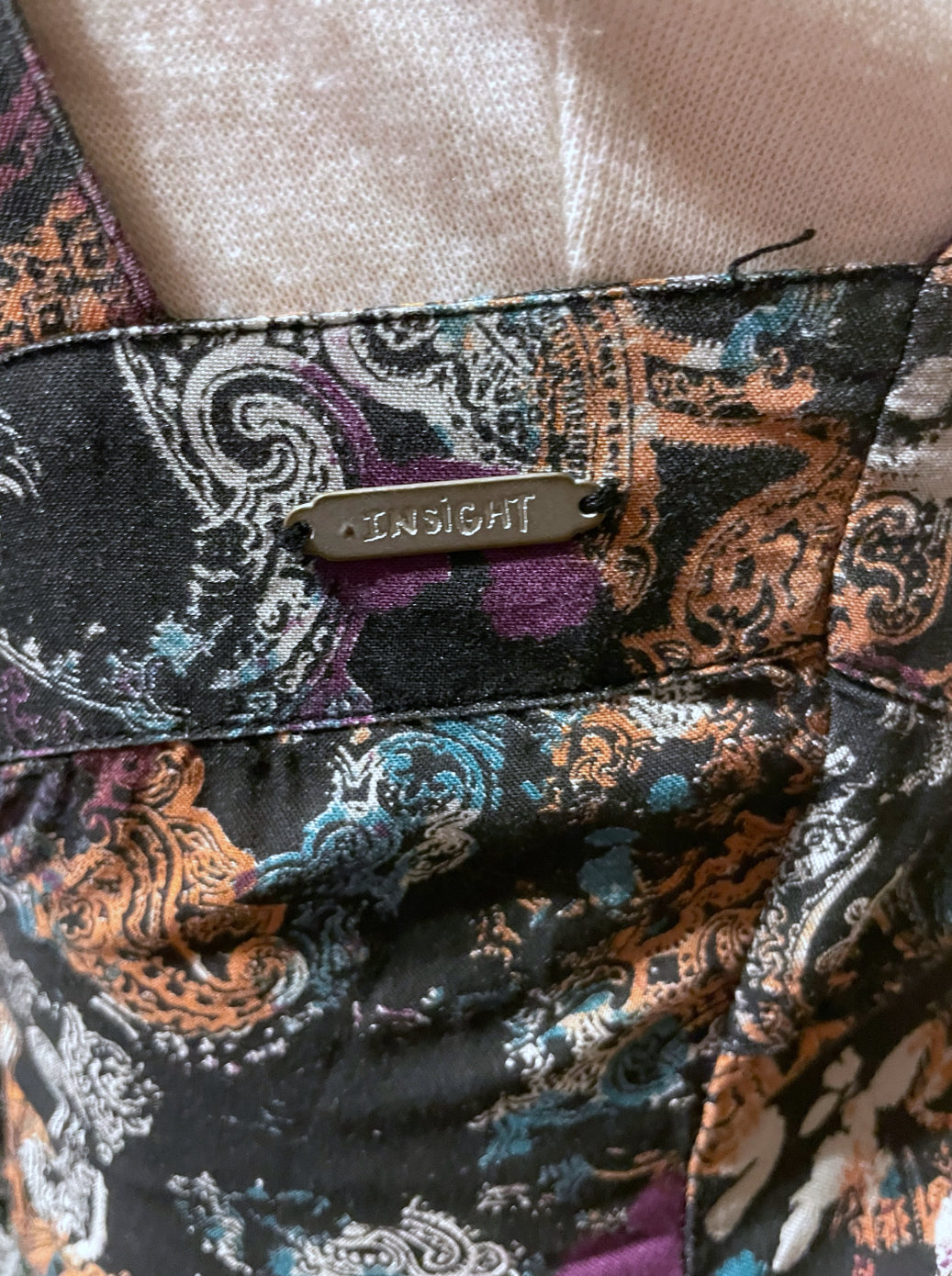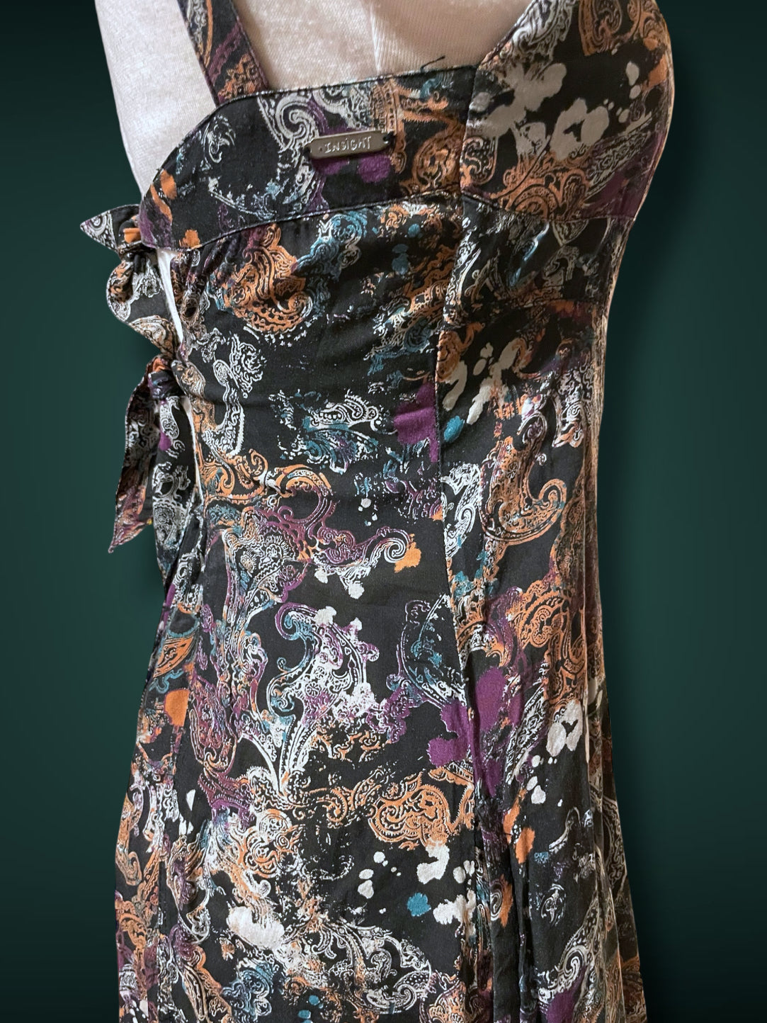 Super adorable vintage 1990’s sundress with a “bandana” paisley black and white print with “bleach” splatters in purple, teal, rust and white. Tank straps with open back with two tie straps across and elastic back. Low cut “cup” stitching with a double chevron waist. Flares out short skirt worn pockets on both hips. Metal designer brand tag on right side reads “insight” as does inside tag. Size US 2 / UK 6 / EU 34 / Aus 6 / Can TP 100% Viscose.