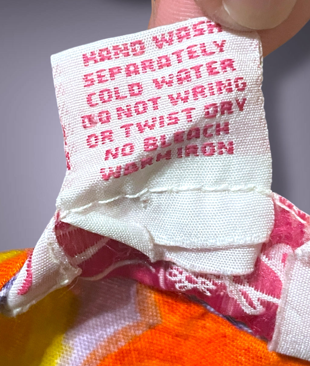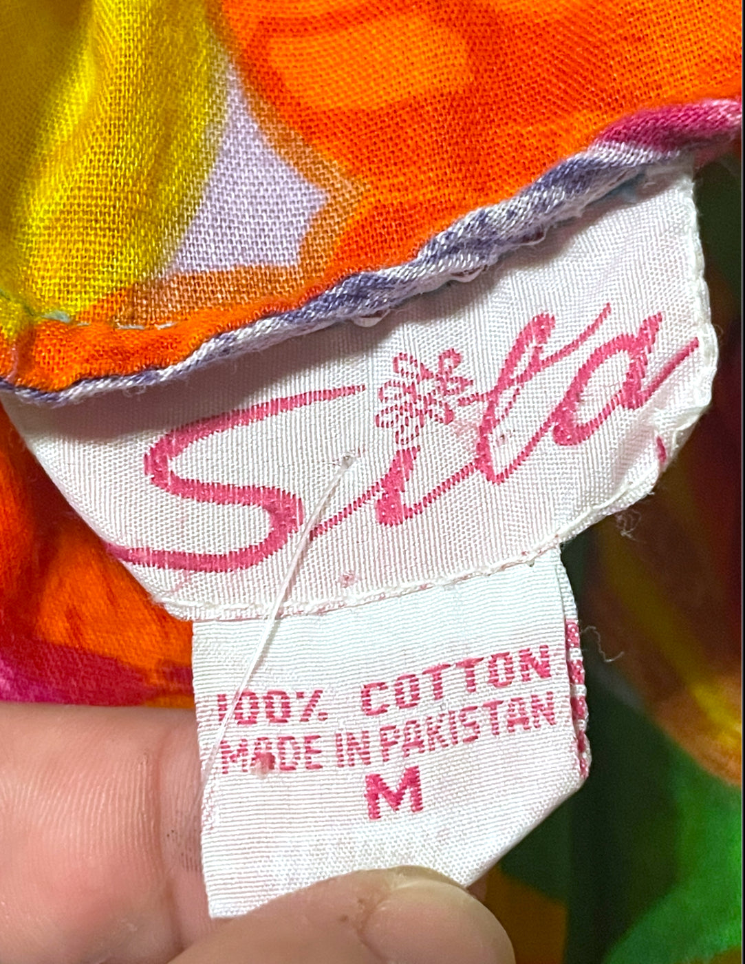 Super cute 1990’s brightly colored flowers & fruit print dress.  Blue button up front from waist to top.  Pockets on both sides of gathered skirt. Label says designer “Sita” 100% Cotton, Made in Pakistan, Size Medium.  No shoulder or sleeve seams, just a flat front. No stains or condition issues, one seam is starting to come loose on right side waist, easily fixed and show in photos.