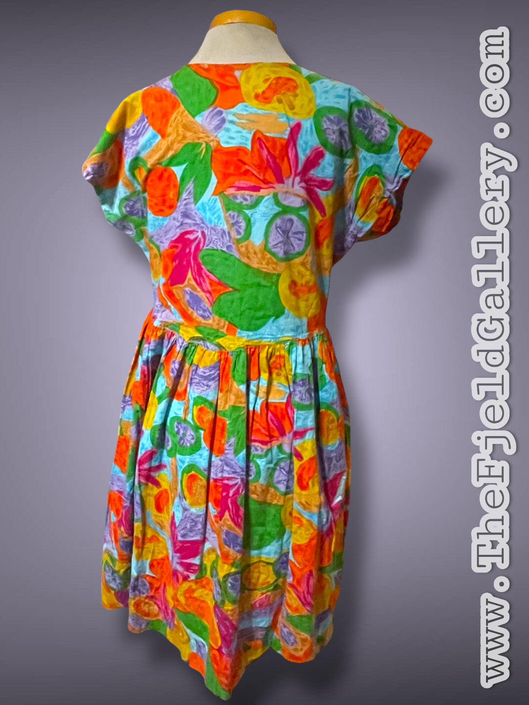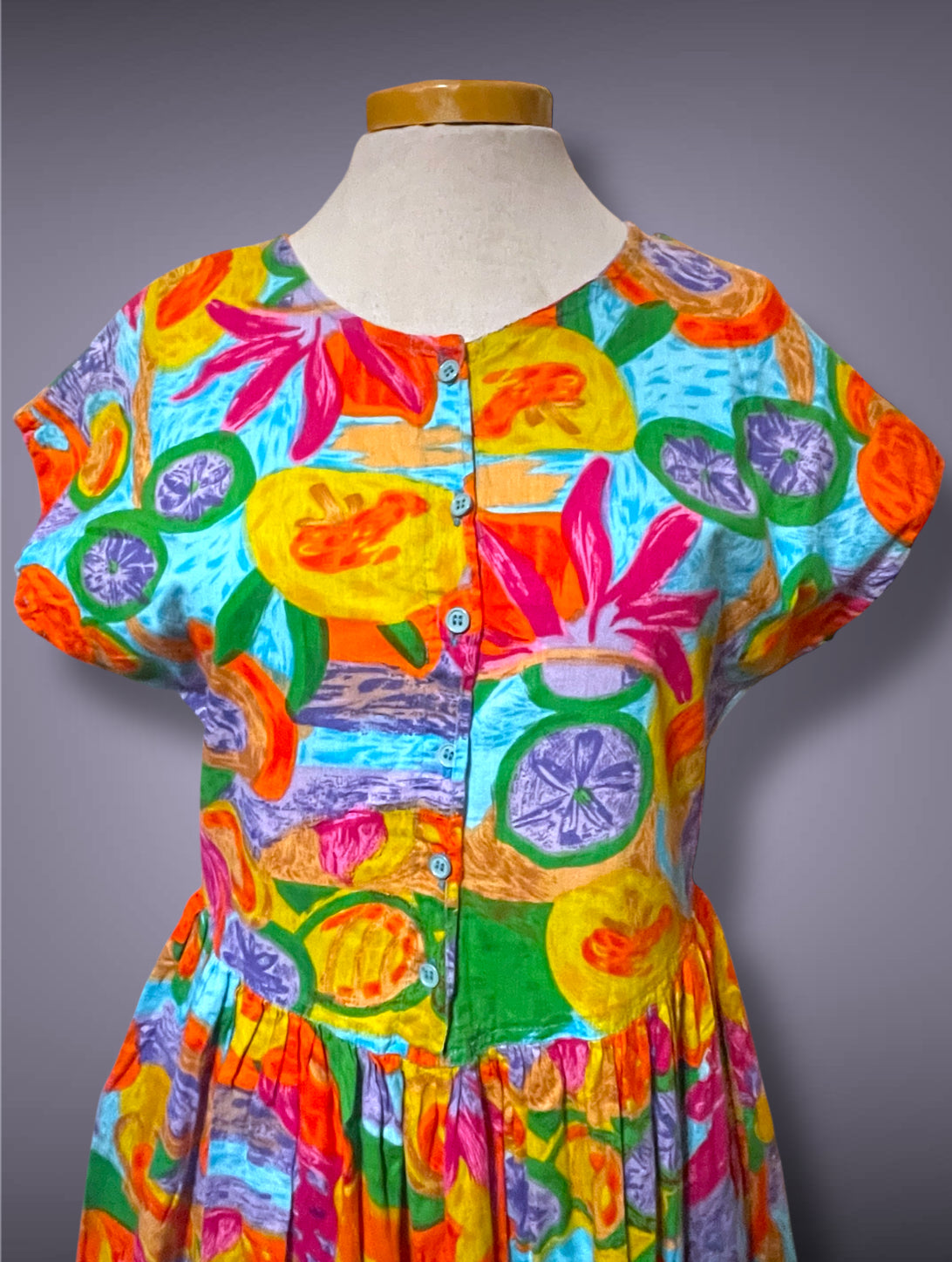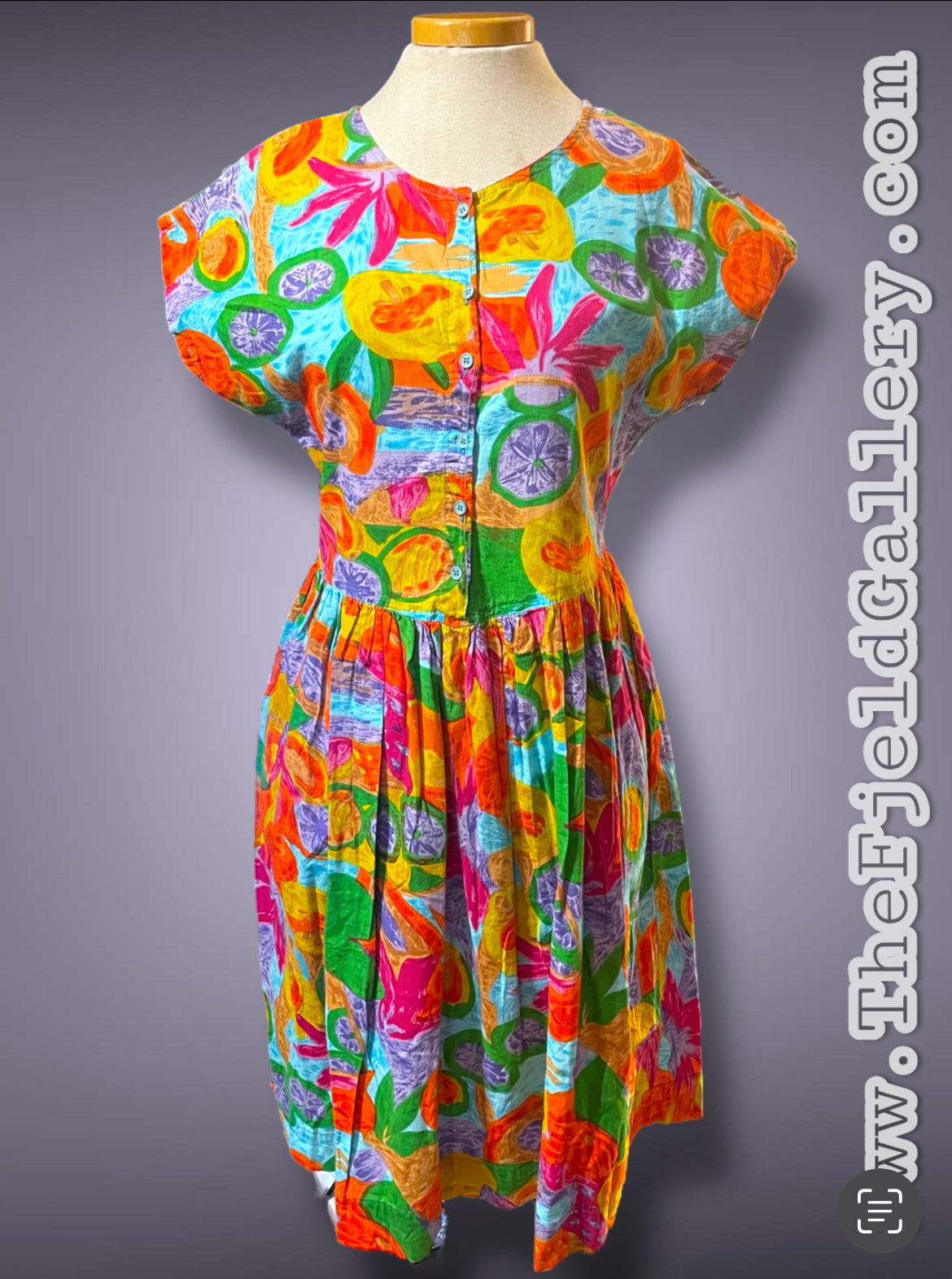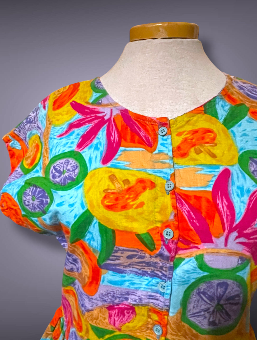 1990’s Bright Rainbow Flower & Fruit Pattern Button Bust Pocket Dress