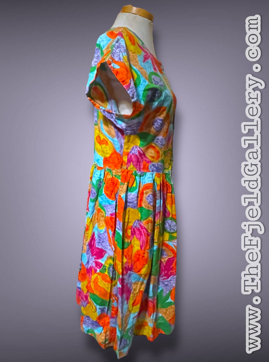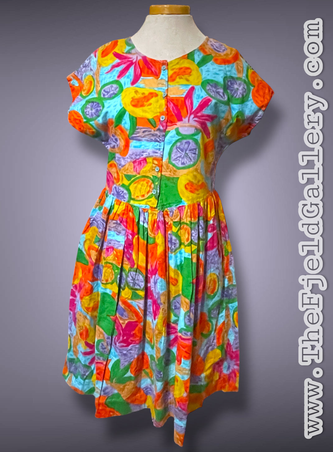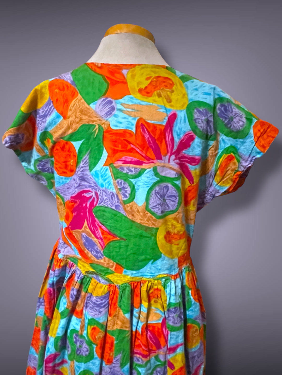 1990’s Bright Rainbow Flower & Fruit Pattern Button Bust Pocket Dress