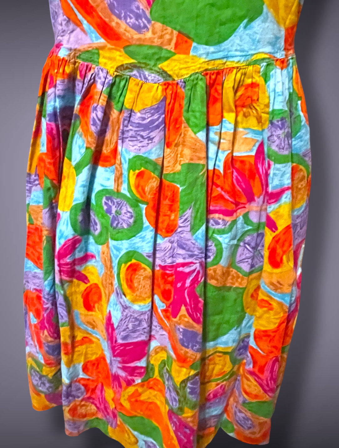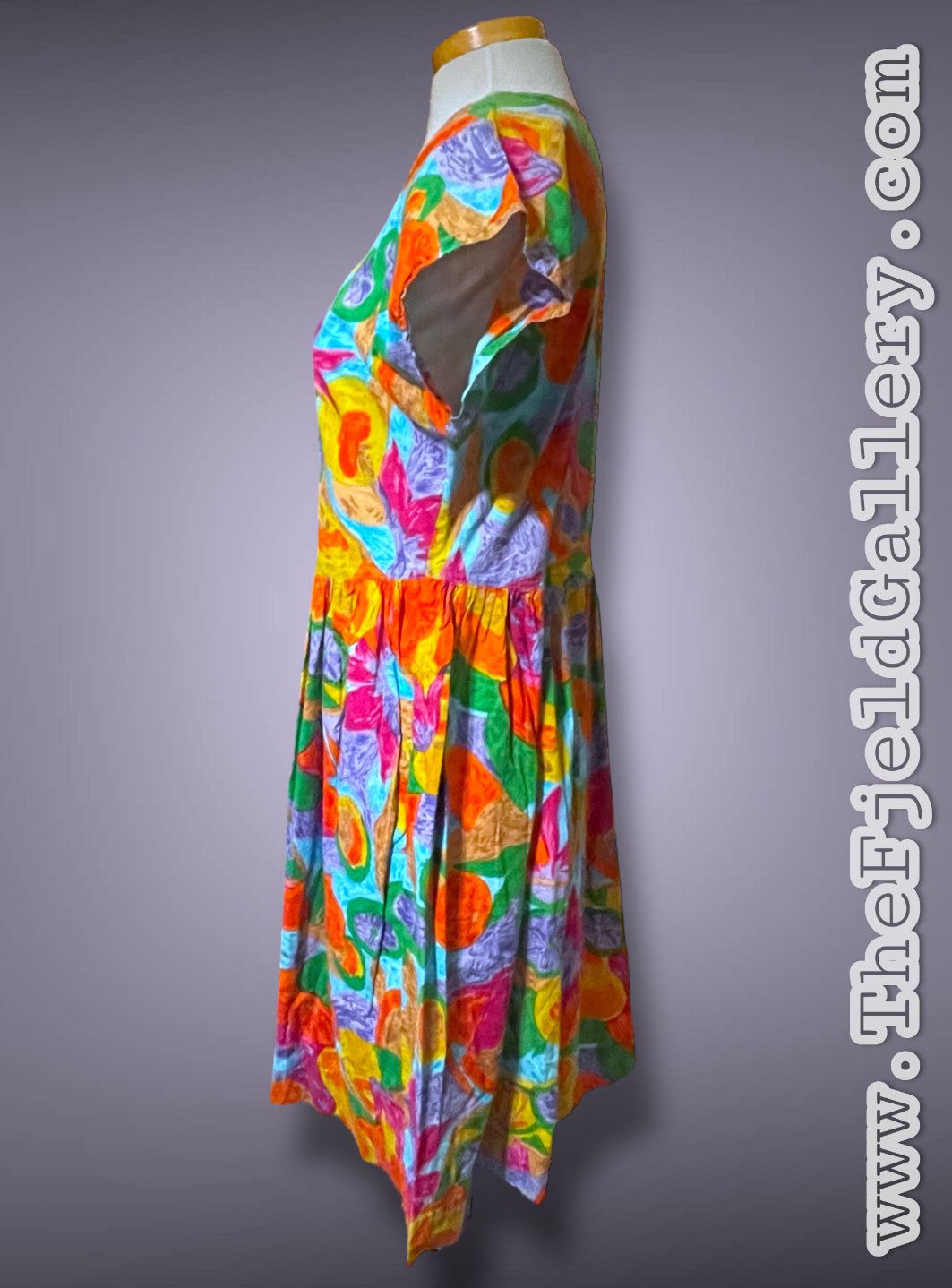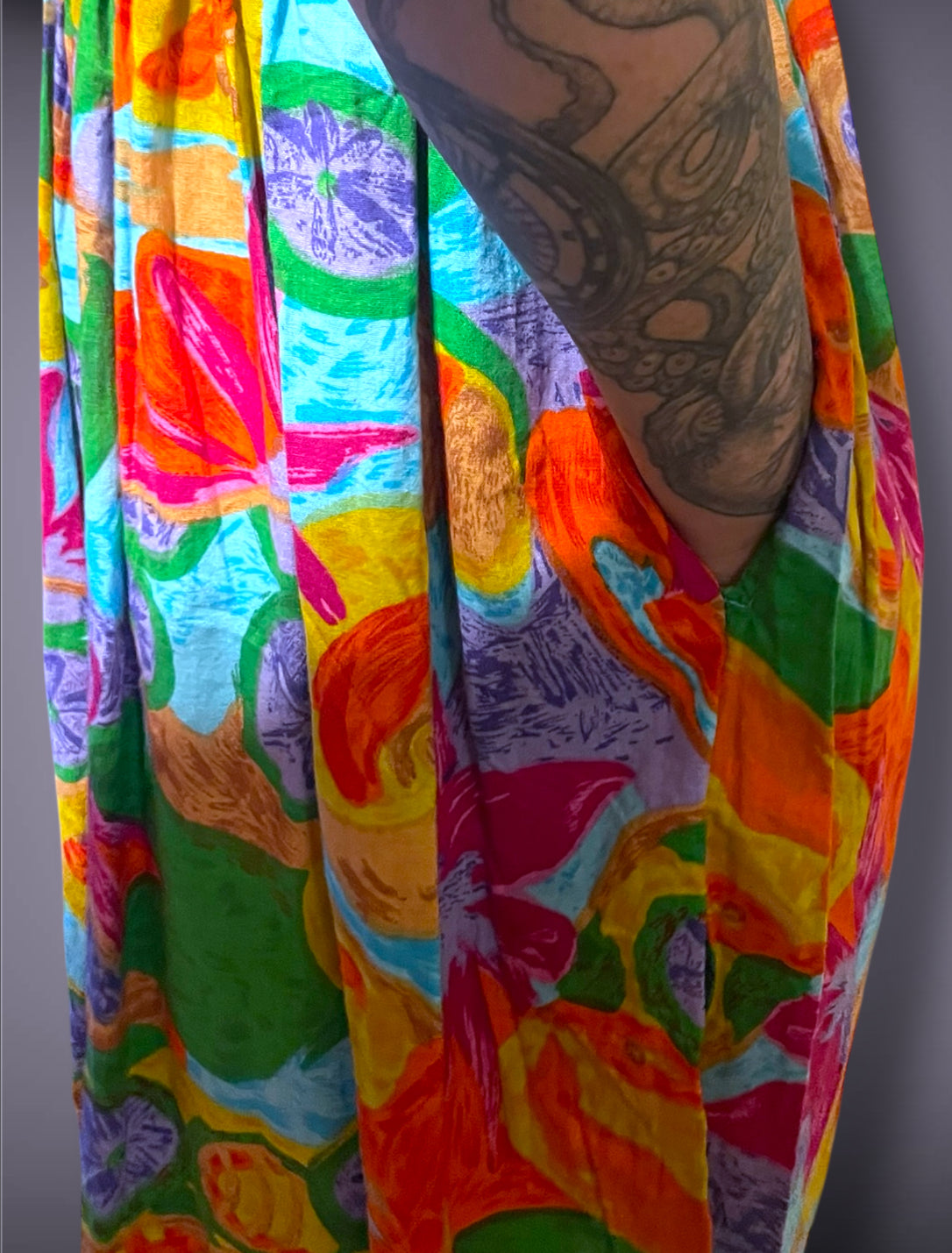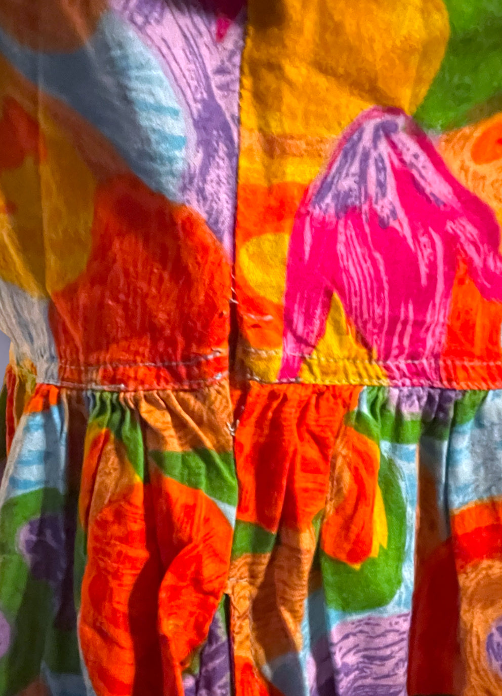 1990’s Bright Rainbow Flower & Fruit Pattern Button Bust Pocket Dress