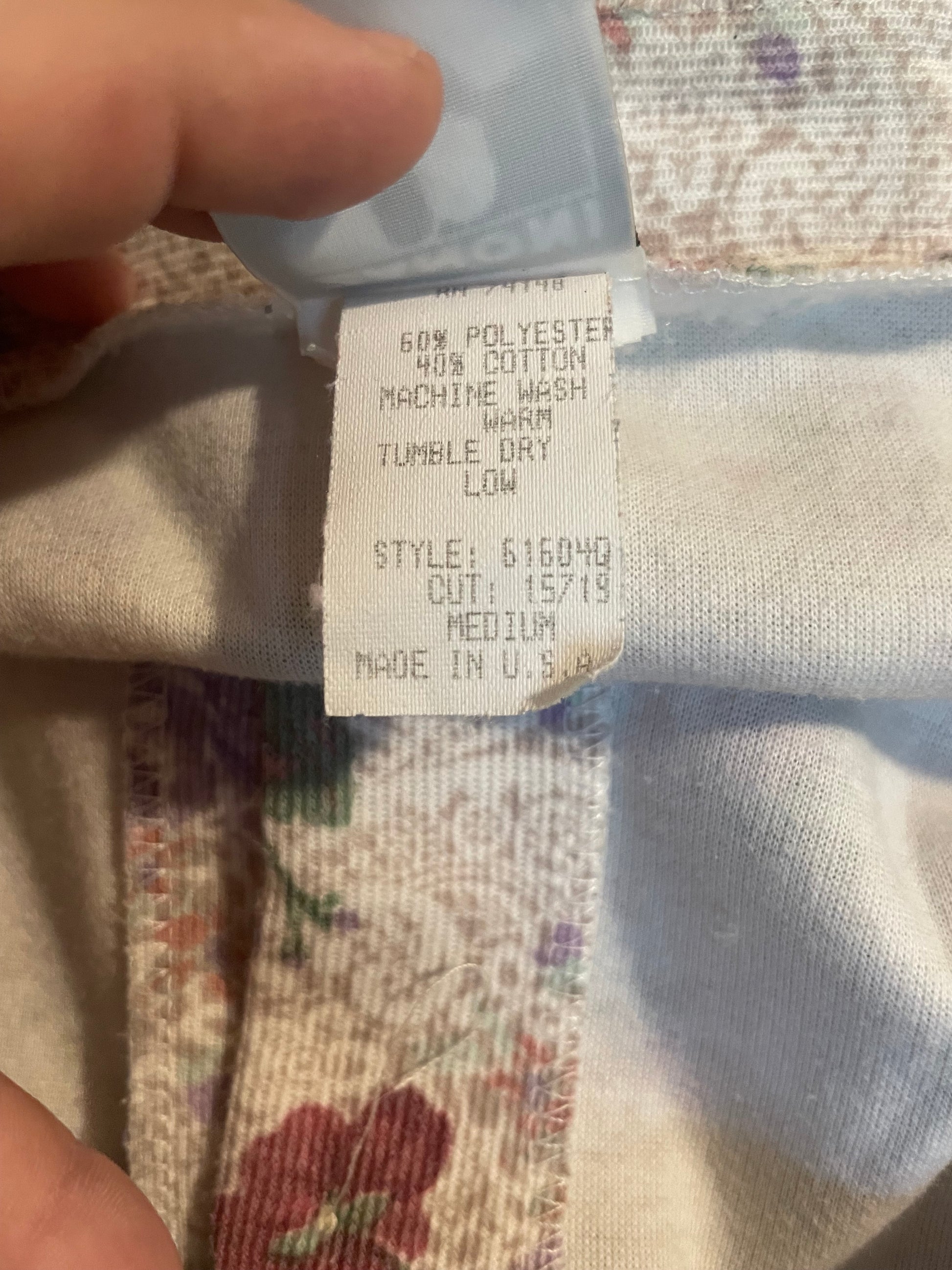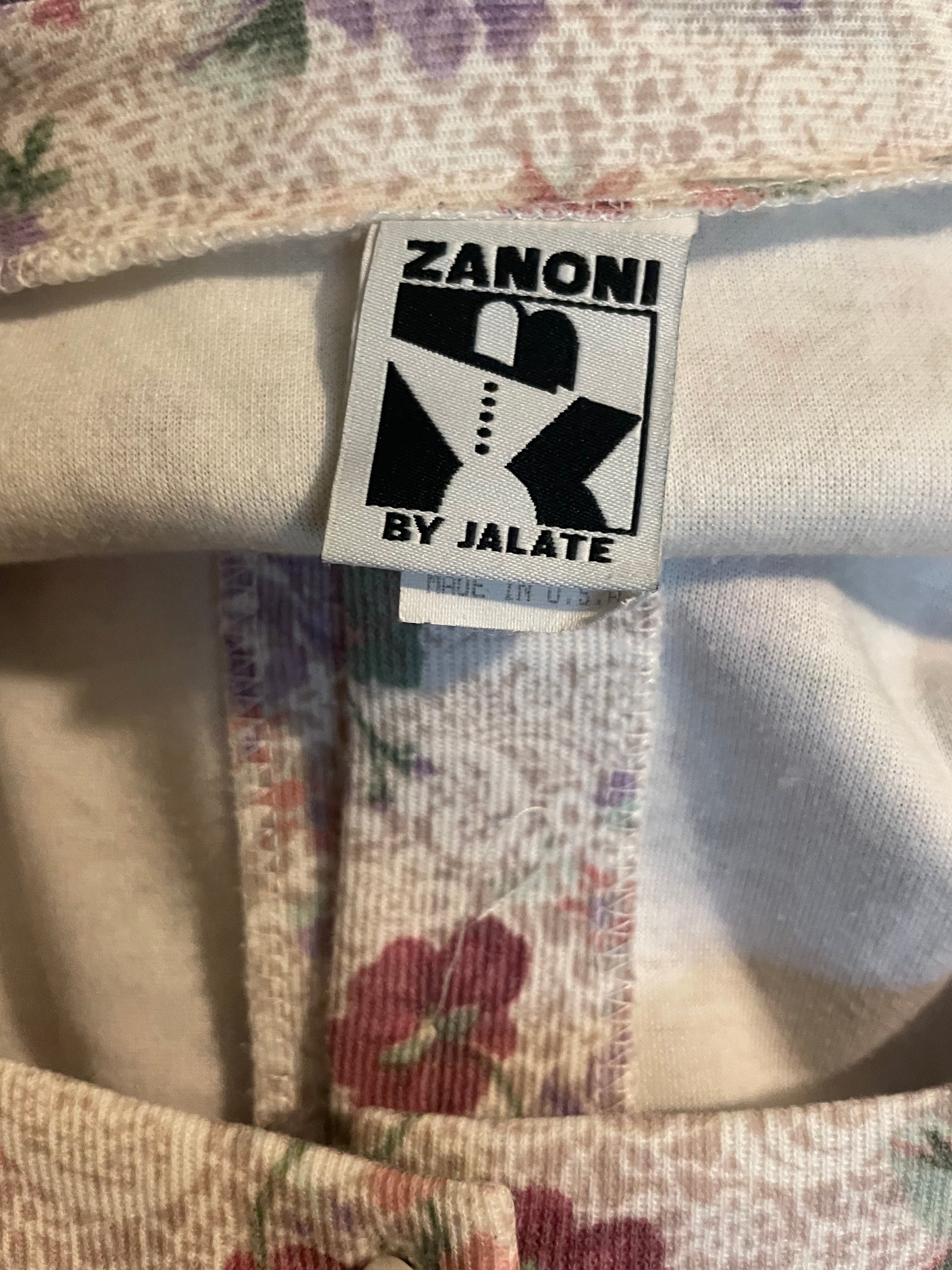 Absolutely adorable vintage 1990’s floral print dress. Long sleeves with shoulder pads and a scoop neck. Faux pearl buttons all the way up the dress from hem to neck. A-line, flare out cut with a ribbed texture fabric. Designer tag says “Zanoni by Jalate” Car tag says “Made in USA / Size Medium / 60% Polyester 40% Cotton” Fabroc does have good amount of stretch.