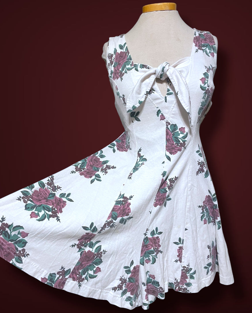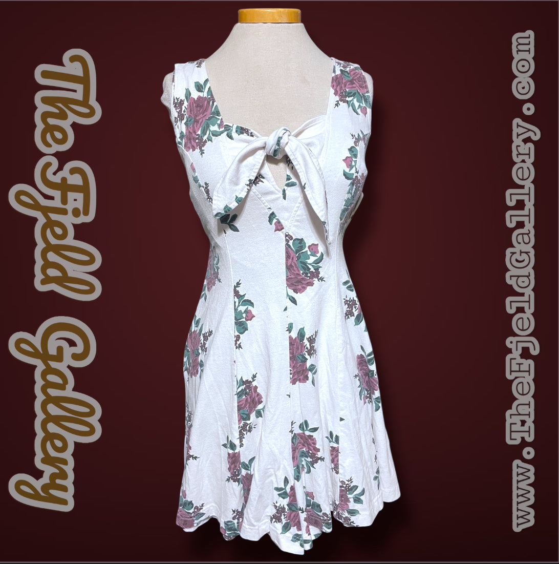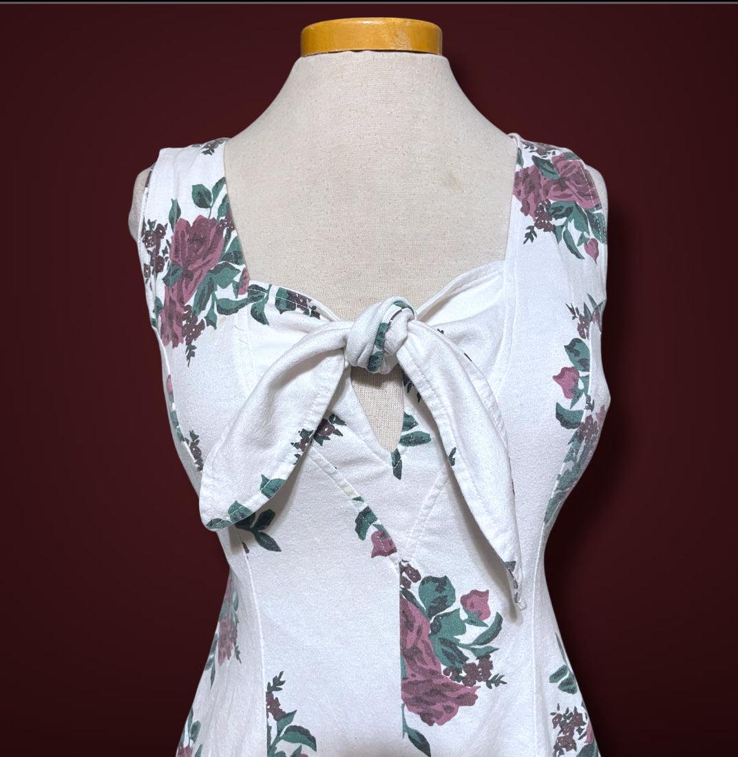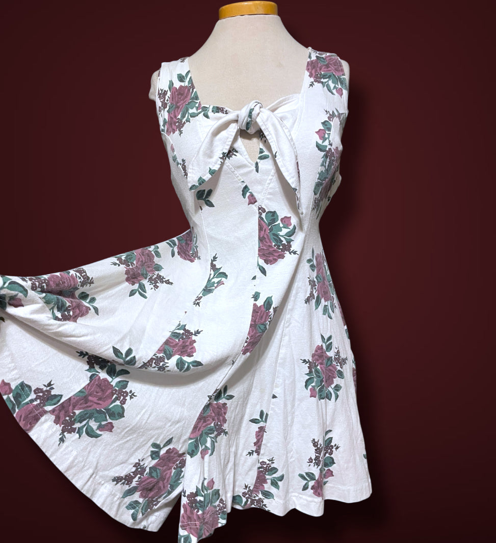 Super cute vintage 1990’s white & purple rose print romper. Short sleeve tank top with a tie front bust detail. Zipper closure up the back. Tag says “Sporting Club” and size care tag says “Medium / Cotton 60% Polyester 40% / Made in Hone Kong”