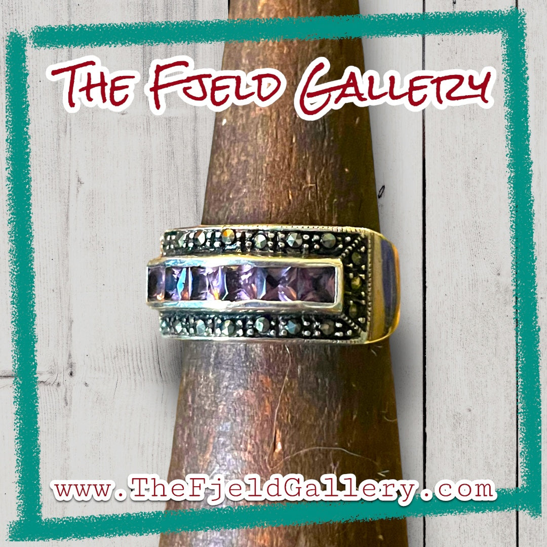 Amethyst Channel Set Sterling Silver & Marcasite Wide Band Ring