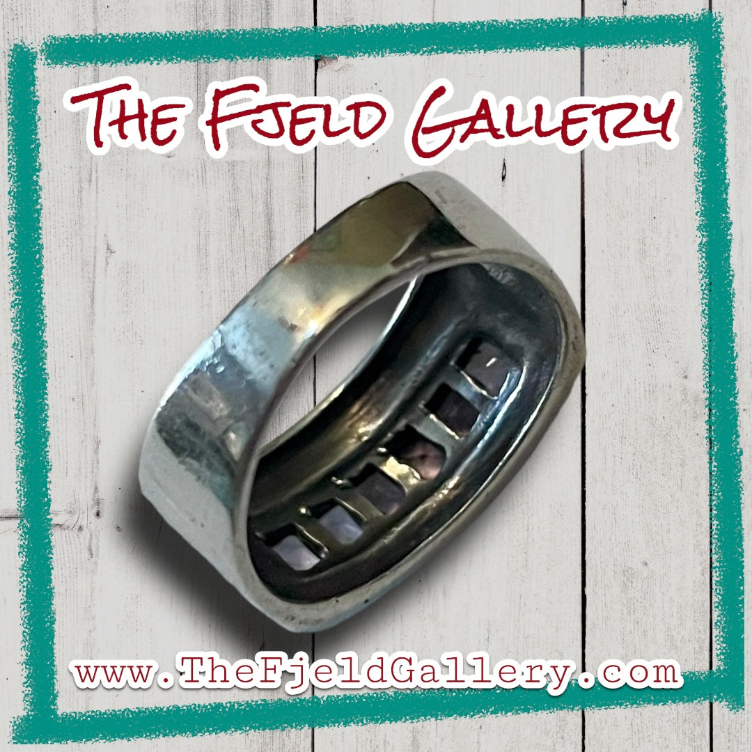 Beautiful square faceted sparkling amethyst gemstones channel set in a sterling silver wide band setting with marcasites.