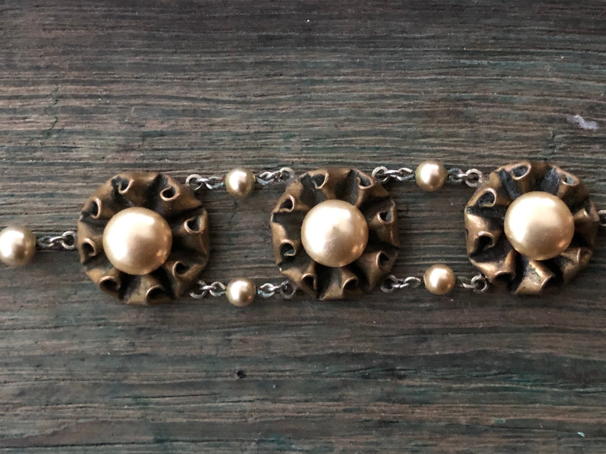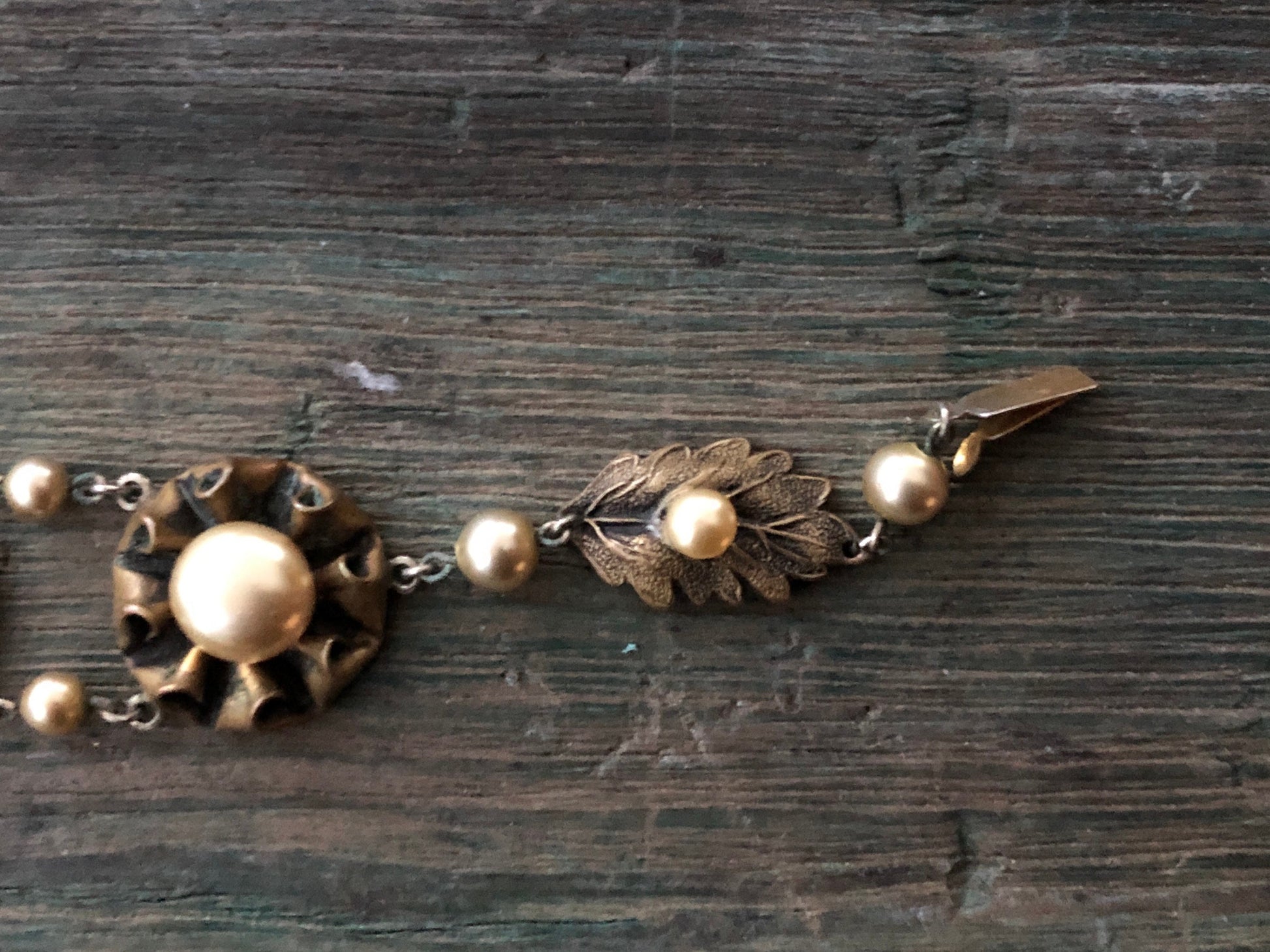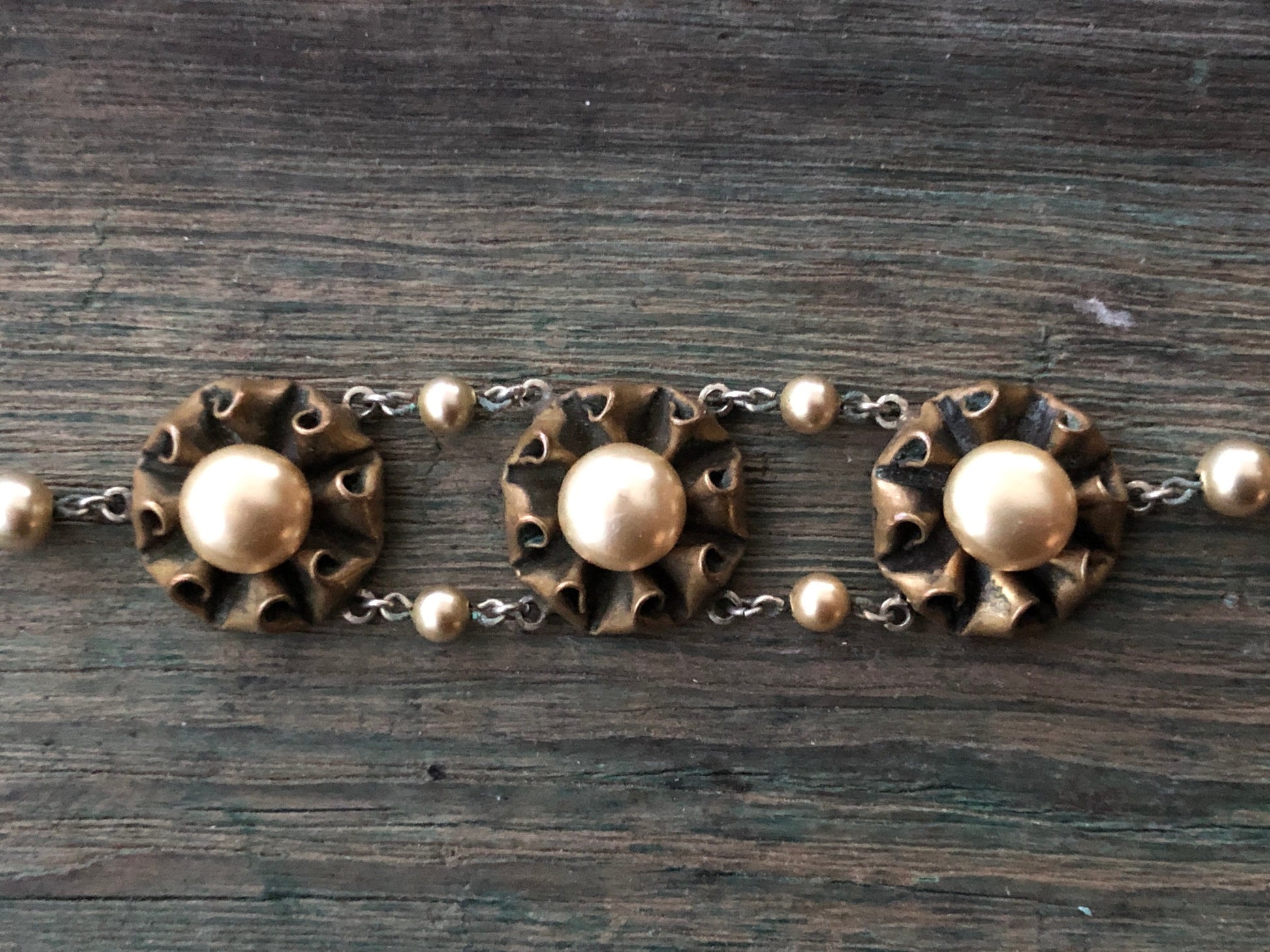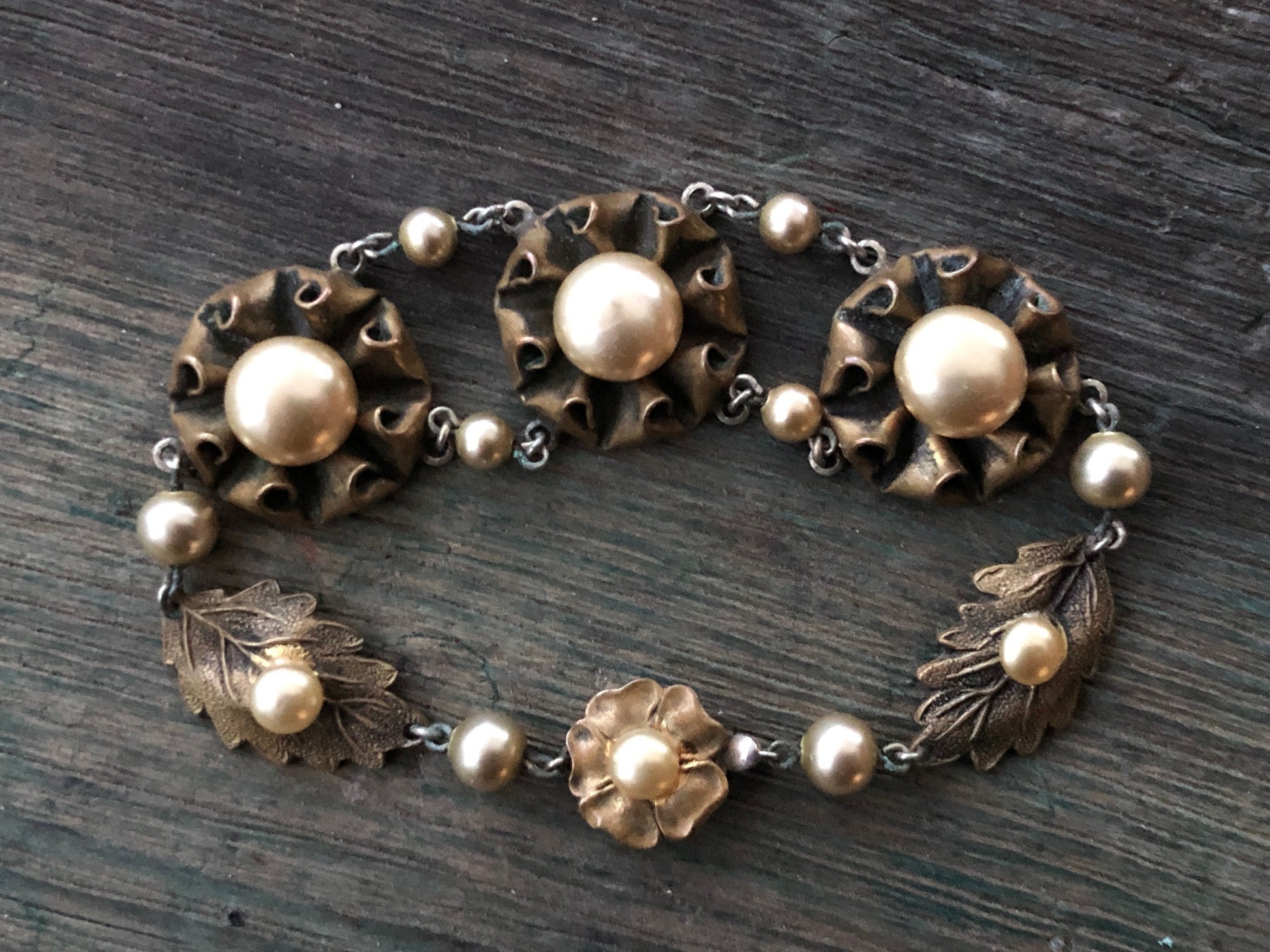 Antique Art Nouveau Brass Leaf & Pearl Flower Link Bracelet