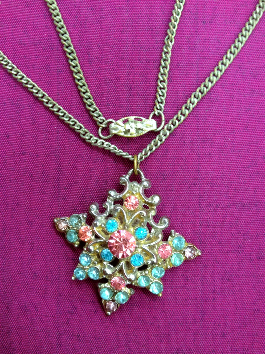This is a gorgeous antique Victorian art nouveau design silver pot metal fruit salad pendant necklace. Sparkling multi colored crystal rhinestones in powder pink, blue and purple. Original flower clasp. No missing stones, some yellowing of adhesive visible.