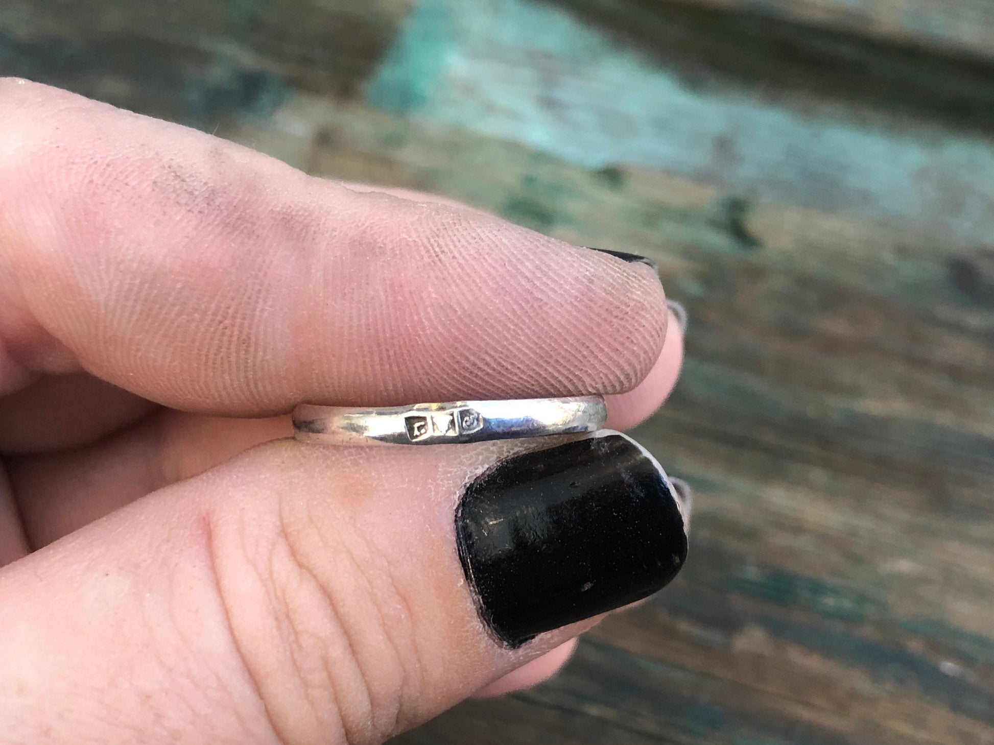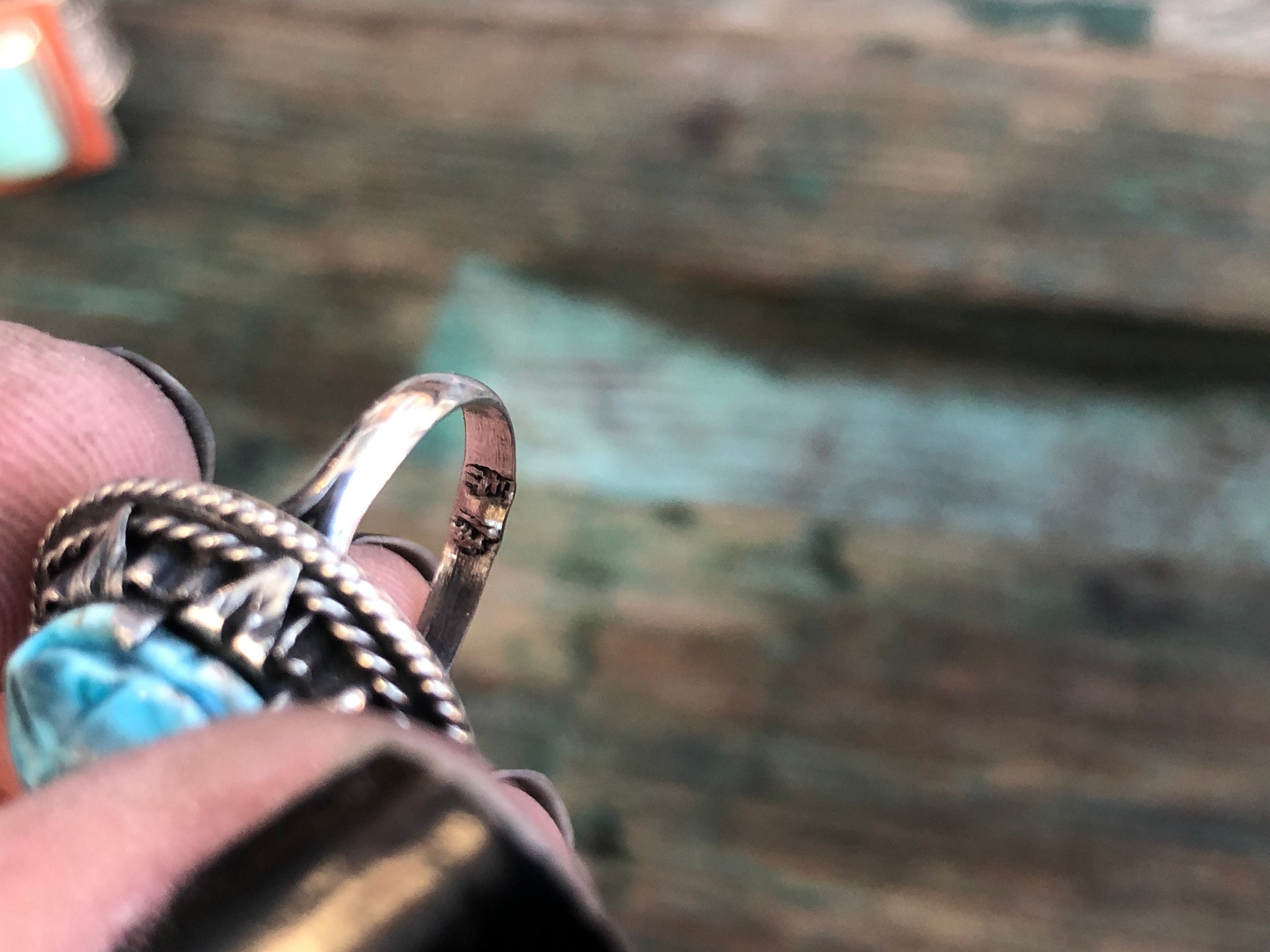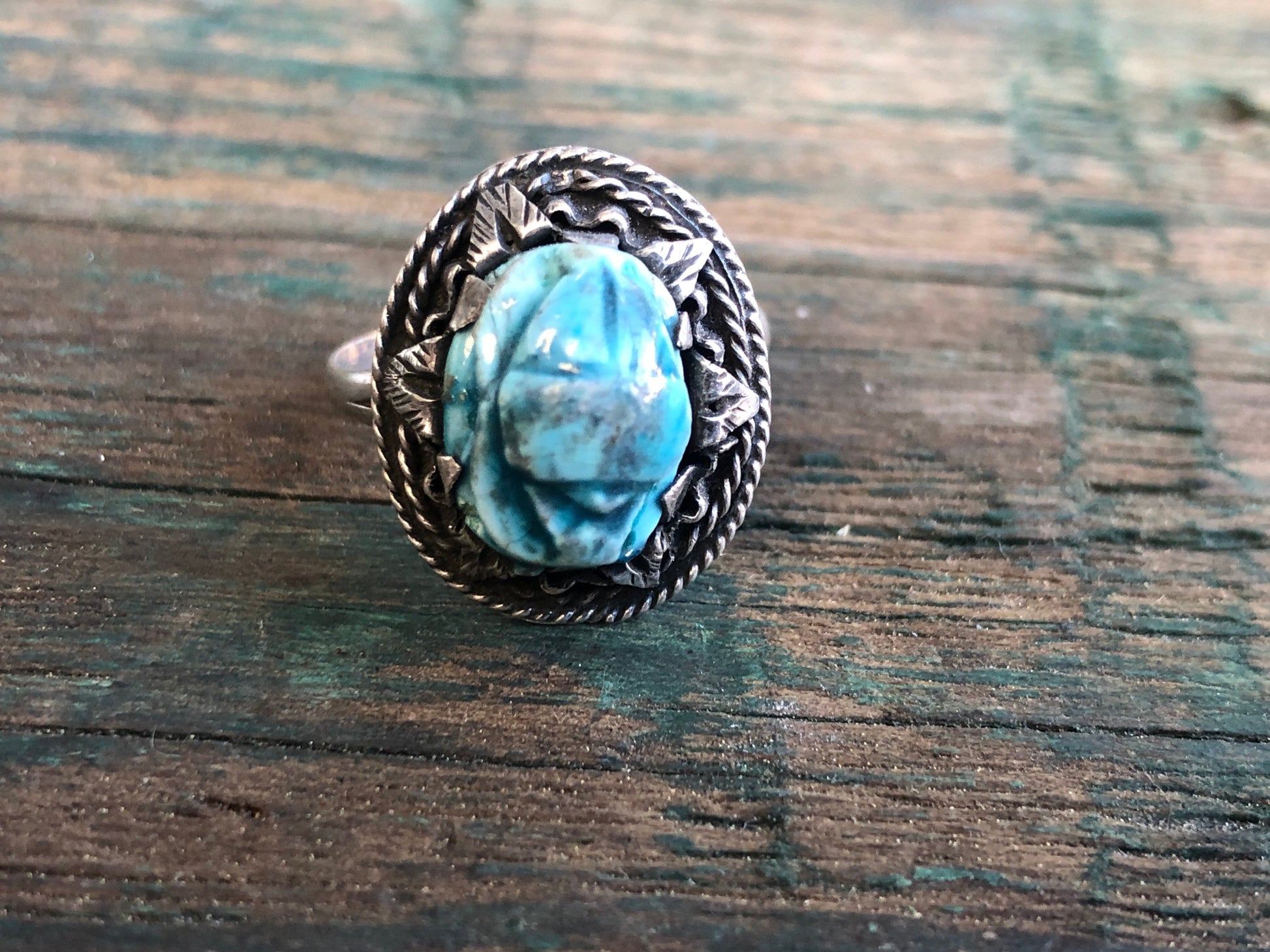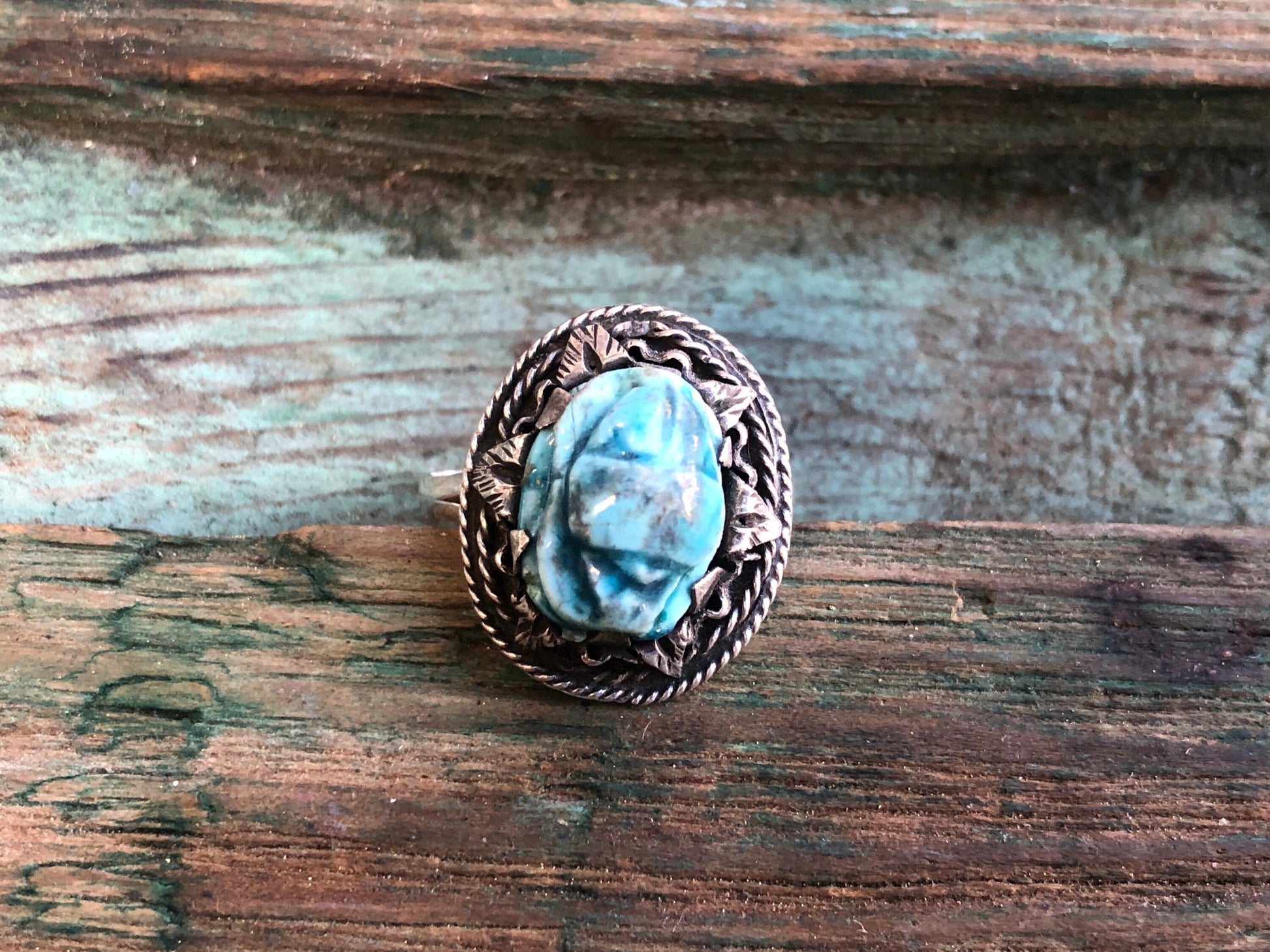 Antique Blue Enamel Scarab Sterling Silver Art Nouveau English Hallmarked Ring. This is one of my favorite pieces! Egyptian handmade & Blue enameled scarab beetle prong set in sterling silver Geometric, multi level setting with Engraved triangles and rope detailing. Hallmarked on inside and outside of ring band. I’ve tried to research the hallmarks but couldn’t find the exact maker, but believe they are English hallmarks c.1915