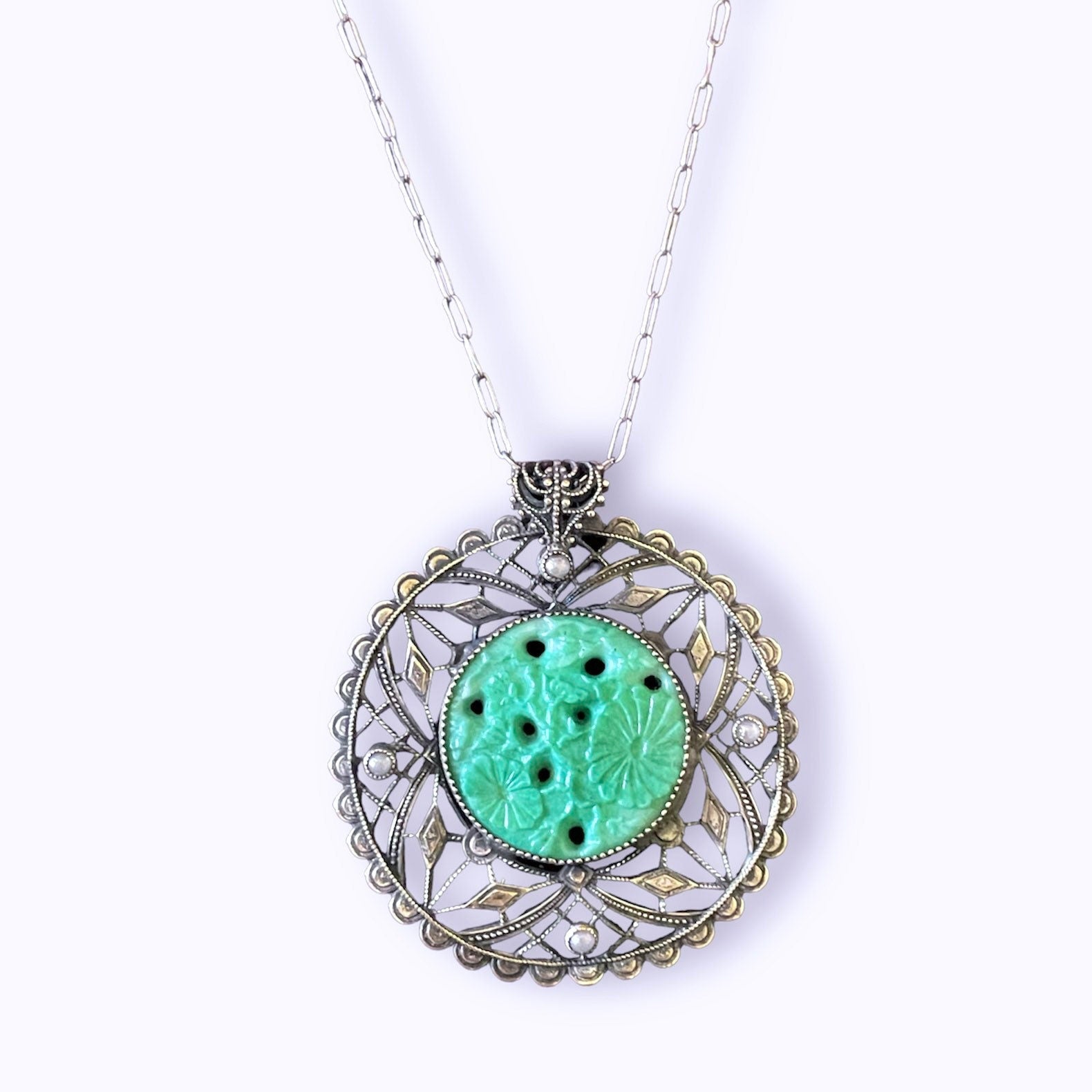 Antique Sterling Silver Filigree, Pearl & Molded Jade Peking Glass Pendant Necklace