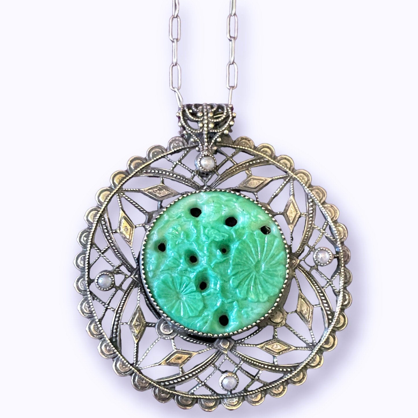 Beautiful sterling silver long chain necklace with bezel set molded peking jade art glass pendant surrounded by small bezel set pearls around it. Gorgeous floral design in the art glass and a geometric triangle and circular filigree openwork design around the green jade floral art glass. Very intricate and beautiful.
