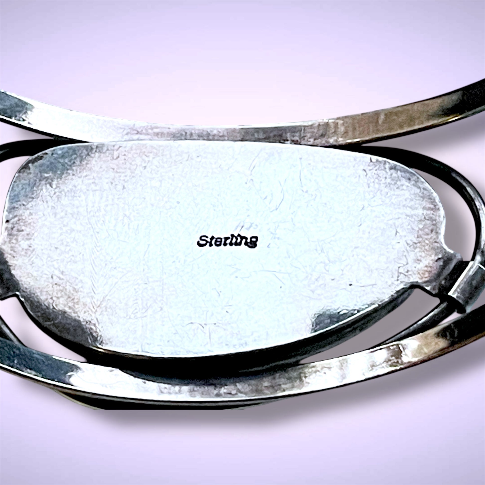 Gorgeous chunky & wide double cuff bracelet with a free swinging scalloped bezel set huge blue sodalite gemstone cabochon. Double half round sterling wire squaring off and connected with additional half round sterling wire.  Round sterling wire surrounding the full backed bezel set cabochon that is attached with some wide attached sterling sheet.  Hallmarked “Sterling” on the back in a nice script stamping.   Weighs 32g.  Measures 6.25” from end to end with an additional adjustable gap measuring plus or minus 45mm.  Each of the half round wires are 4mm wide. Center stone is 40mm by 22mm.  The ends of the bracelet are 20mm long(making the cuff 20mm wide.