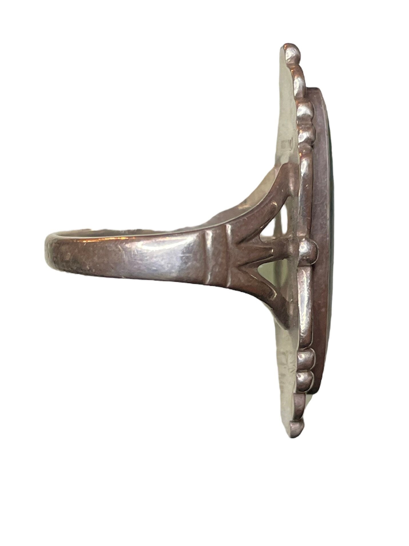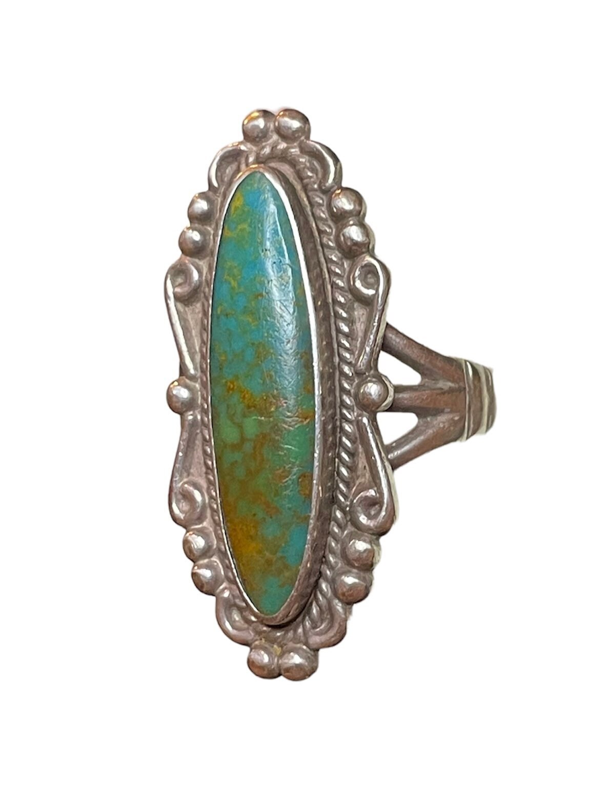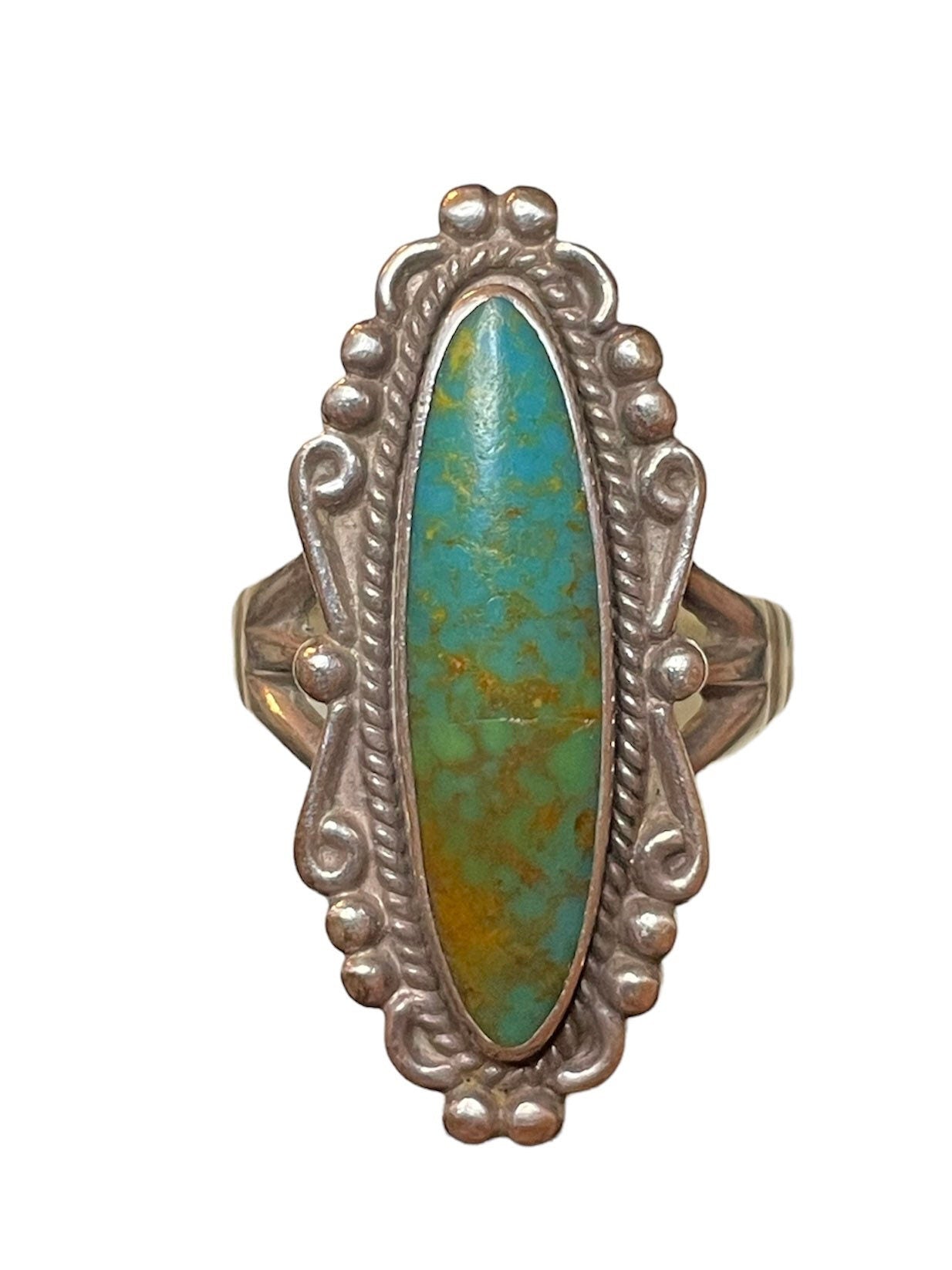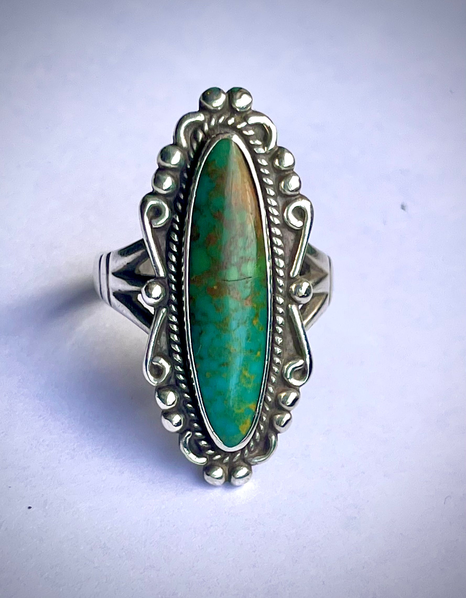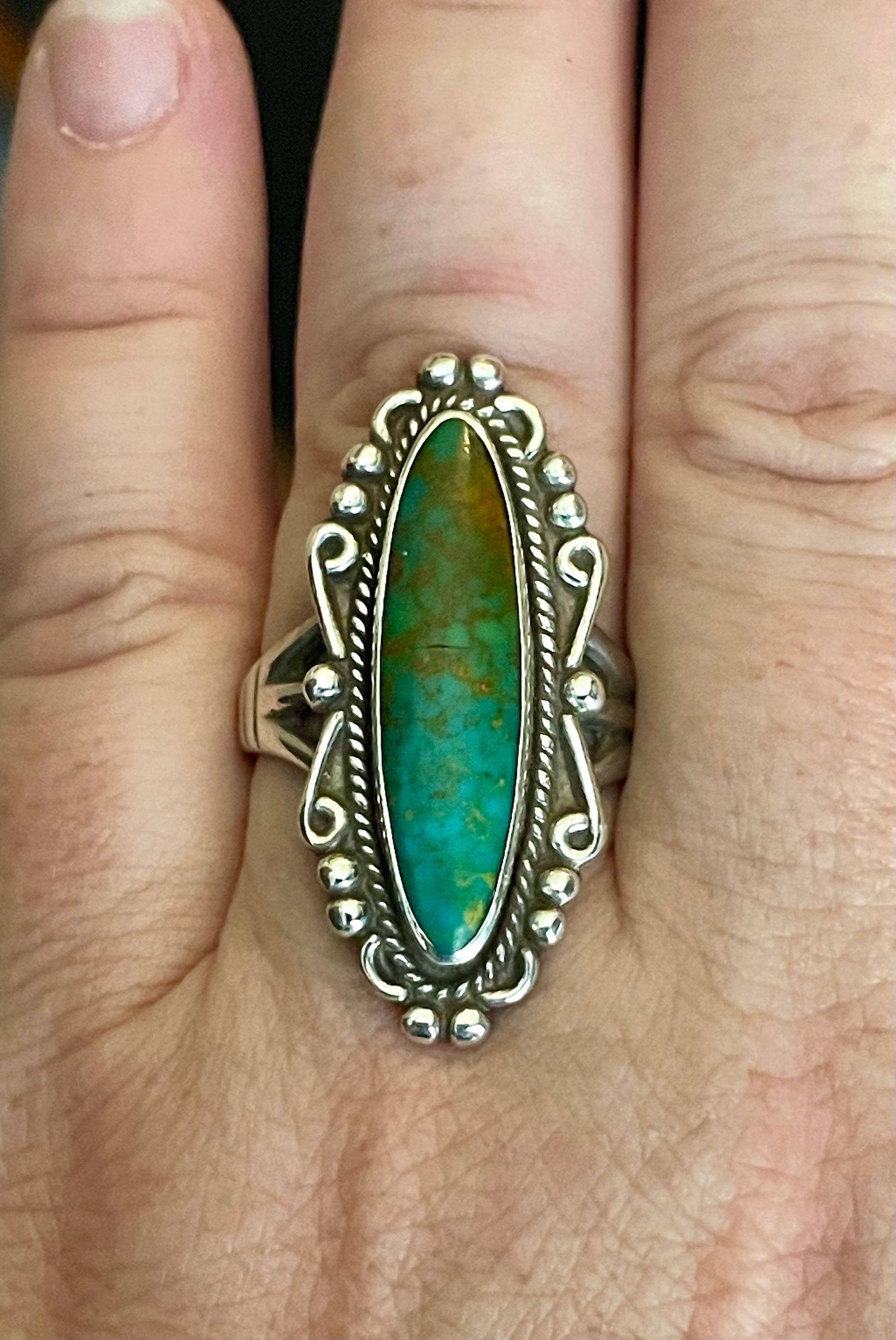 Gorgeous greenish blue turquoise with brown inclusions long cabochon bezel set in sterling silver setting. Surrounded by rope detailing and scrolling with raindrops. 3.5 mm single half round band. ring face is 35mm long by 15mm wide. Cabochon is 27mm by 8mm.