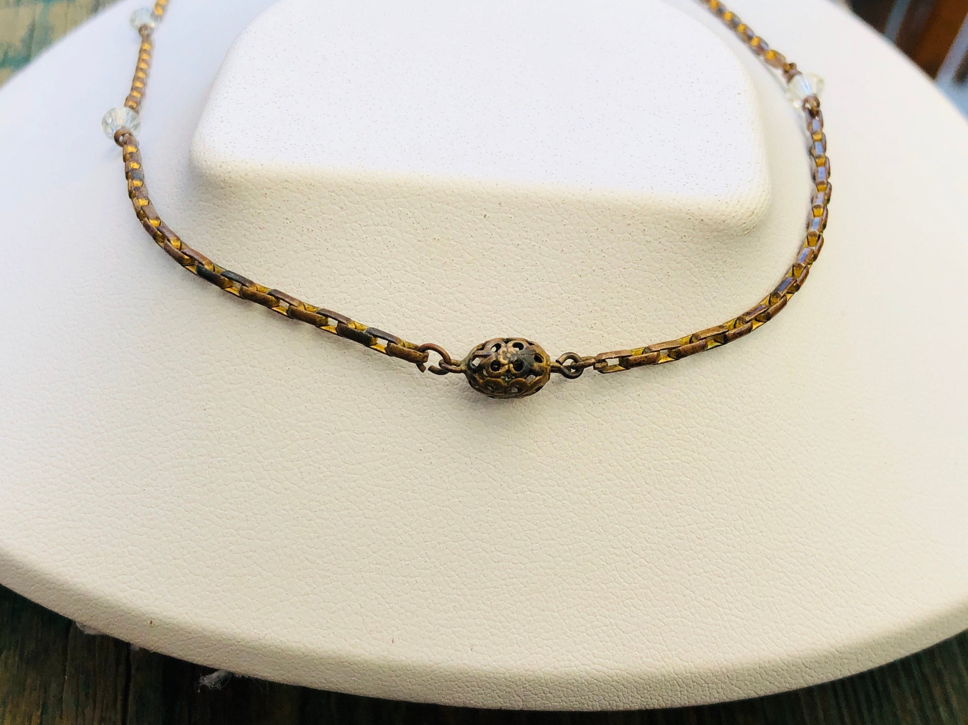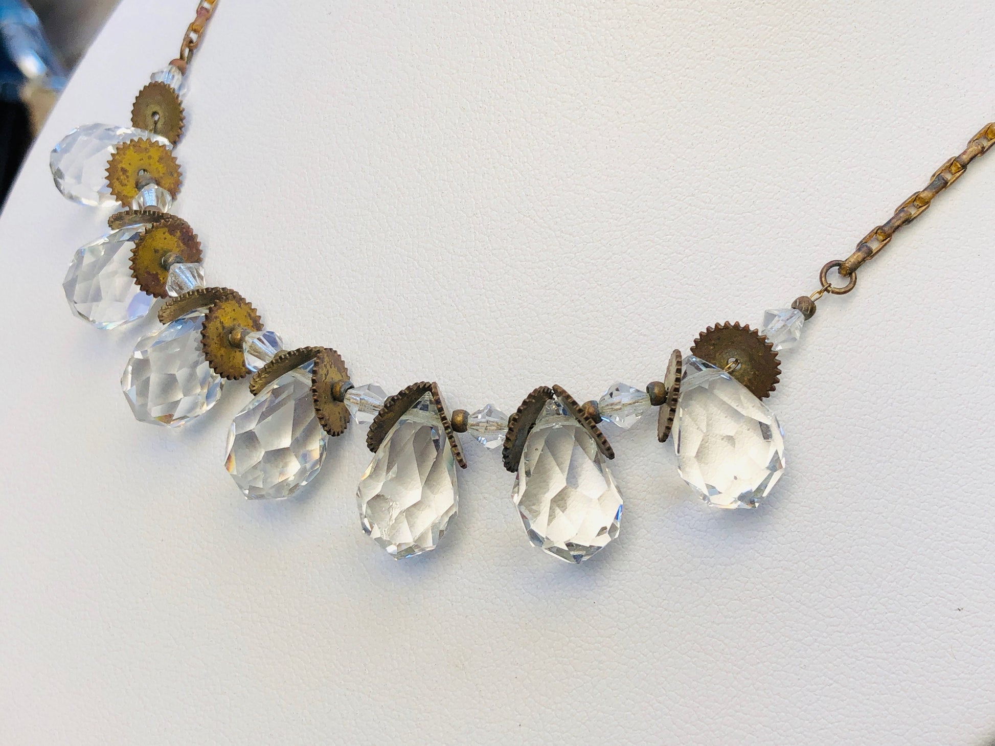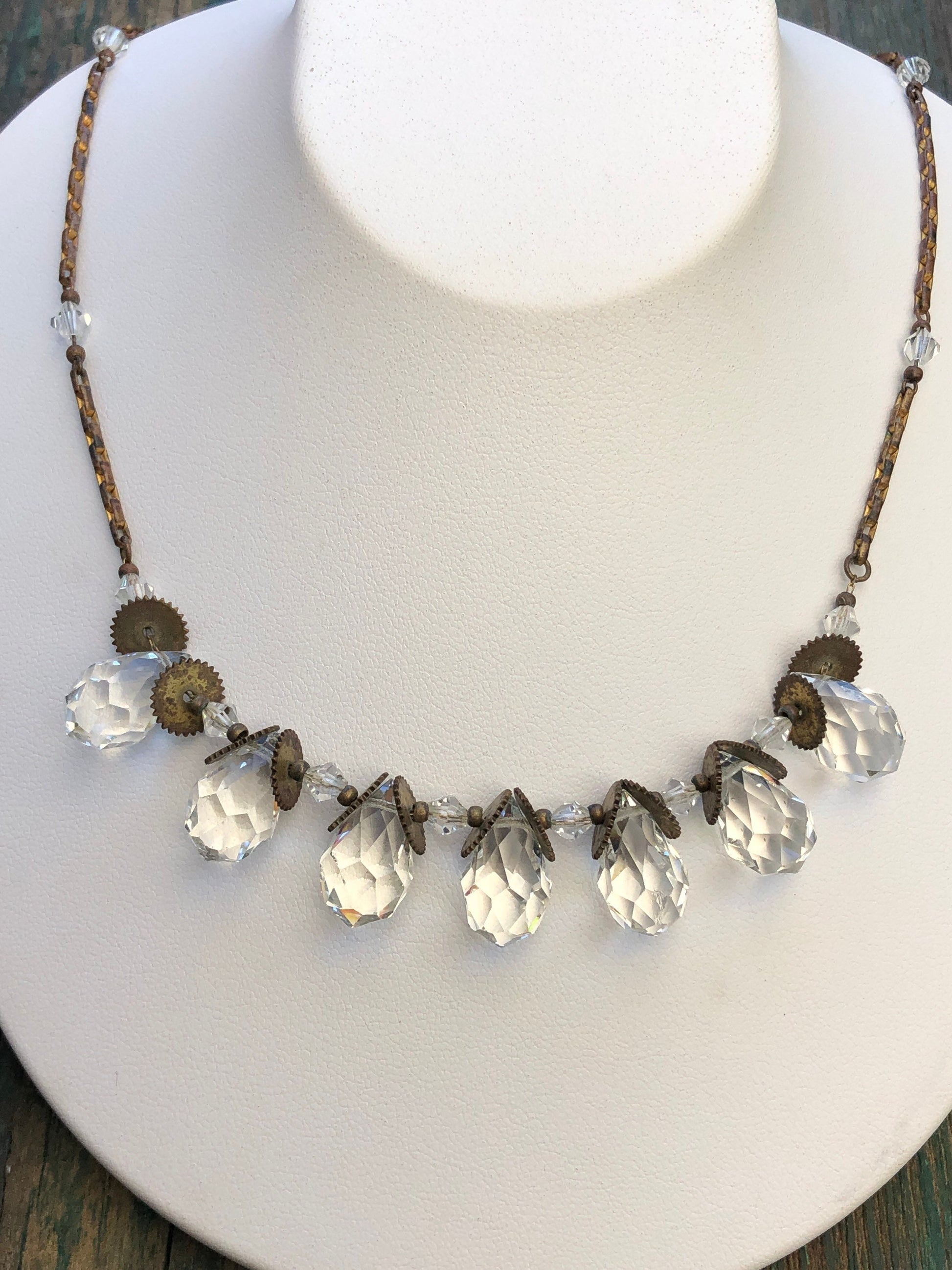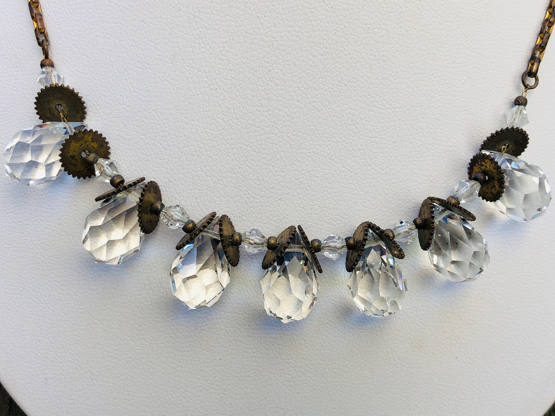 This is a very unique Victorian festoon style necklace. Faceted rock quartz crystals are shaped into briolette drop stones strung on a gilt gold filled brass chain with what I am calling "sawblades" which are saw-blade shaped brass charms inter-dispersed between the quartz briolettes. There are also bi-cone cut quartz crystal beads in between as well as throughout the brass chain with the original filigree clasp that is a modified box clasp. One of the earliest forms of box clasp, the filigree housing has pressure wire closure inside, and is secure.