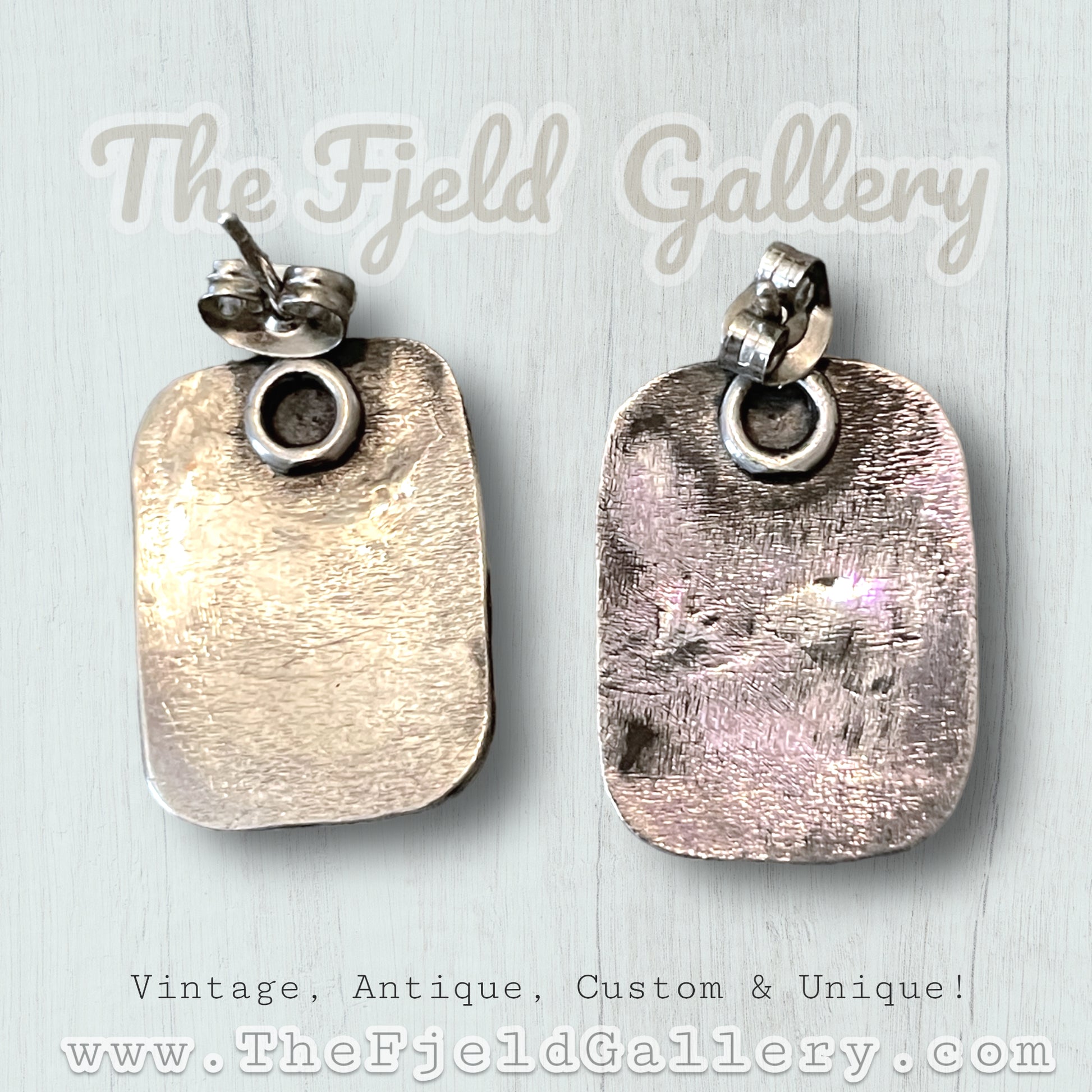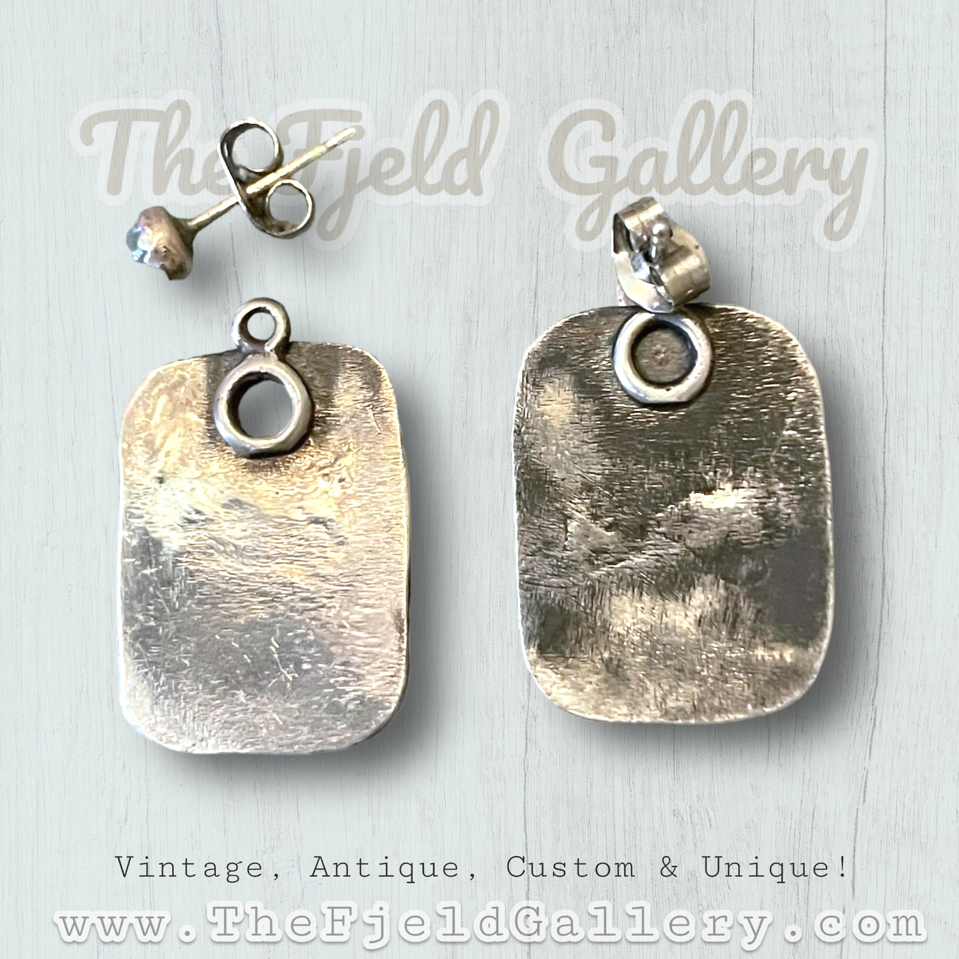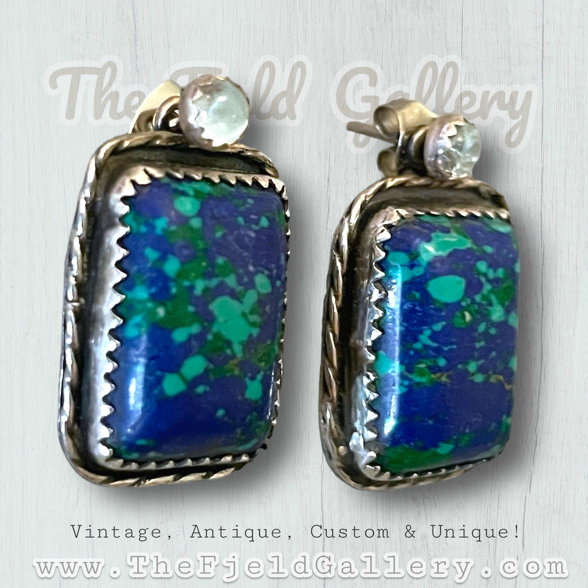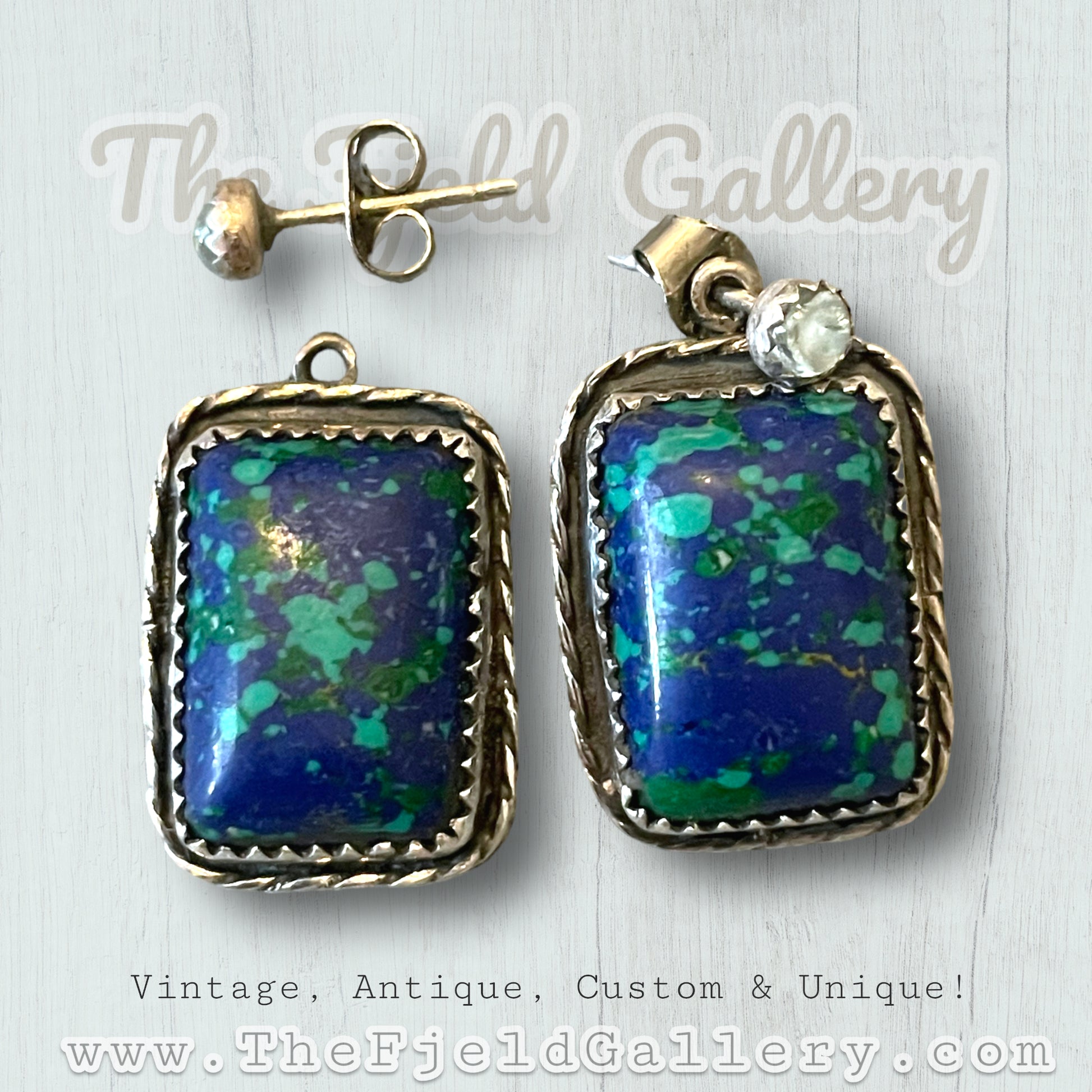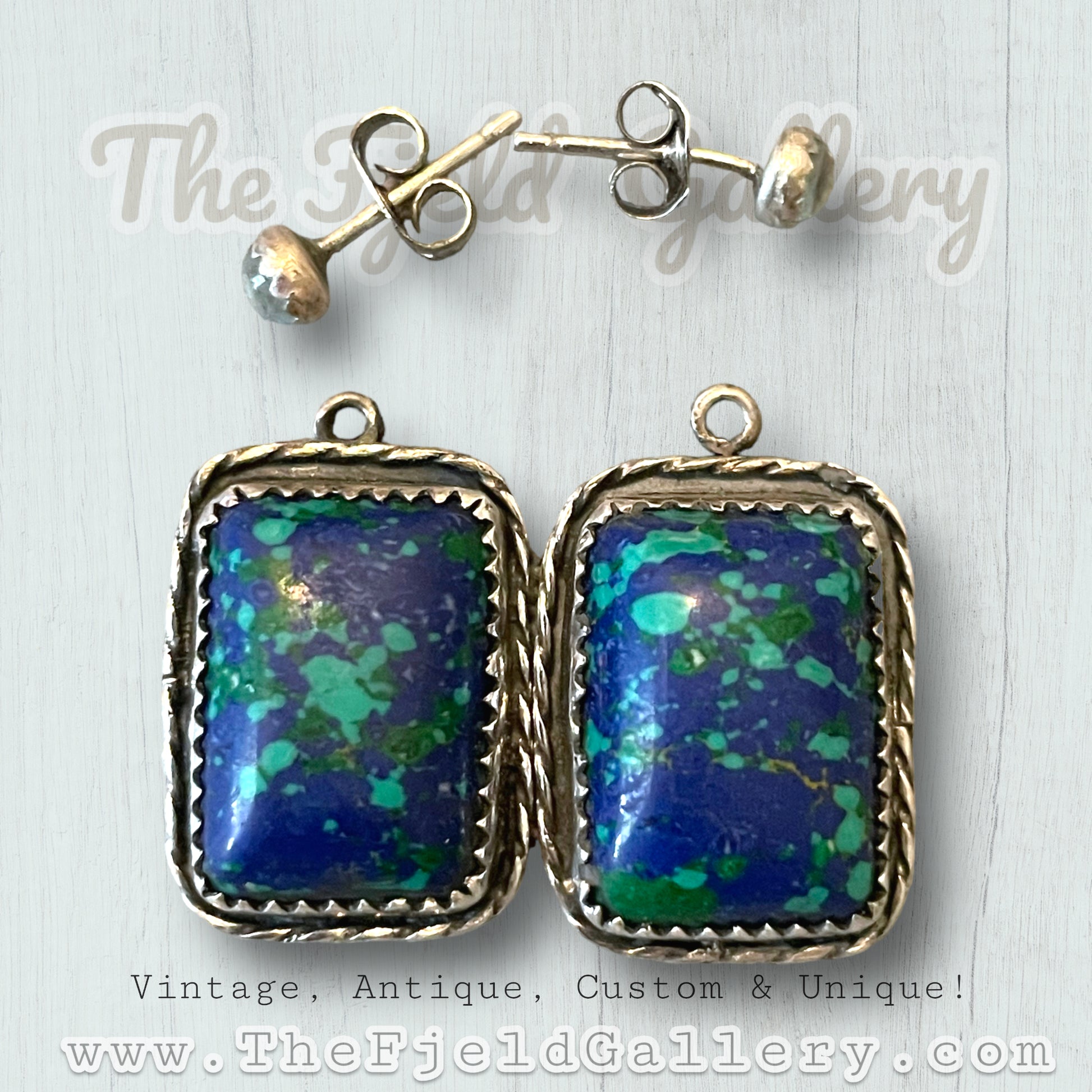 Handmade by myself in my art studio, these sterling silver earrings are a two for one! Serrated bezel set azurite gemstone cabochons, attach to bezel set aquamarine gemstone stud earrings. Can be worn just as aquamarine studs or as the full azurite beauties!