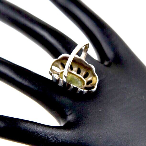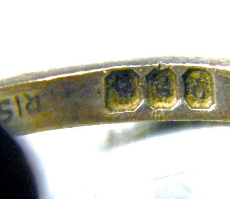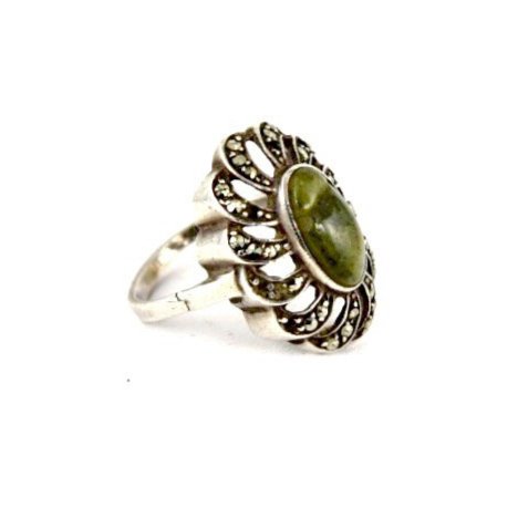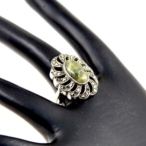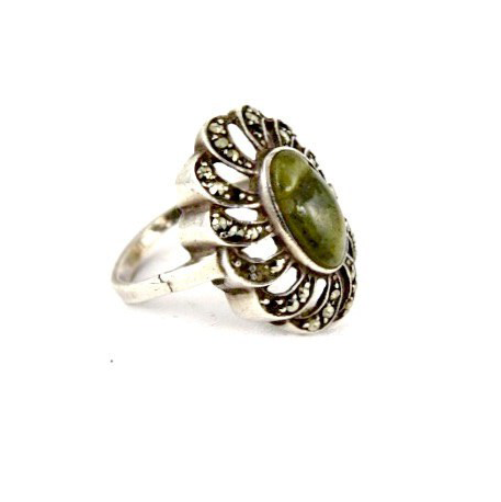 This ring is gorgeous! Very old hallmarks and gorgeous antique patina! This ring has amazing design in 925 sterling silver with a floral, starburst design openwork set with beautiful marcasites and the center stone is a lovely green jade. It does have a small chink in it, but it is not visible from far away when being worn, but up close you can see it, and feel it with your finger when running over it. I have taken this into consideration with the price, however this ring is still very old, and MARKED! It's a wonderful addition to anyone's collection as it is to mine.